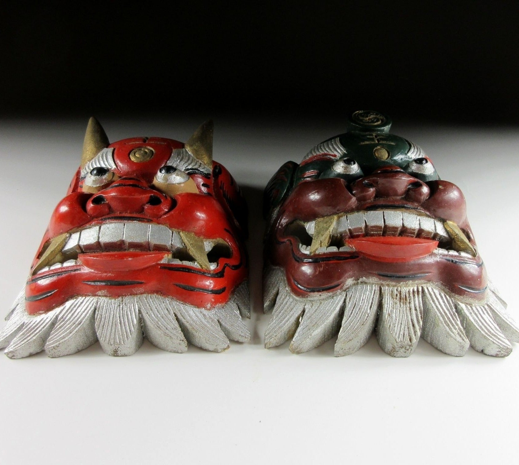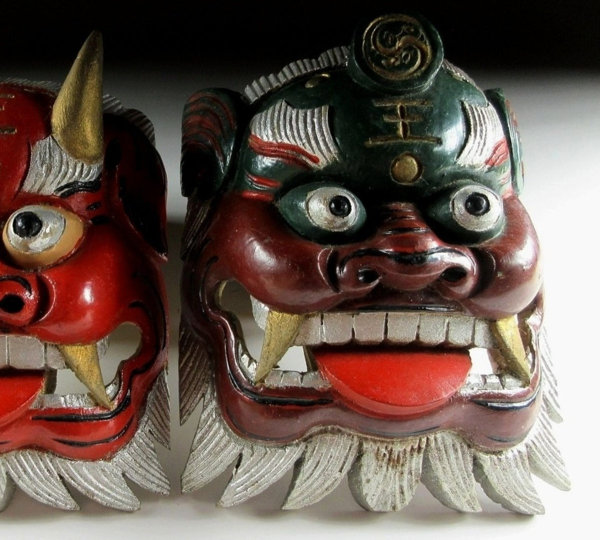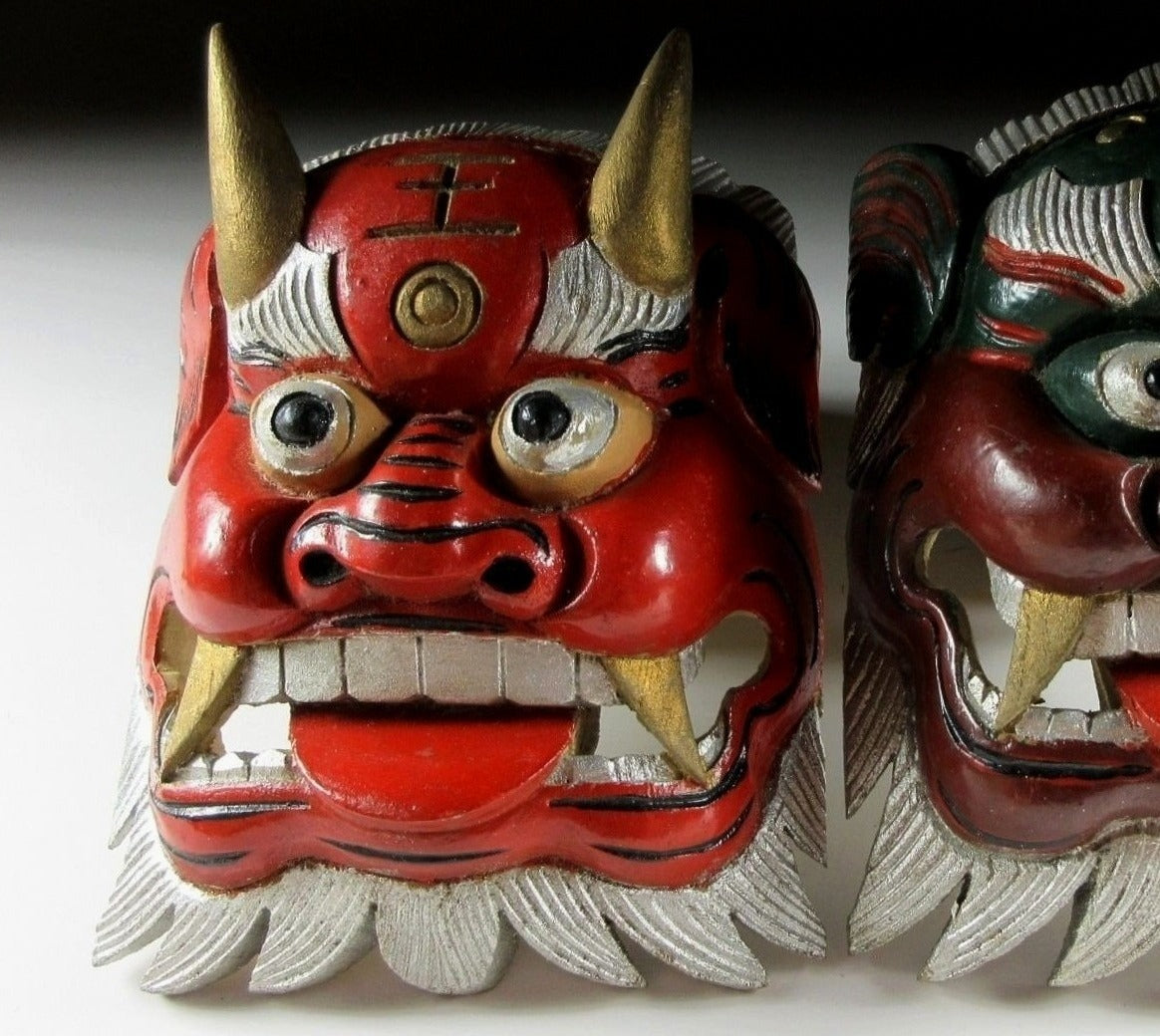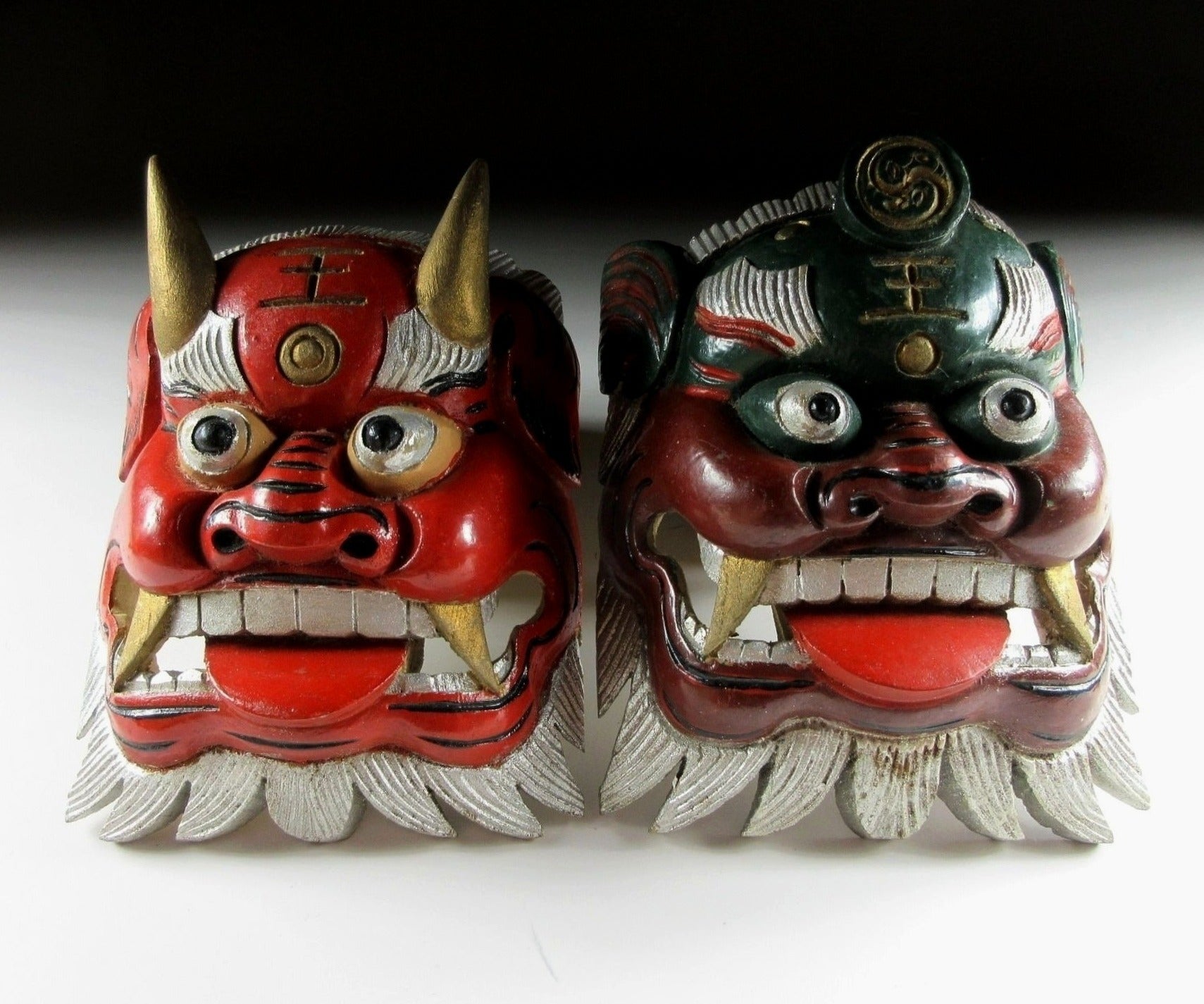 This listing is for a pair of wooden ornaments made around 30 years ago. From the front they look like masks, but they have a solid filled back so they’re actually just an ornament of sorts. Both pieces feature the kanji 王 which is pronounced as ‘o’ and translates as ‘king’. I wasn’t able to find much information but I feel that that may be connected to bugaku, bugaku are dances from legendary Chinese warrior kings which have been performed throughout Japan since the Heian period. The green ornament has a royal crest above the 王 kanji; this twin tomoe crest is used at bugaku performances. There are no hooks or string, and the bearded part on the bottom is not flat so they do not stand up on their own. It’s best to pop them on a shelf leaning against a wall.