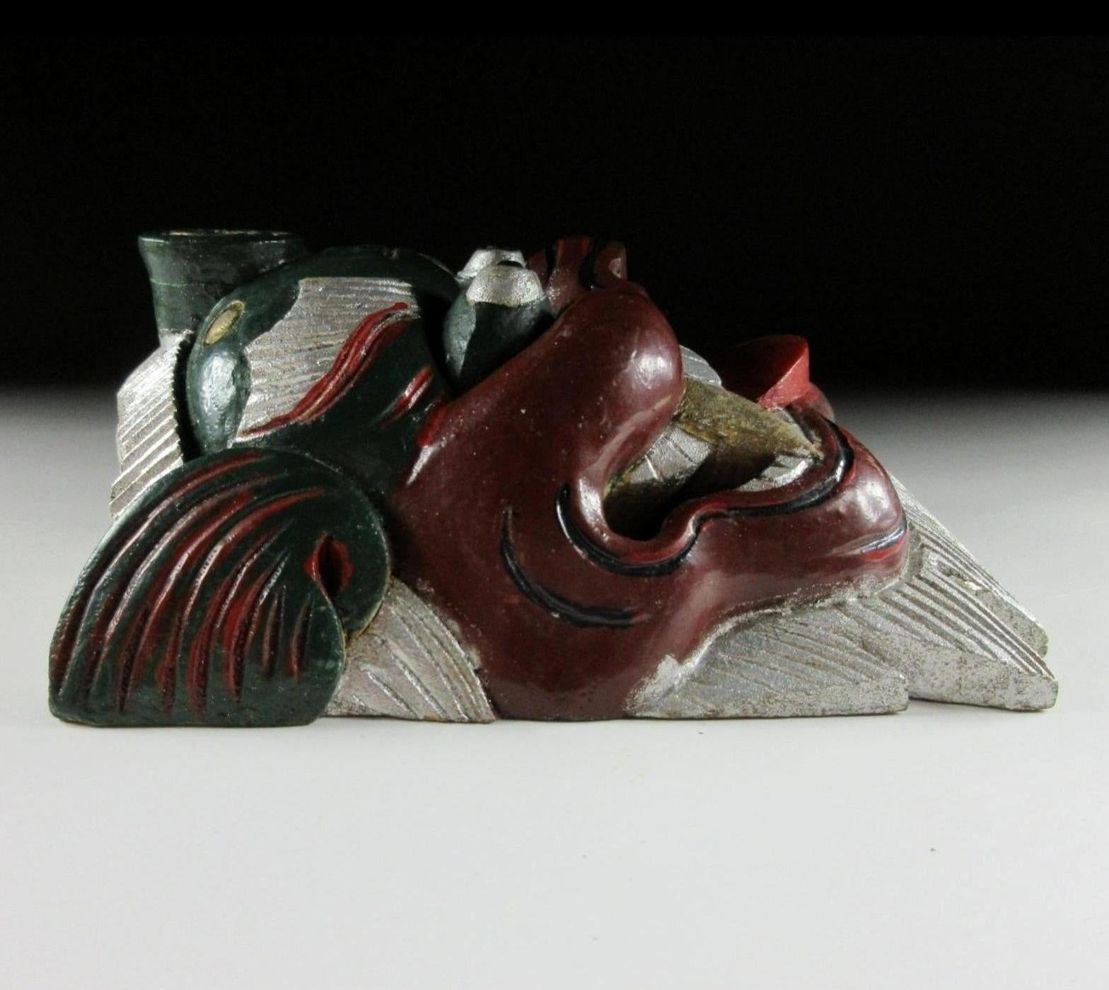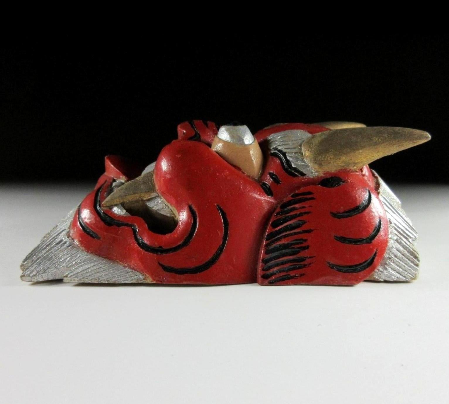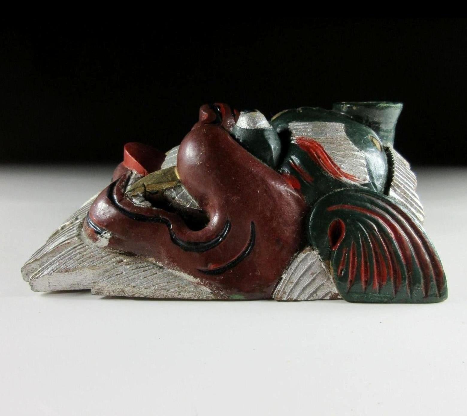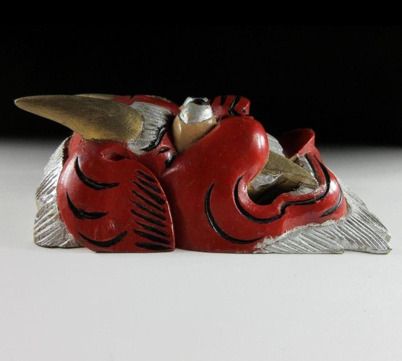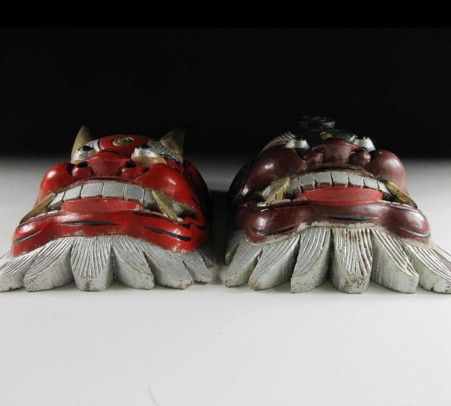 This listing is for a pair of wooden ornaments made around 30 years ago. From the front they look like masks, but they have a solid filled back so they’re actually just an ornament of sorts. Both pieces feature the kanji 王 which is pronounced as ‘o’ and translates as ‘king’. I wasn’t able to find much information but I feel that that may be connected to bugaku, bugaku are dances from legendary Chinese warrior kings which have been performed throughout Japan since the Heian period. The green ornament has a royal crest above the 王 kanji; this twin tomoe crest is used at bugaku performances. There are no hooks or string, and the bearded part on the bottom is not flat so they do not stand up on their own. It’s best to pop them on a shelf leaning against a wall.