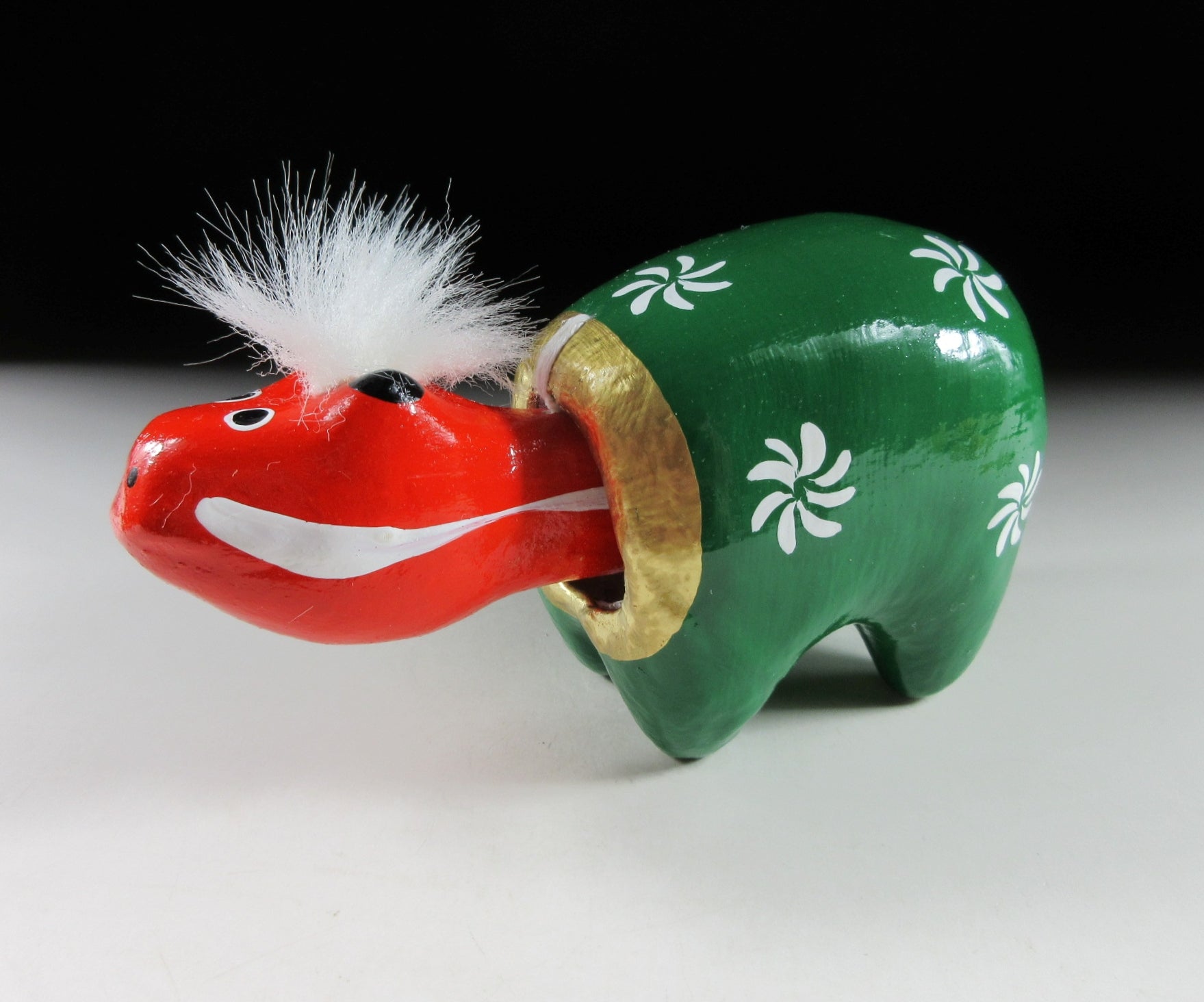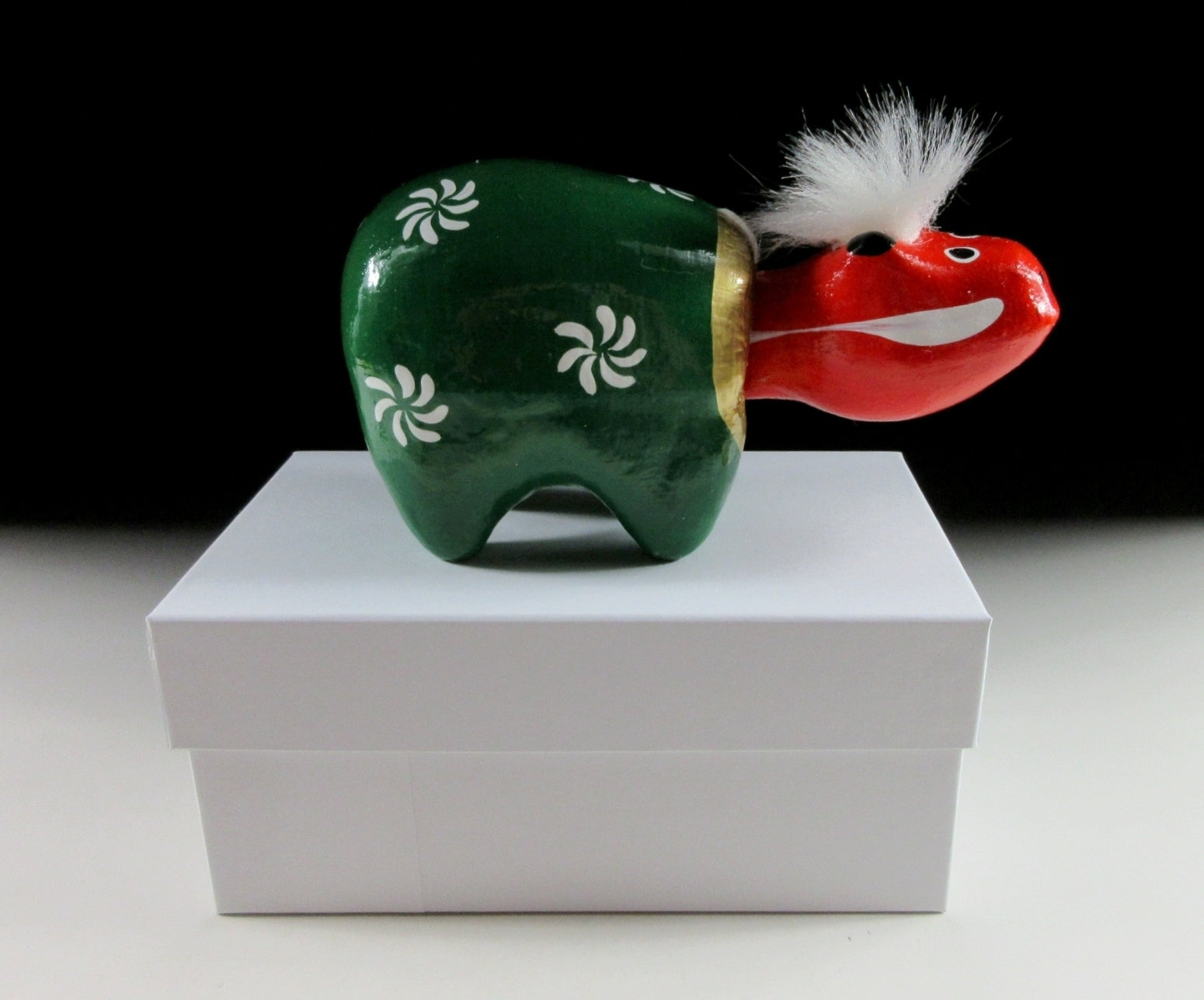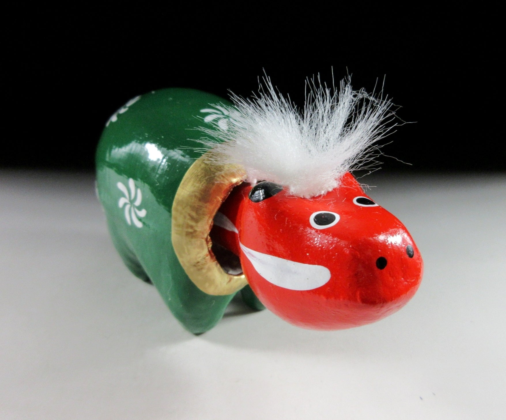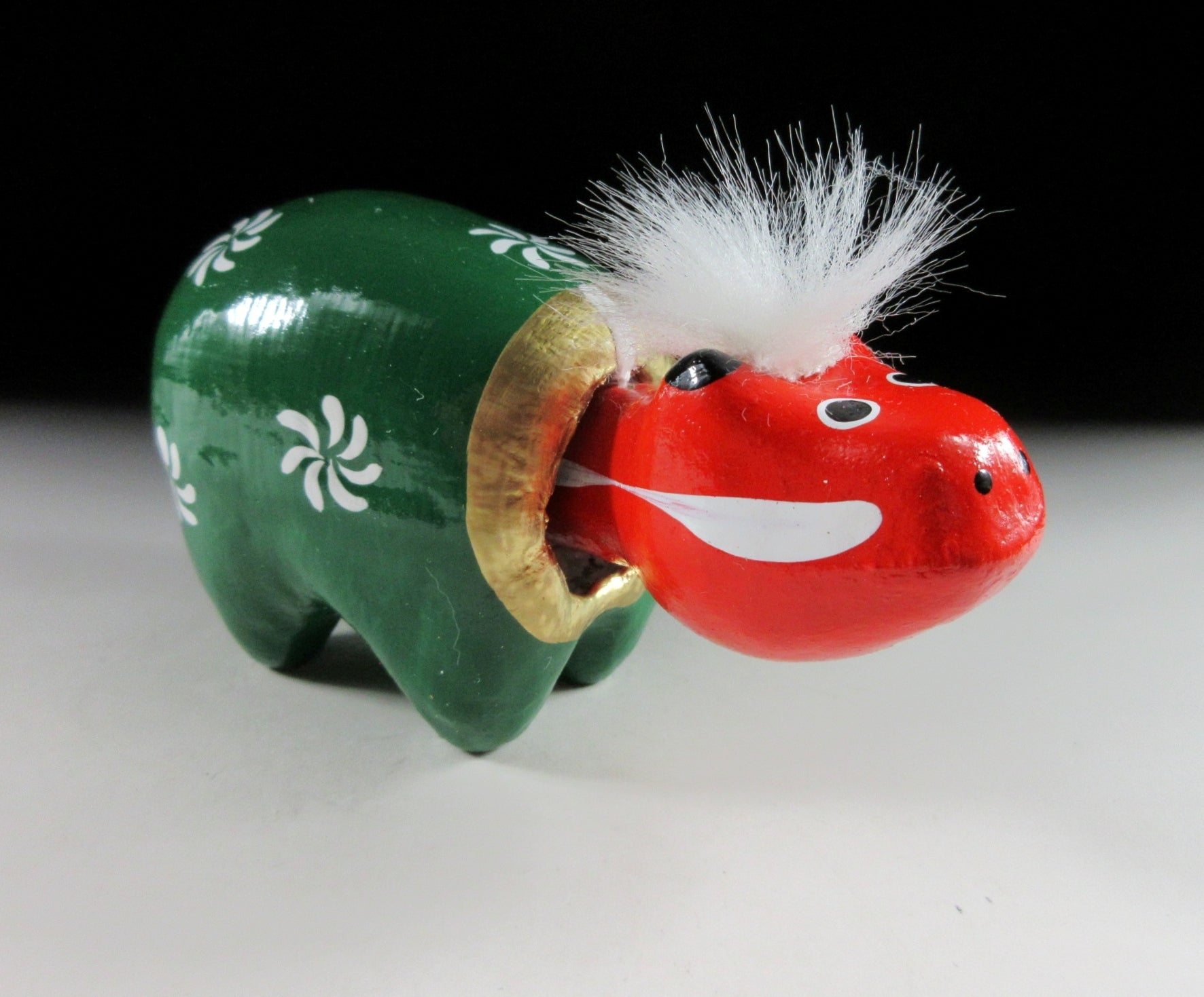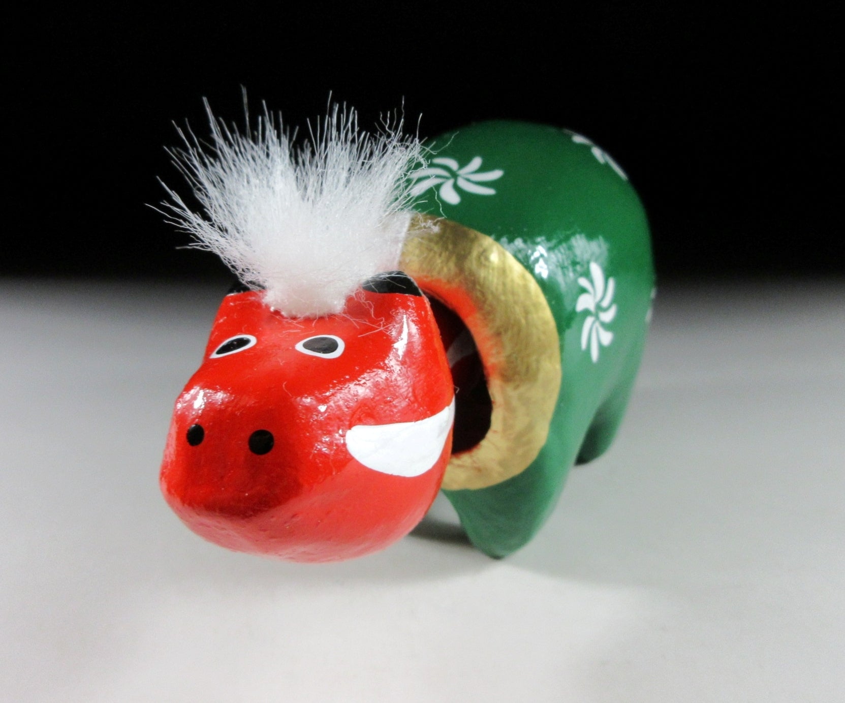 This listing is for a hand-painted shishimai akabeko made by Hanjiro in Fukushima. An akabeko is a toy made from papier-mâché that’s shaped and painted to look like a red oxen. The body is hollow and the head bobs up and down when moved. Akabeko originated in the Aizu region of Fukushima, and is probably one of the most recognizable folk crafts from all of Tohoku. The red colour is believed to be lucky and auspicious for warding off smallpox and other childhood illnesses. This particular beko is a combination of an akabeko with a shishigashira. During New Year men wear shishigashira masks and perform a shishimai dance to purify the spirit of those he ‘bites’ on the head, and to drive out evil spirits. This fellow is double the luck and ever so cute with its white tuft of hair! It comes with its original paper storage box.