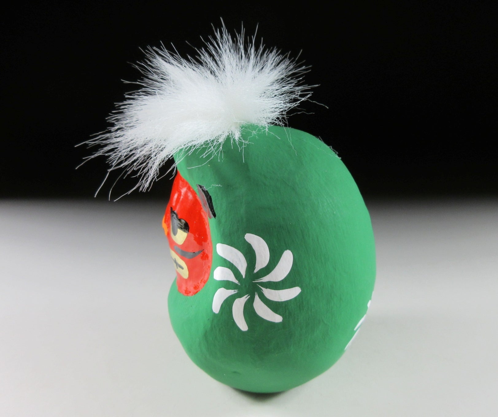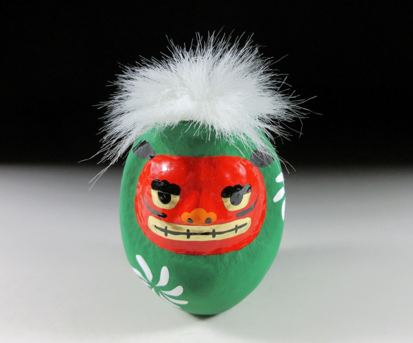 This listing is for a small hand-painted Daruma made by Hanjiro in Fukushima. Daruma is a popular talisman of good luck, especially during New Year. This Daruma is made of papier-mâché and decorated to resemble a shishigashira. During New Year men wear shishigashira masks and perform a shishimai dance to purify the spirit of those he ‘bites’ on the head, and to drive out evil spirits. It comes with a plastic storage box and a Japanese language profile paper.