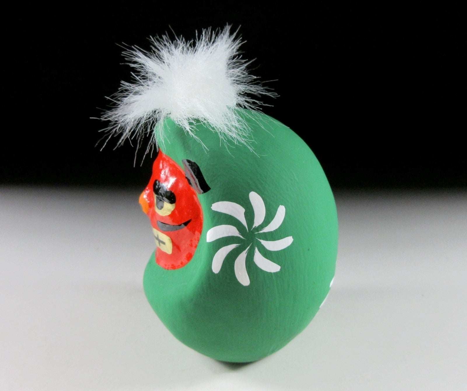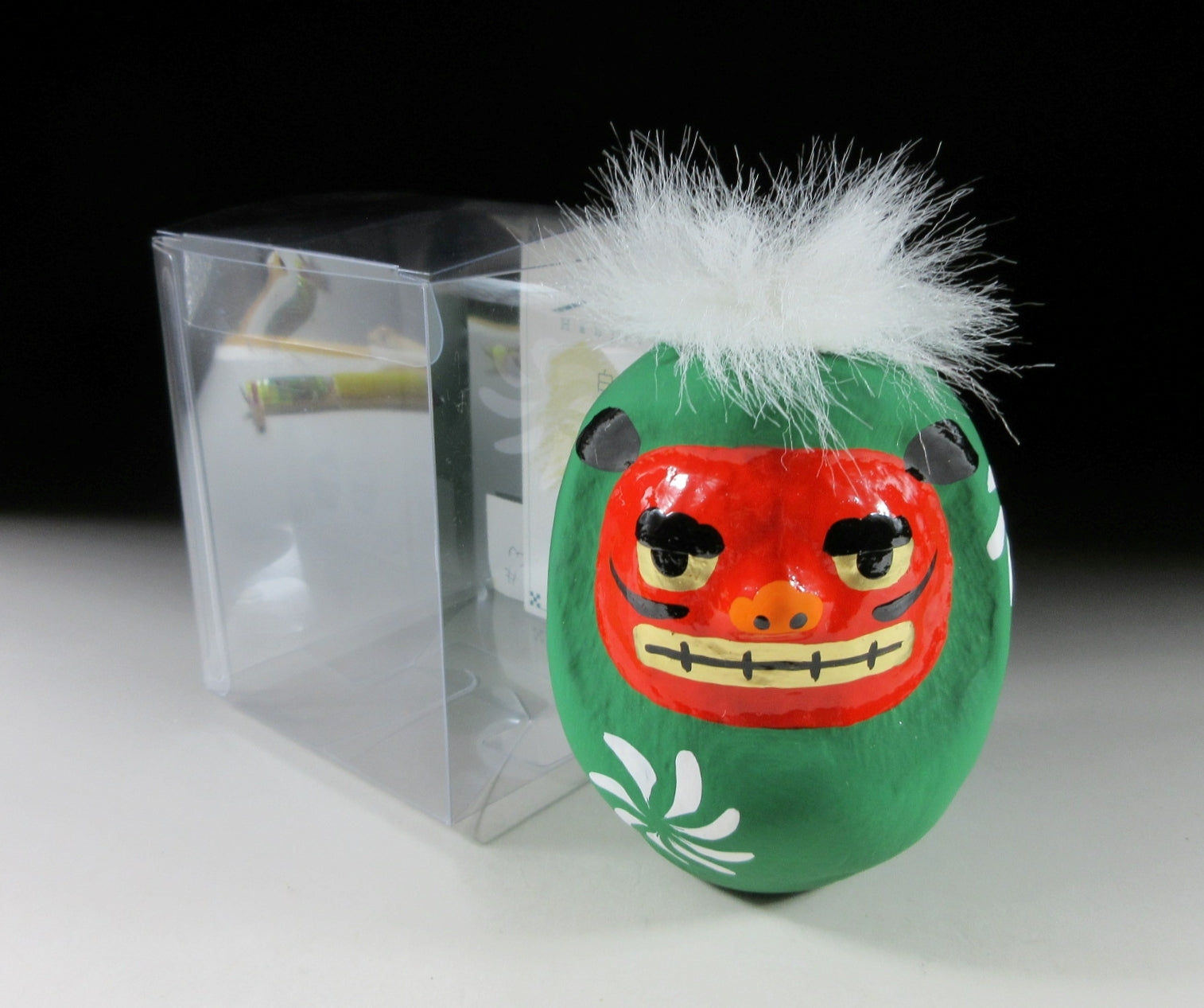 This listing is for a small hand-painted Daruma made by Hanjiro in Fukushima. Daruma is a popular talisman of good luck, especially during New Year. This Daruma is made of papier-mâché and decorated to resemble a shishigashira. During New Year men wear shishigashira masks and perform a shishimai dance to purify the spirit of those he ‘bites’ on the head, and to drive out evil spirits. It comes with a plastic storage box and a Japanese language profile paper.