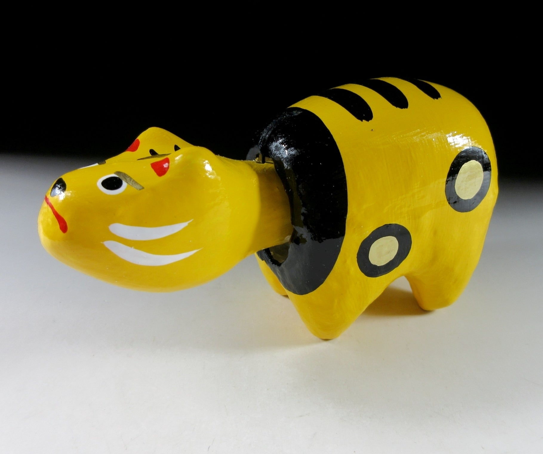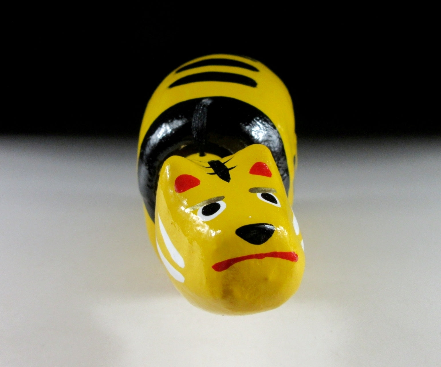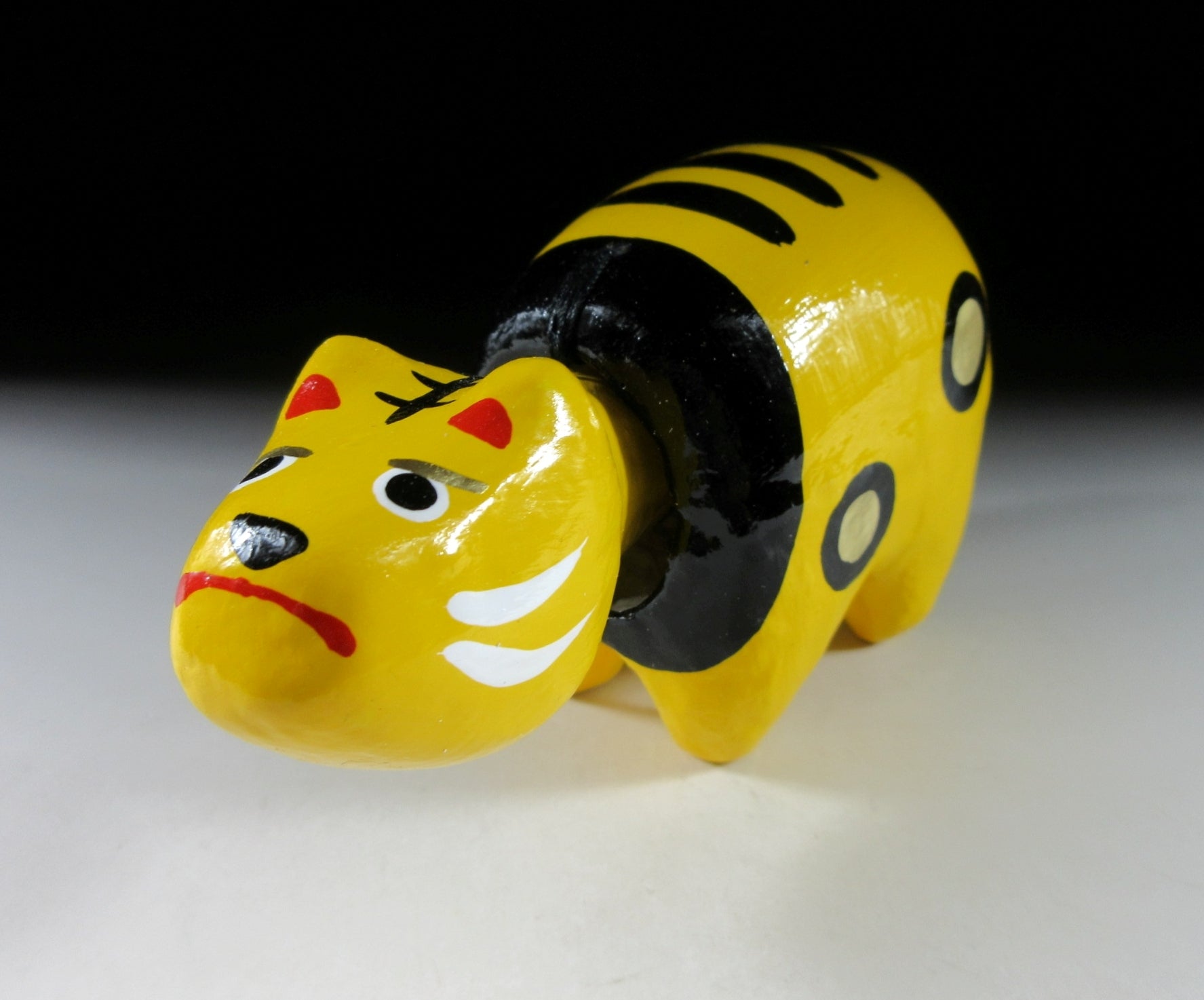 This listing is for a hand-painted tiger akabeko made by Hanjiro in Fukushima. An akabeko is a toy made from papier-mâché that’s shaped and painted to look like a red oxen. The body is hollow and the head bobs up and down when moved. Akabeko originated in the Aizu region of Fukushima, and is probably one of the most recognizable folk crafts from all of Tohoku. The red colour is believed to be lucky and auspicious for warding off smallpox and other childhood illnesses. This particular beko is a combination of an akabeko with a hariko tiger. Hariko tigers were traditionally seen as good luck charms in the hope that one’s children would grow up healthy. The combination with the akabeko is double the luck and an ideal gift for those who have recently welcomed a child. It comes with its original paper storage box.