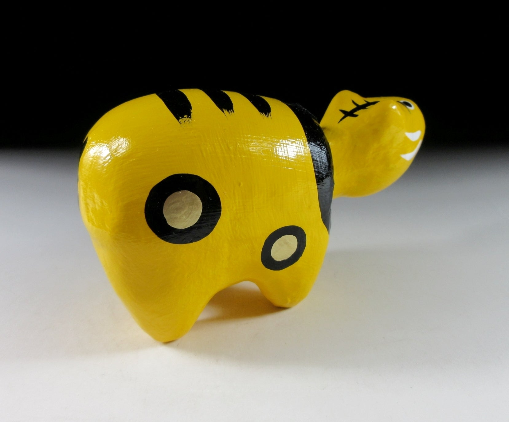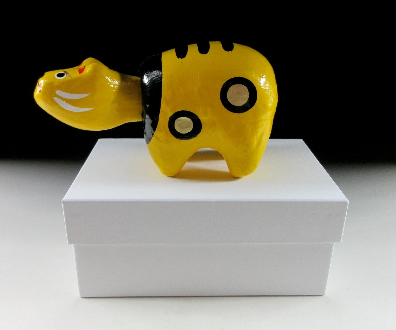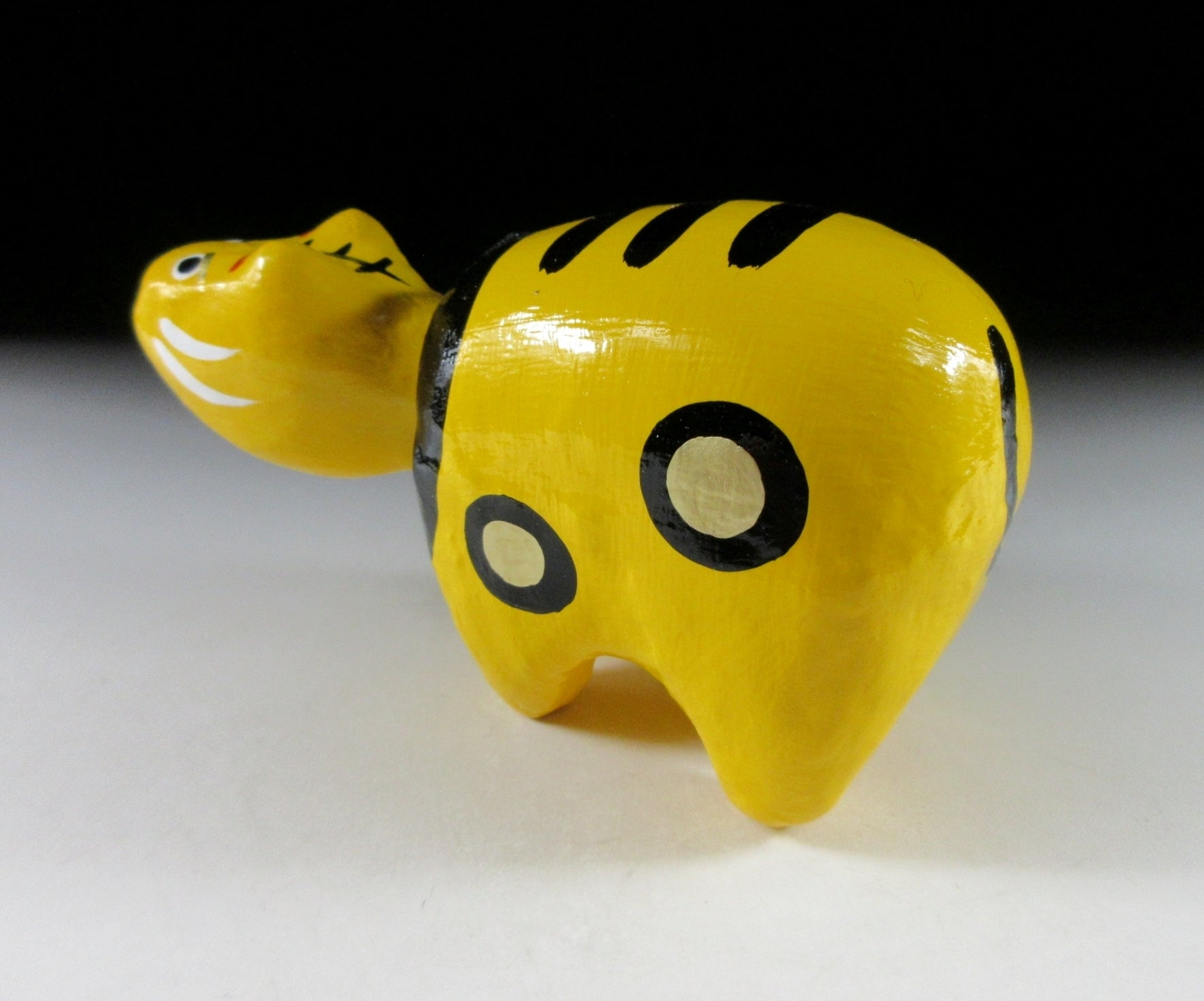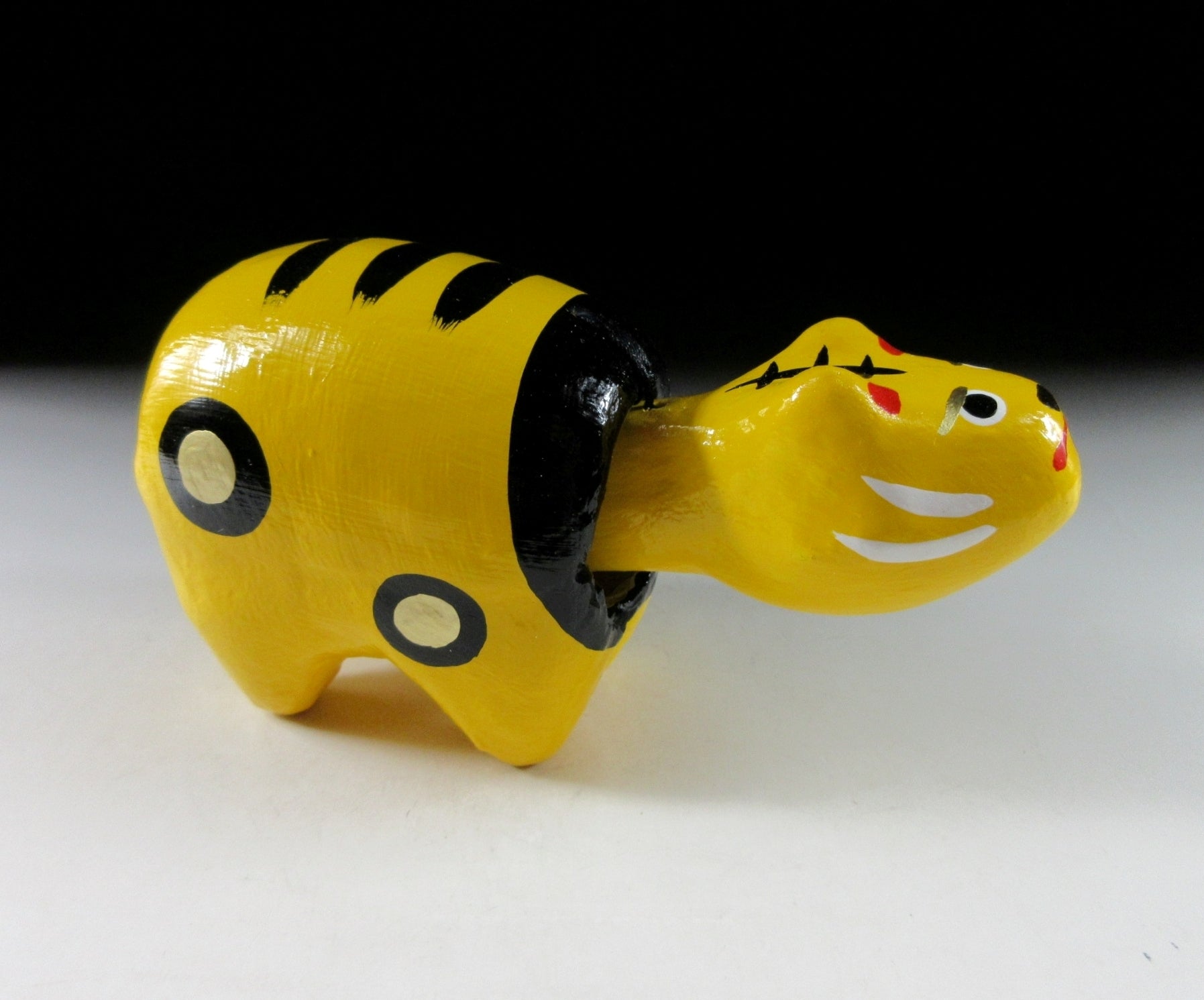 This listing is for a hand-painted tiger akabeko made by Hanjiro in Fukushima. An akabeko is a toy made from papier-mâché that’s shaped and painted to look like a red oxen. The body is hollow and the head bobs up and down when moved. Akabeko originated in the Aizu region of Fukushima, and is probably one of the most recognizable folk crafts from all of Tohoku. The red colour is believed to be lucky and auspicious for warding off smallpox and other childhood illnesses. This particular beko is a combination of an akabeko with a hariko tiger. Hariko tigers were traditionally seen as good luck charms in the hope that one’s children would grow up healthy. The combination with the akabeko is double the luck and an ideal gift for those who have recently welcomed a child. It comes with its original paper storage box.