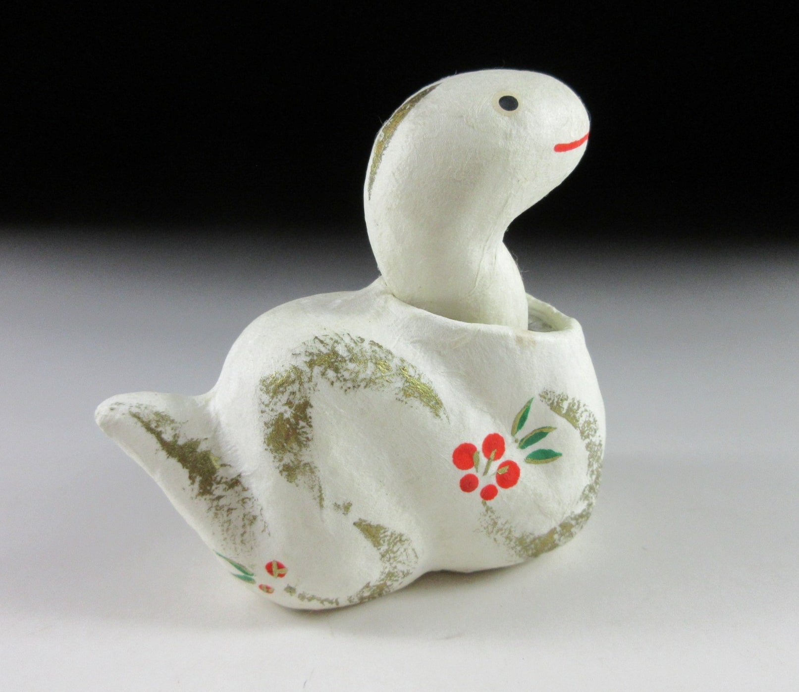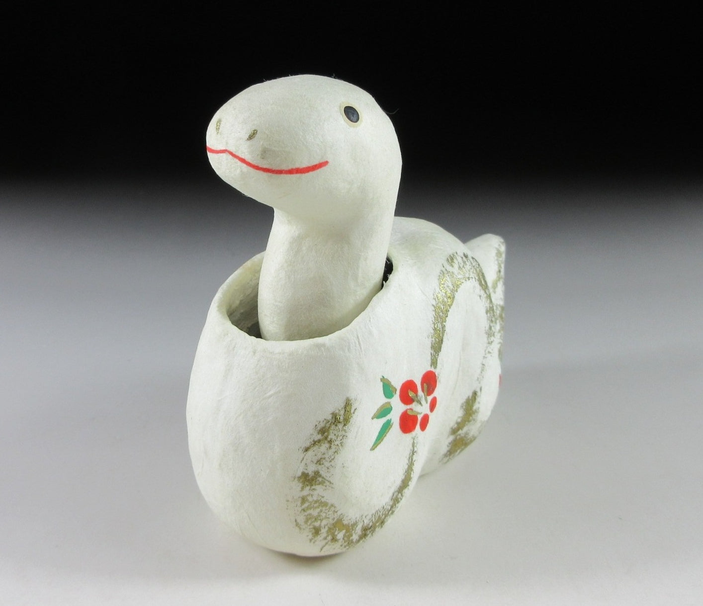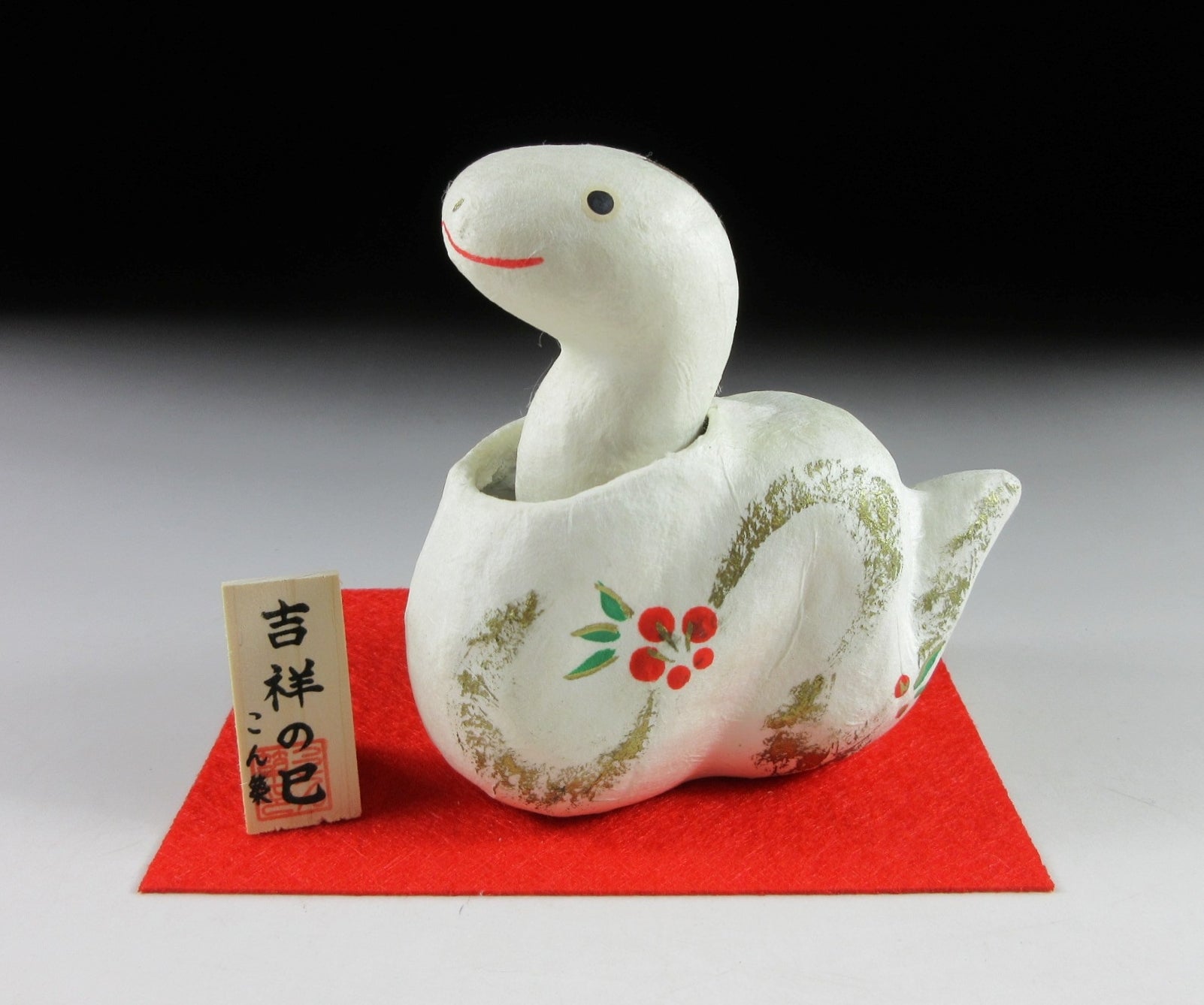 This listing is for a small bobble head snake made to commemorate the Year of the Snake in 2025. White snakes are considered to be good luck in Japan, and are a symbol for Benten, the Japanese goddess of wealth. It is made of papier-mâché and the exterior is coated in washi paper. The small paper pasted on its body reads as ‘blessing’. It comes complete with a little wooden plaque as well as a red ceremonial mat made of thin felt. It also comes with two Japanese language blessings / information about the twelve zodiac animals, and a paper storage box so it can be stored until the next Year of the Snake.