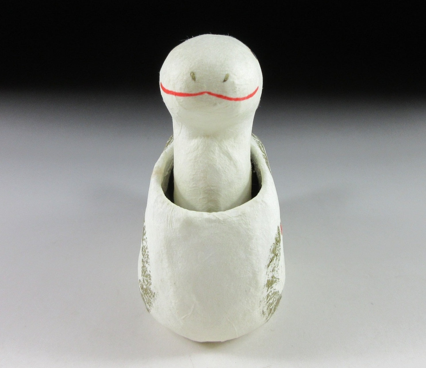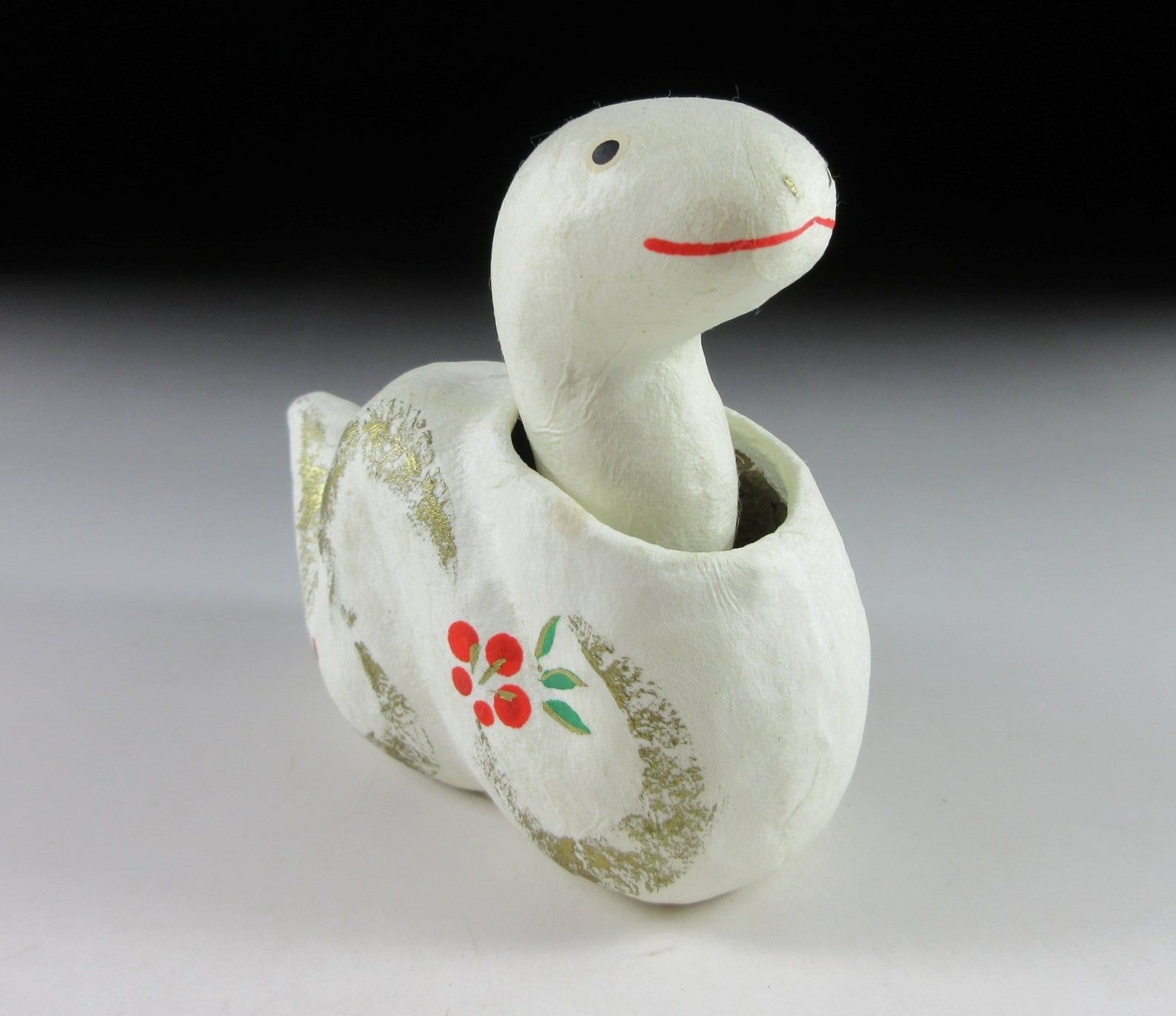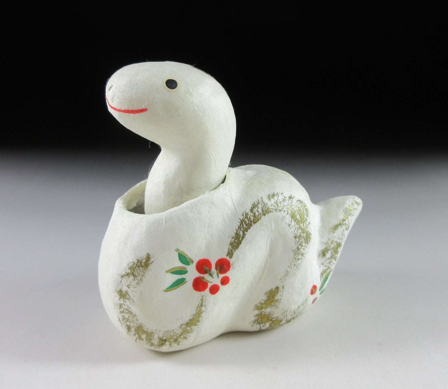This listing is for a small bobble head snake made to commemorate the Year of the Snake in 2025. White snakes are considered to be good luck in Japan, and are a symbol for Benten, the Japanese goddess of wealth. It is made of papier-mâché and the exterior is coated in washi paper. The small paper pasted on its body reads as ‘blessing’. It comes complete with a little wooden plaque as well as a red ceremonial mat made of thin felt. It also comes with two Japanese language blessings / information about the twelve zodiac animals, and a paper storage box so it can be stored until the next Year of the Snake.