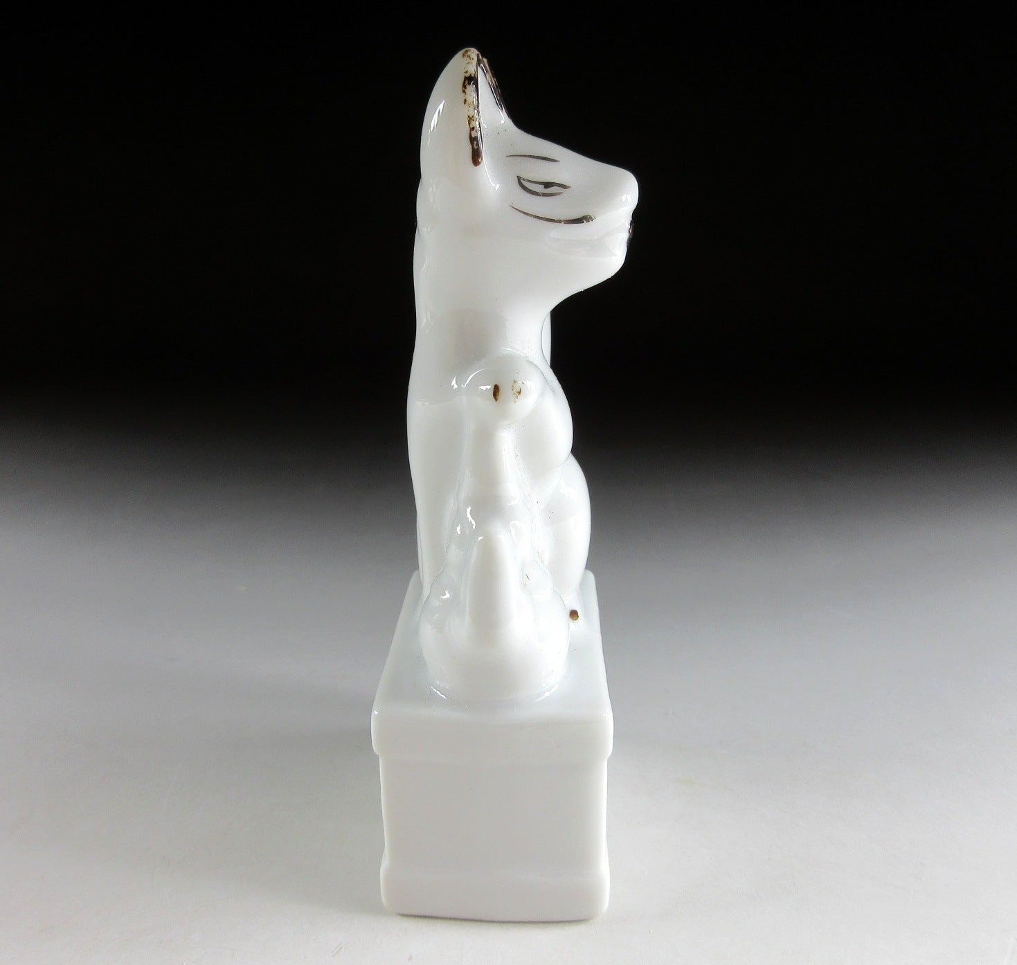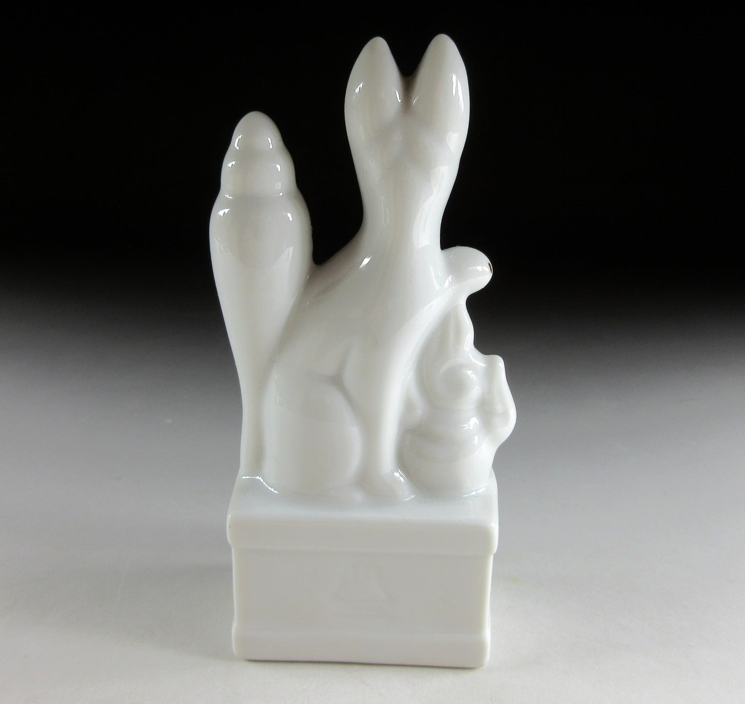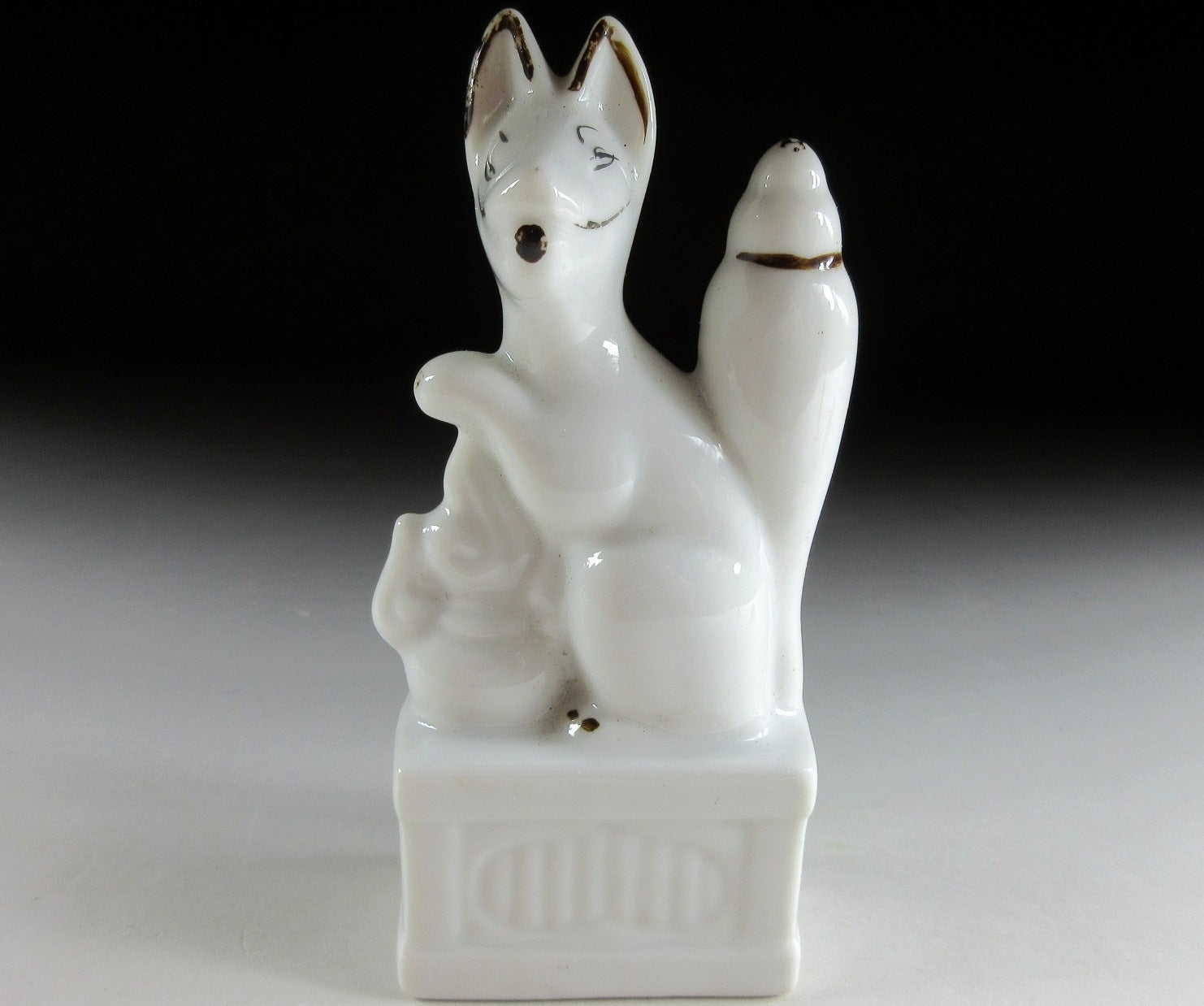 This listing is for a vintage porcelain ware kitsune figurine made about 20-30 years ago. Kitsune are scared foxes with supernatural powers. They act as messengers for Inari and possess the ability to shape-shift and trick people. The fox in this listing is the type commonly found at shrines flanking small torii, or safeguarding the family altar. In rural areas they can be found high on the wall sitting on a shrine shelf, particularly in older houses.