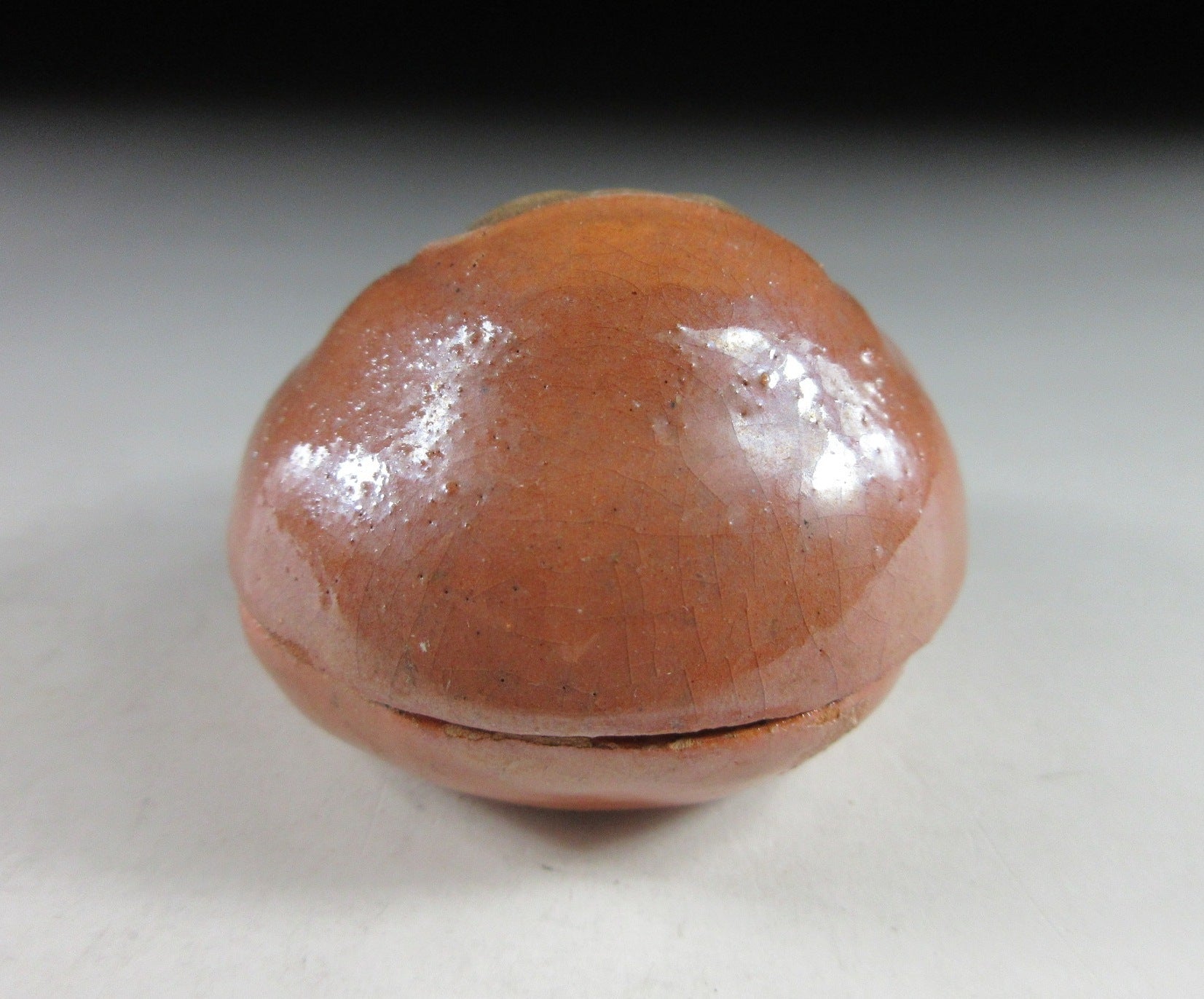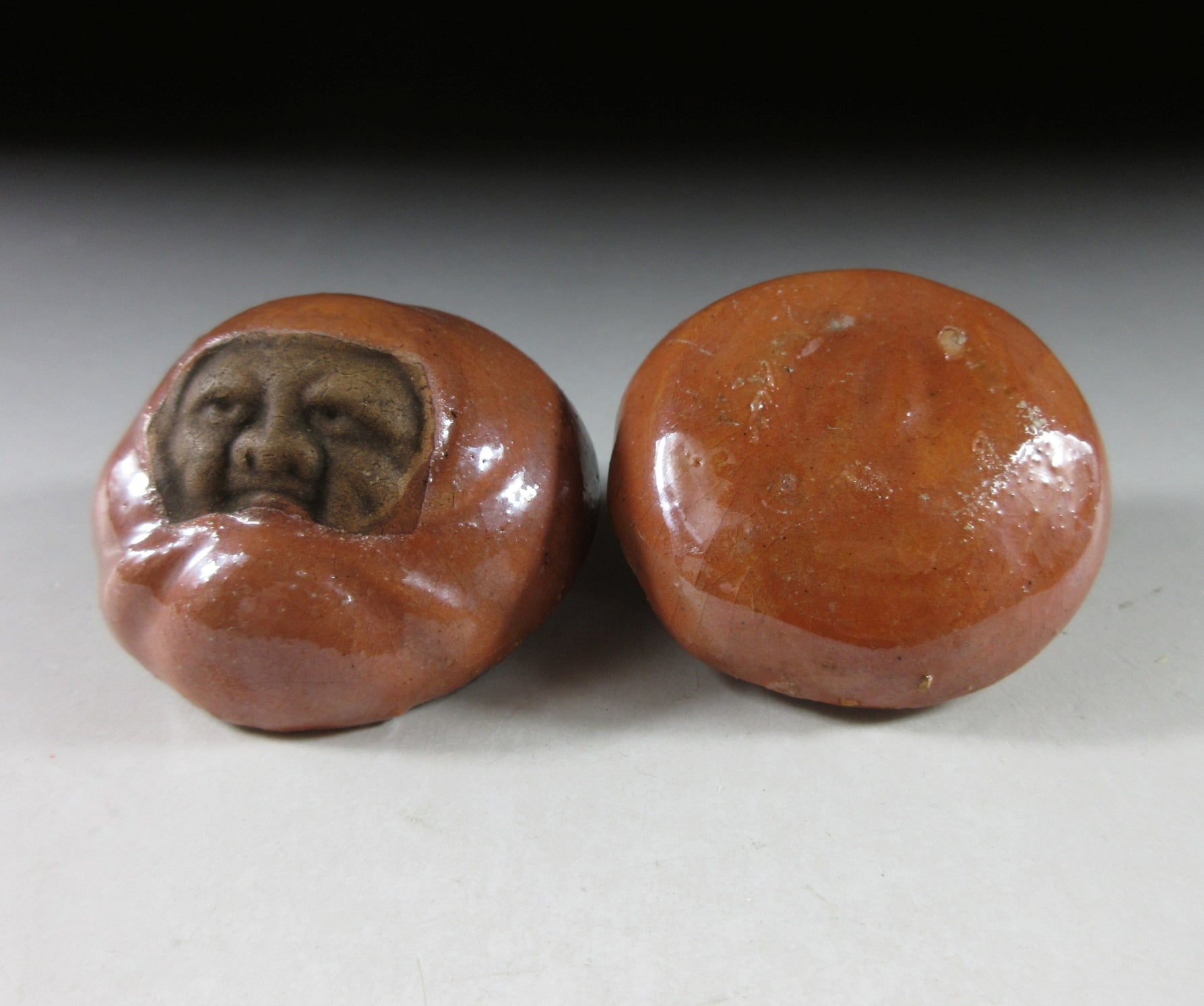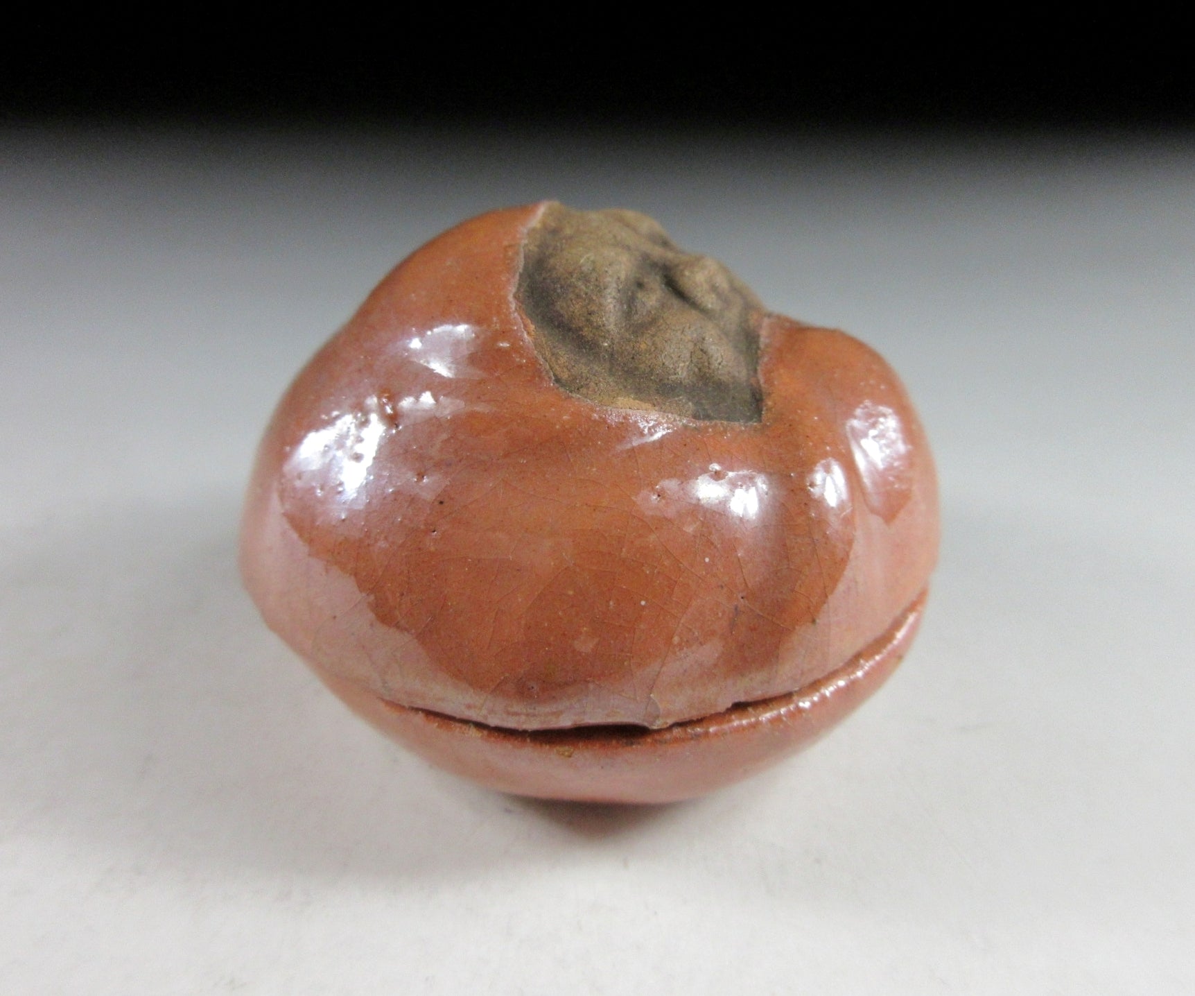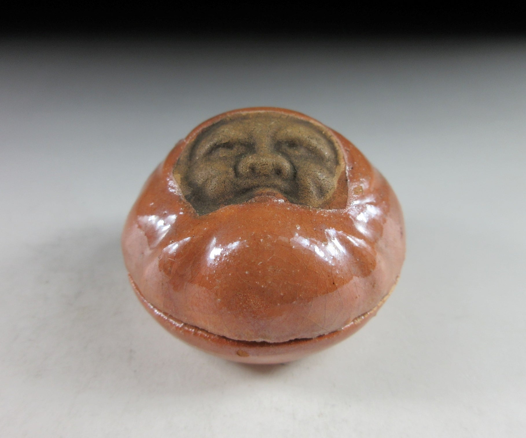 This listing is for a raku-ware kogo made around 50-60 years ago. It has been moulded into the shape of a Daruma and glazed a warm shade of red. Daruma has become a familiar and beloved figure with an important place in religion, art and folk culture. In Japan he is widely seen as a symbol of good fortune so he is a popular choice for teaware during special times of the year like New Year. Its size and shape is suitable for holding both woodchip and kneaded incense, though pottery kogo are typically used for kneaded incense during the cooler months.