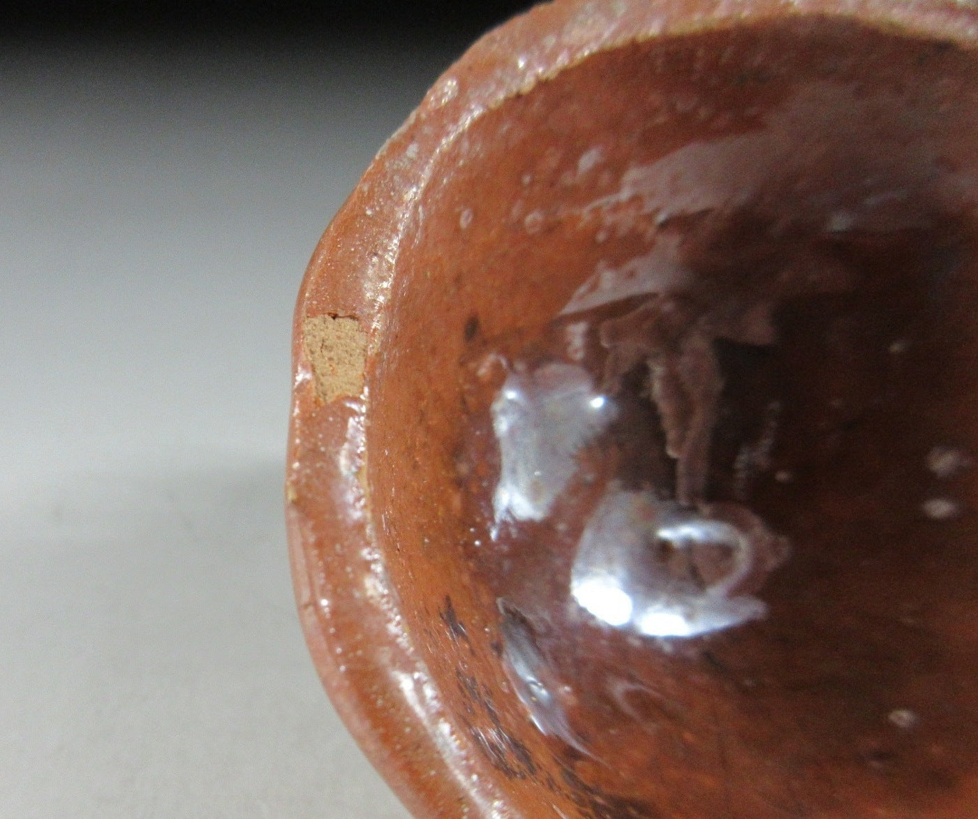 It has a spot of chipped glaze, please note that the dark colour on the interior is part of the glaze.