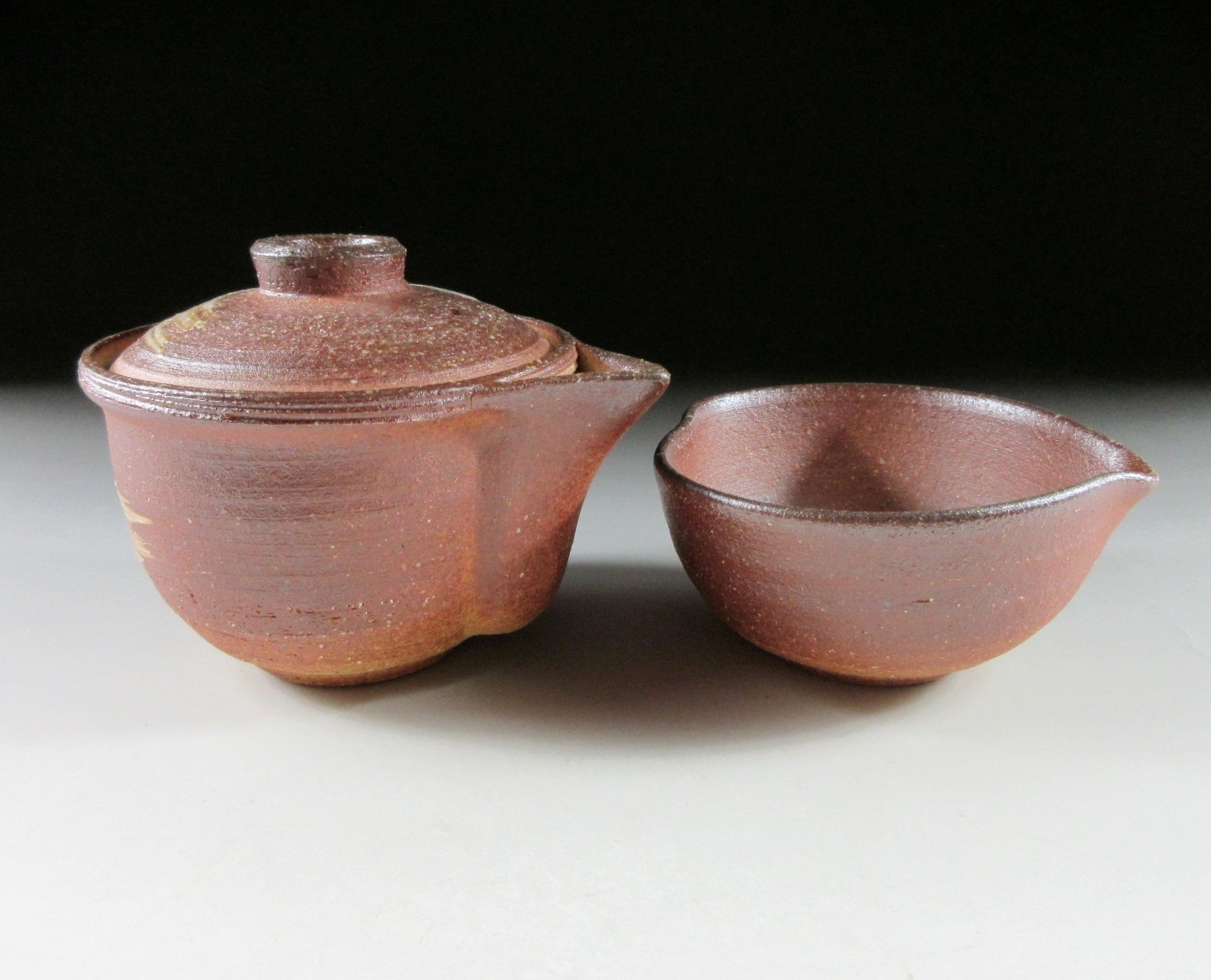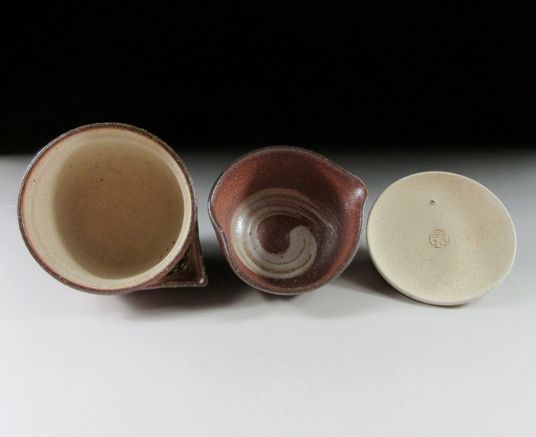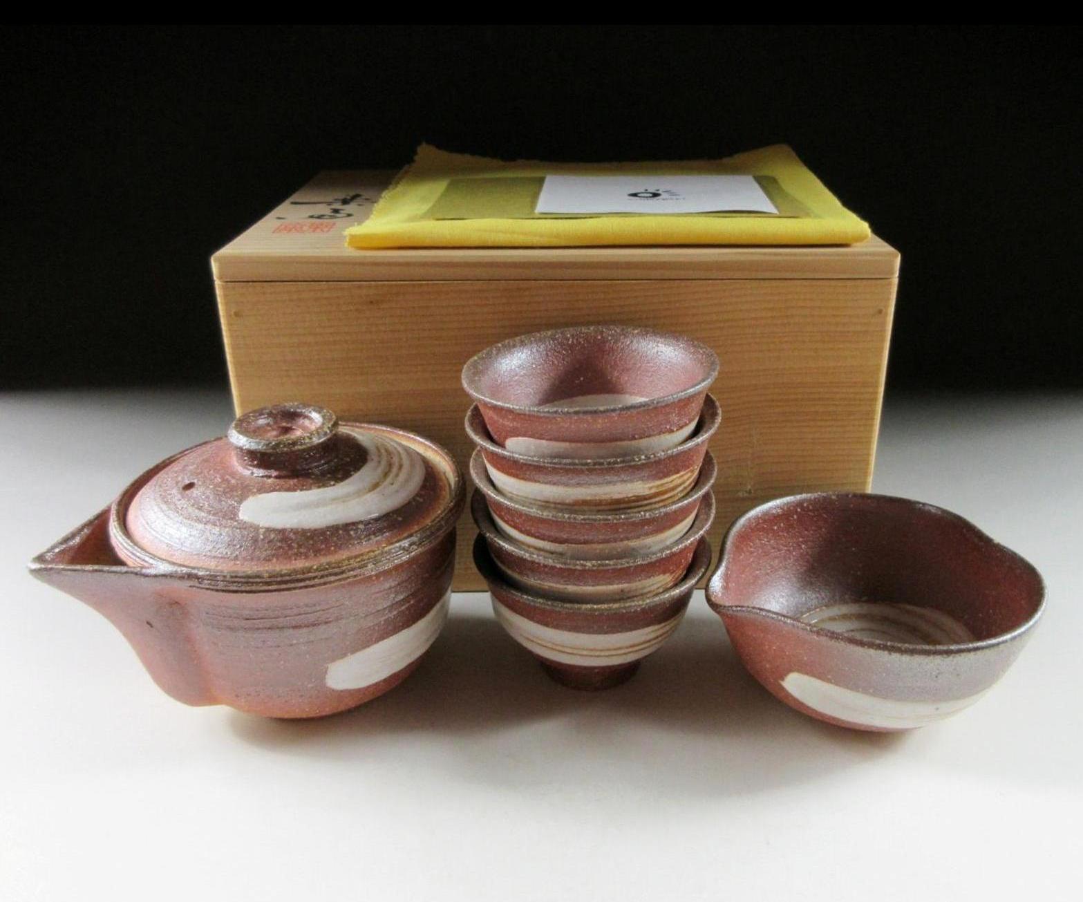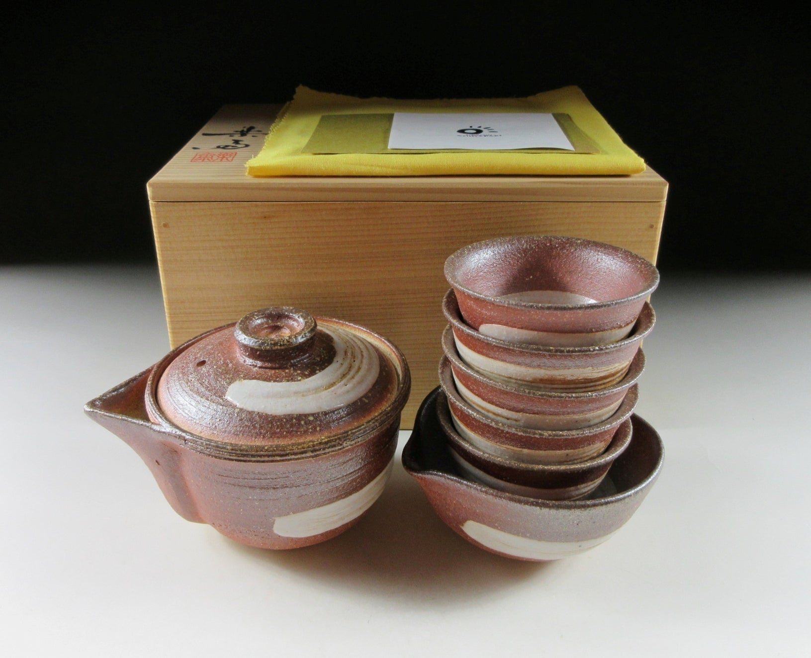 This listing is for a splendid Shigaraki-ware tea set made by distinguished potter, Takahashi Rakusai IV. The set consists of a small 175ml hobin teapot, a yuzamashi for adjusting the water temperature, and five teacups. The yuzamashi is an essential item for making good quality tea. Boiled water should be poured into the yuzamashi before going anywhere near the teapot. This allows the water to cool down and become the correct temperature, which is ideally around 80 degrees Celsius. This type of tea set is intended for making sencha or genmaicha. Sencha is a Japanese green tea made without grinding the tea leaves, whereas genmaicha is green tea combined with roasted brown rice. Each piece is signed and the set comes with its original signed storage box, and a Japanese language profile paper. It also comes with a yellow wrapping cloth for when the teapot is not in use.