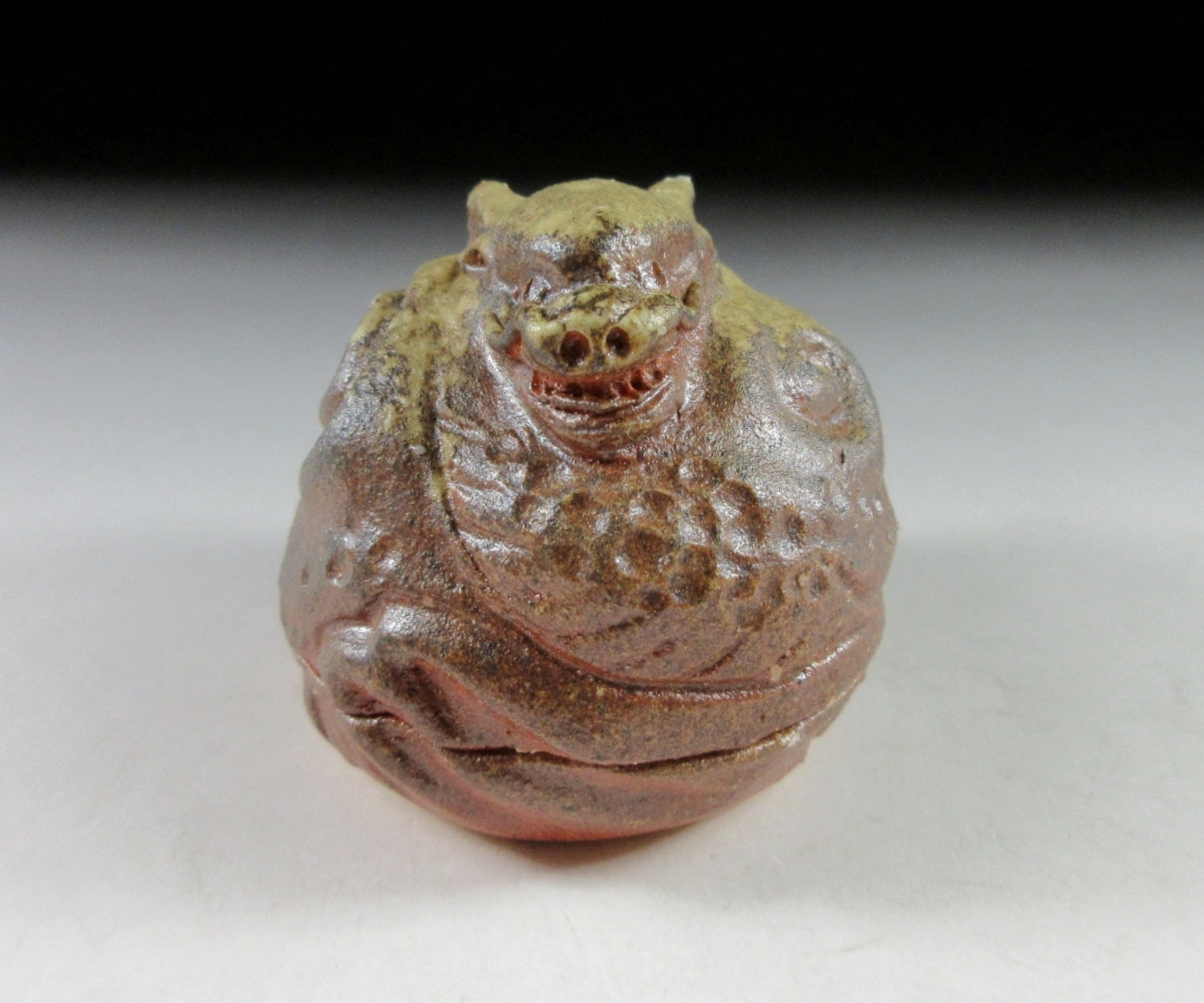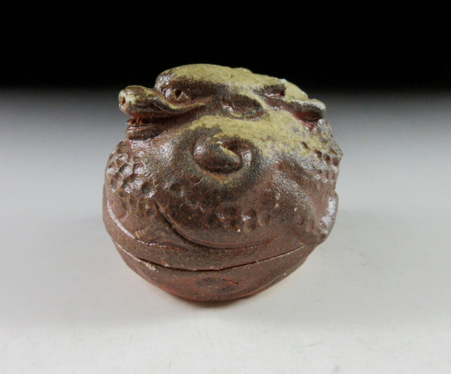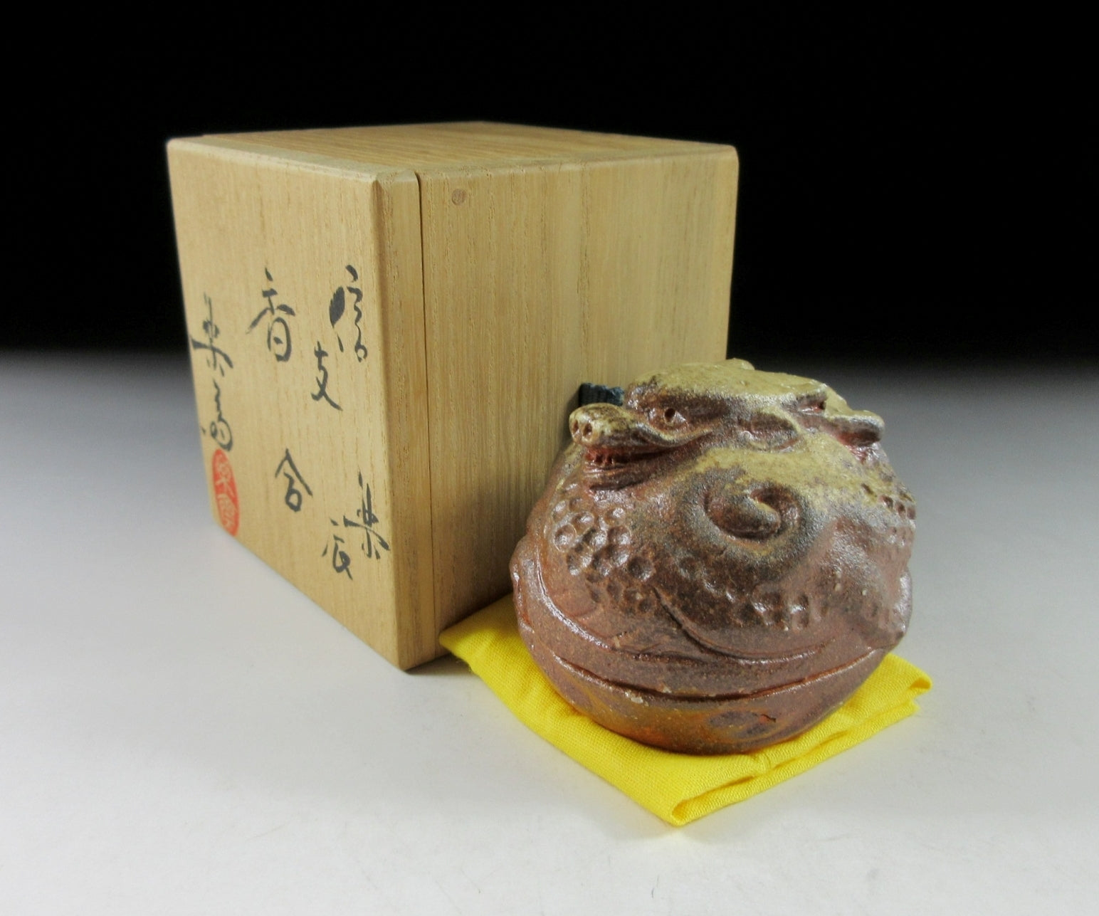 This listing is for a wood-fired Shigaraki-ware kogo made around 24 years ago by the highly esteemed Takahashi Rakusai IV. It is coated in fly ash and moulded to resemble a dragon. This piece was possibly made to commemorate the Year of the Dragon back in 2000. It’s ample in size and best suited to holding kneaded incense during the cooler months. Takahashi’s signature can be found on the bottom and it comes with its original signed storage box. It also comes with a signed yellow wrapping cloth for when the dragon is not in use.