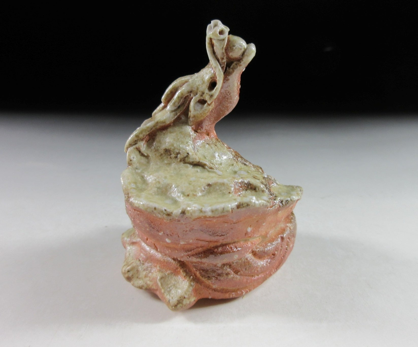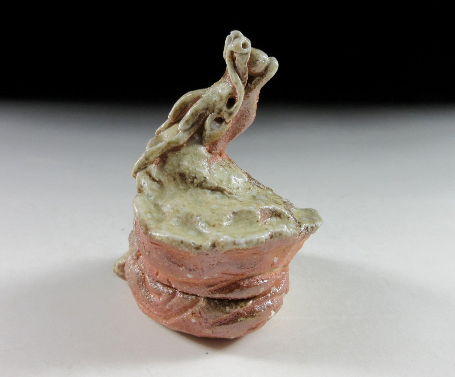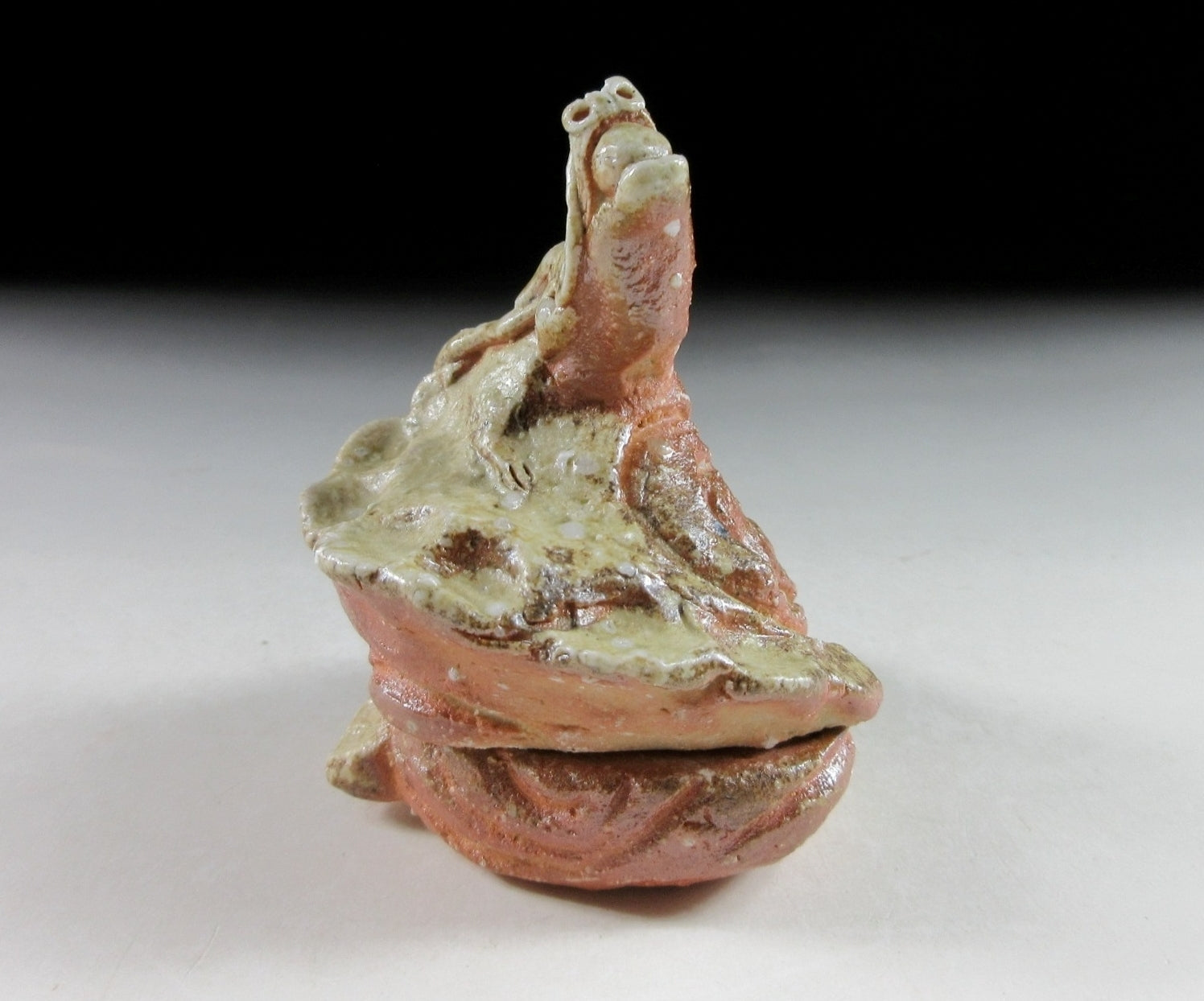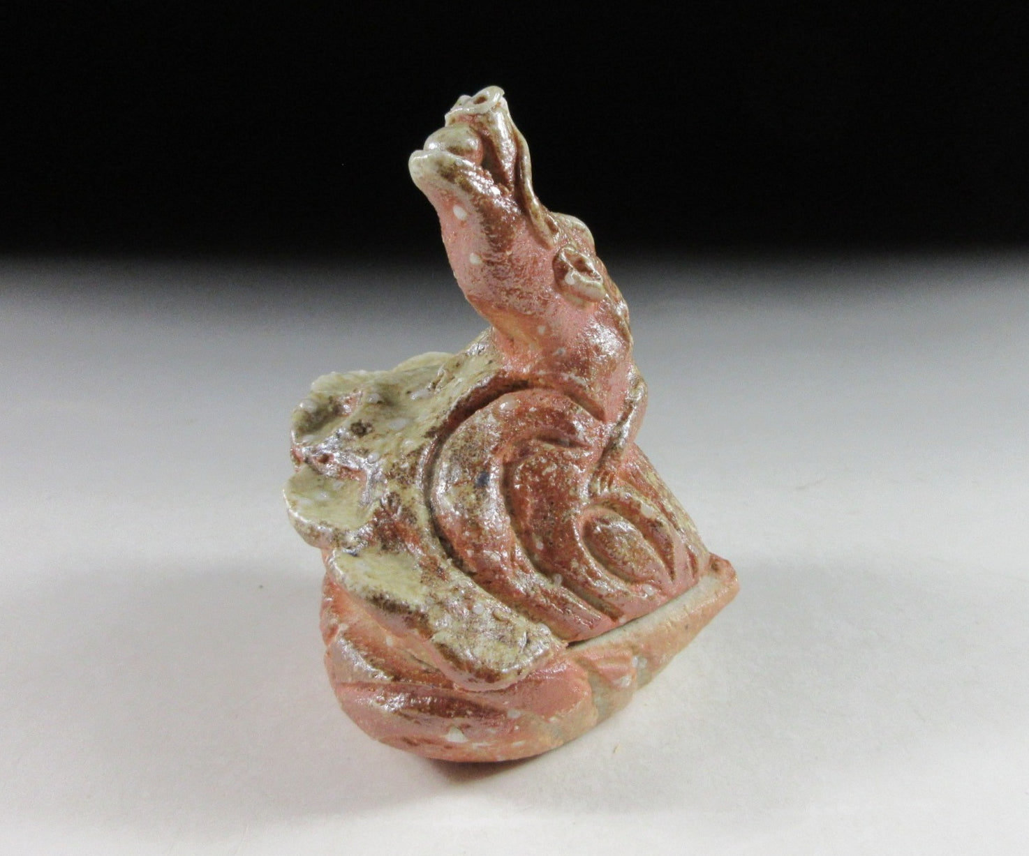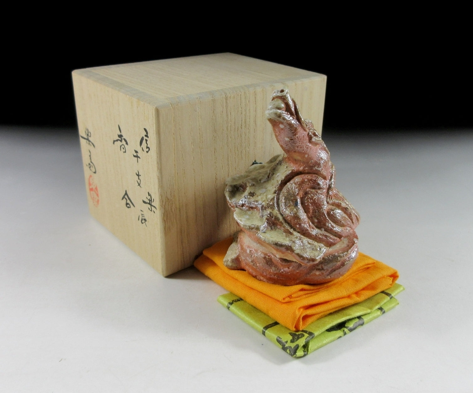 This listing is for a wood-fired Shigaraki-ware kogo made around 13 years ago by the highly esteemed Rakusai Takahashi IV. It is made of high-fired stoneware and moulded to resemble a dragon. This piece was possibly made to commemorate the Year of the Dragon back in 2012. It’s ample in size and best suited to holding kneaded incense during the cooler months. Takahashi’s signature can be found on the bottom and it comes with its original signed storage box. It also comes with an unsigned turmeric coloured wrapping cloth for when the dragon is not in use, as well as a Japanese language profile paper.