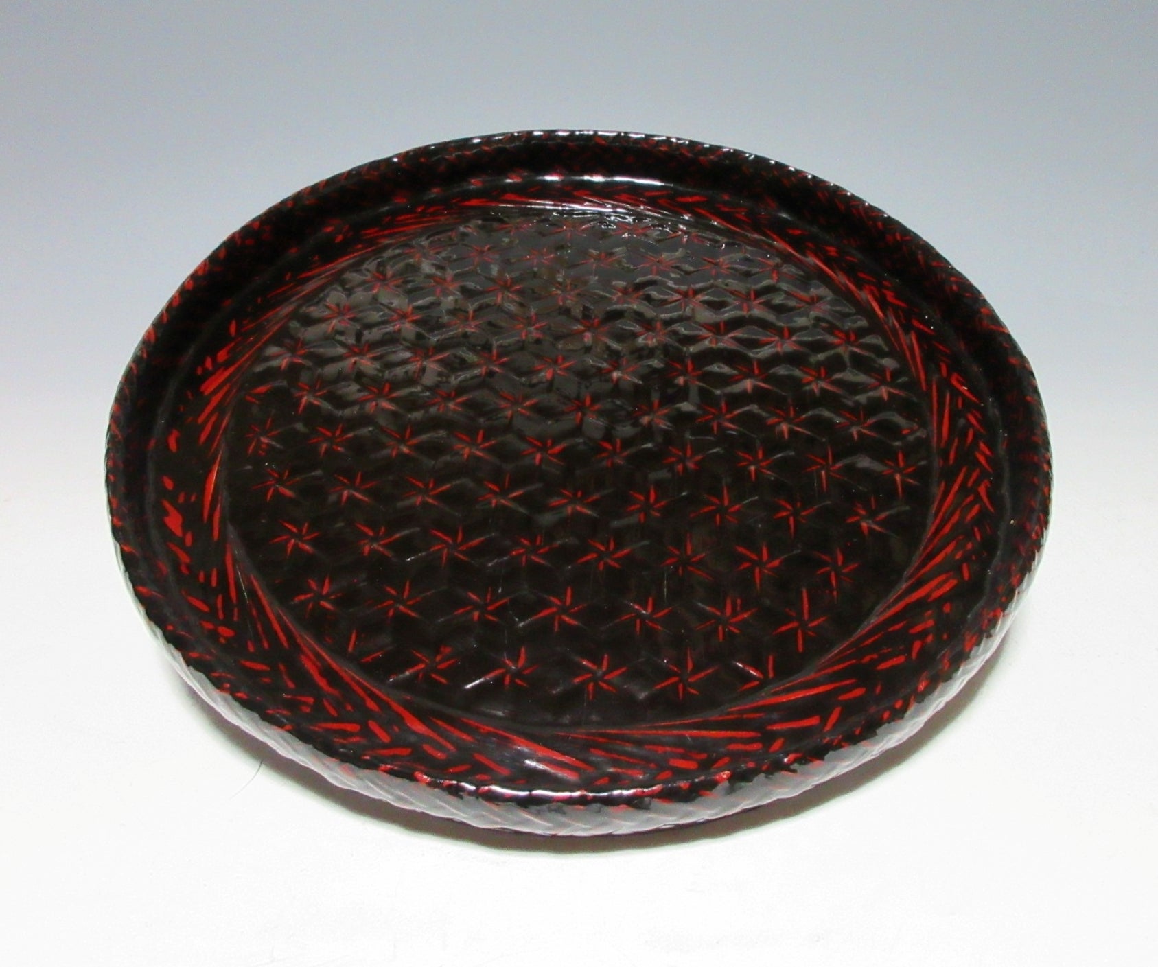 Rantai shikki refers to lacquerware produced in various parts of Kyushu, although Fukuoka is one of the biggest producers of this particular type of lacquerware. The making process is a long and arduous one performed by skilled artisans. The basis for this type of lacquerware is bamboo, and it involves weaving thin strips into different shapes and then applying lacquer. First the piece receives an undercoat, and then 7-8 layers of different coloured lacquer are applied over the top. The layers are polished to form different patterns such as ume, sakura, small dragonflies etc. The final stage involves adding a coat of clear lacquer over top to protect the wares from oil and salt.