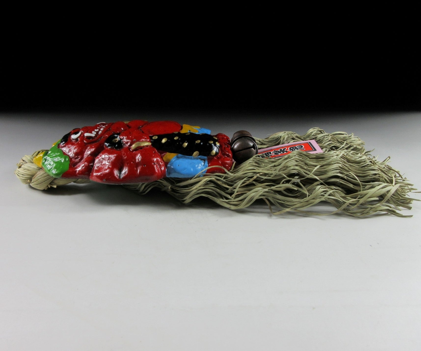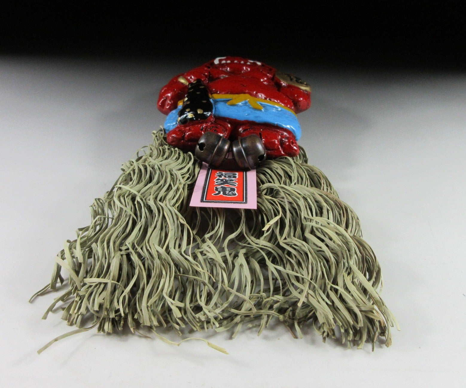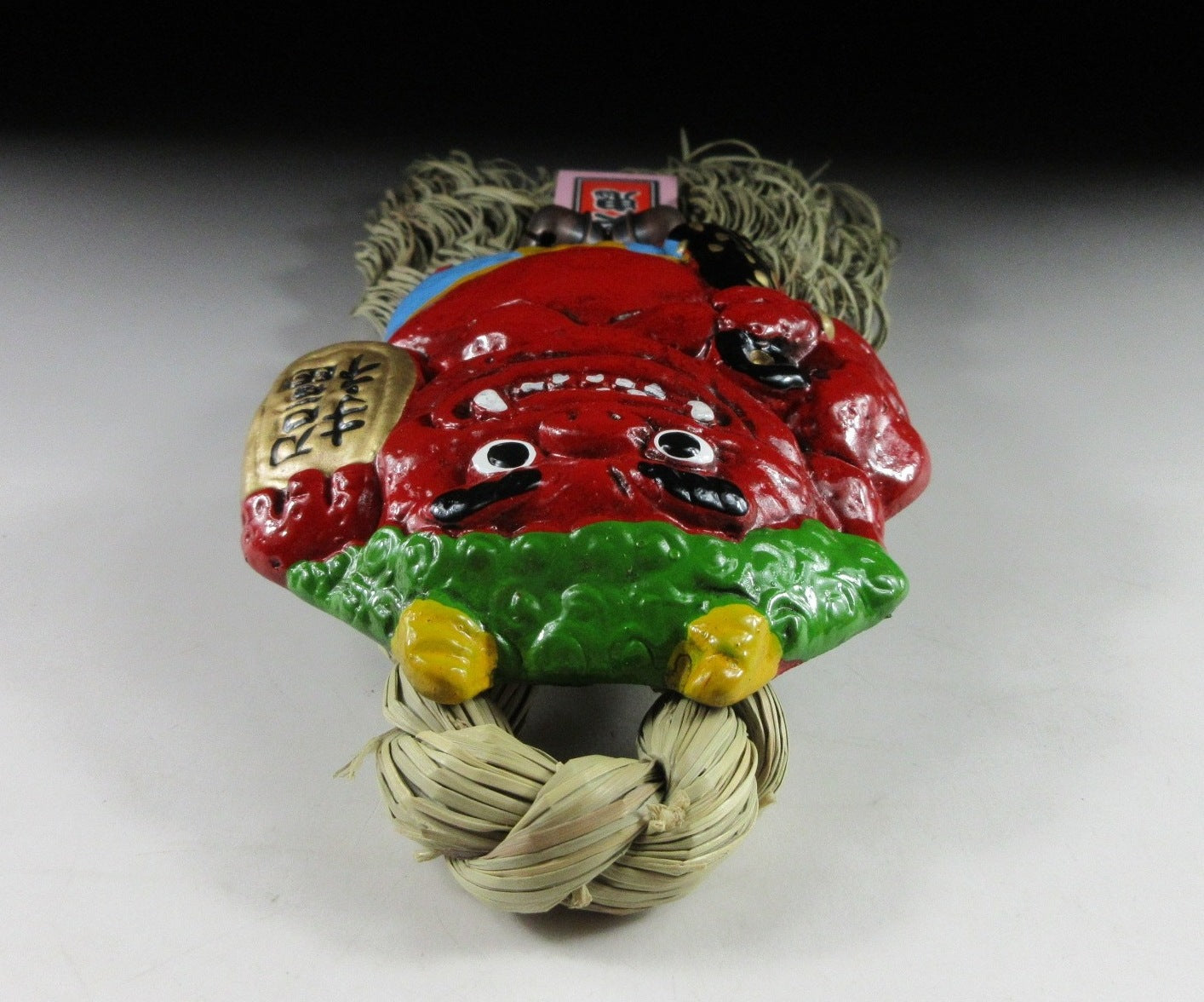 This listing is for a red oni wall hanging made around 5 years ago. It is made of plaster and painted bright colours like folk crafts from the 1950s and 60s. The loop at the top and the bottom part is made out of rice straw, and it is designed to sit nice and flat on the wall. This item is an amulet for bringing luck, the kanji reads as ‘mayoke’ which means to drive bad luck out. It would make a great gift for oni fans or for those with an interest in curious beasts.
