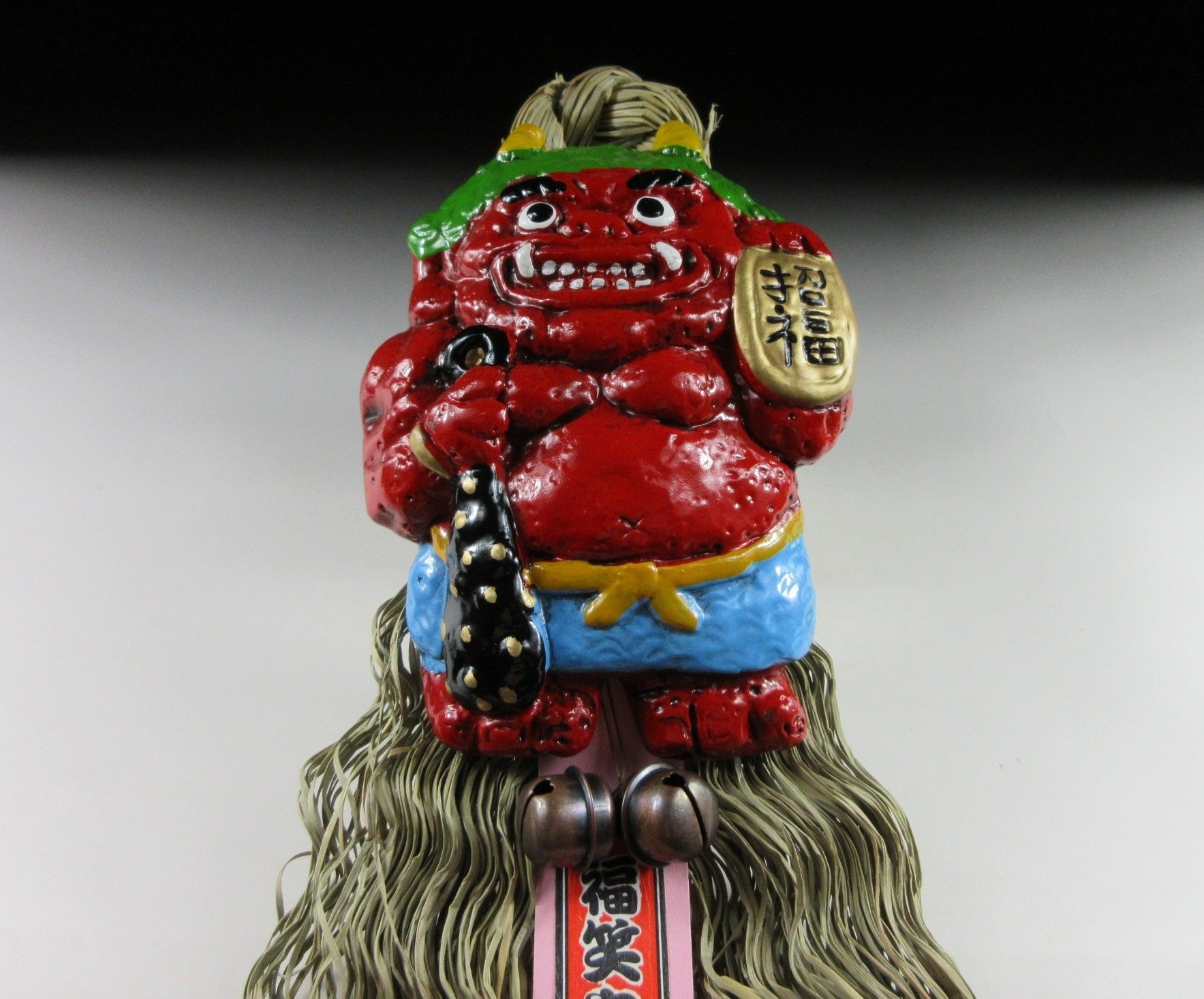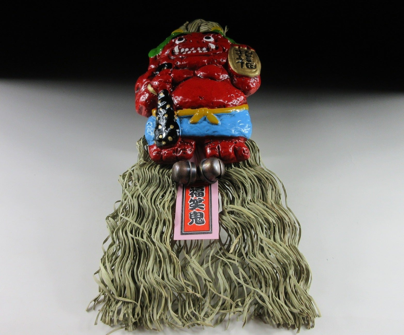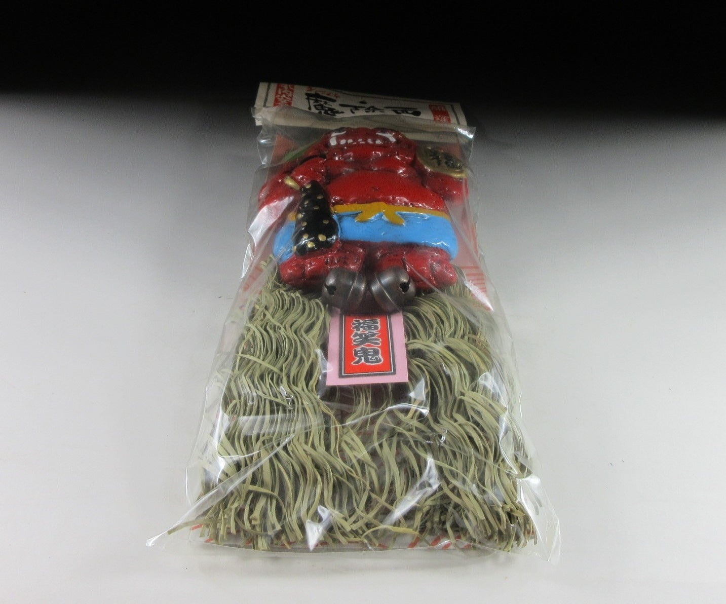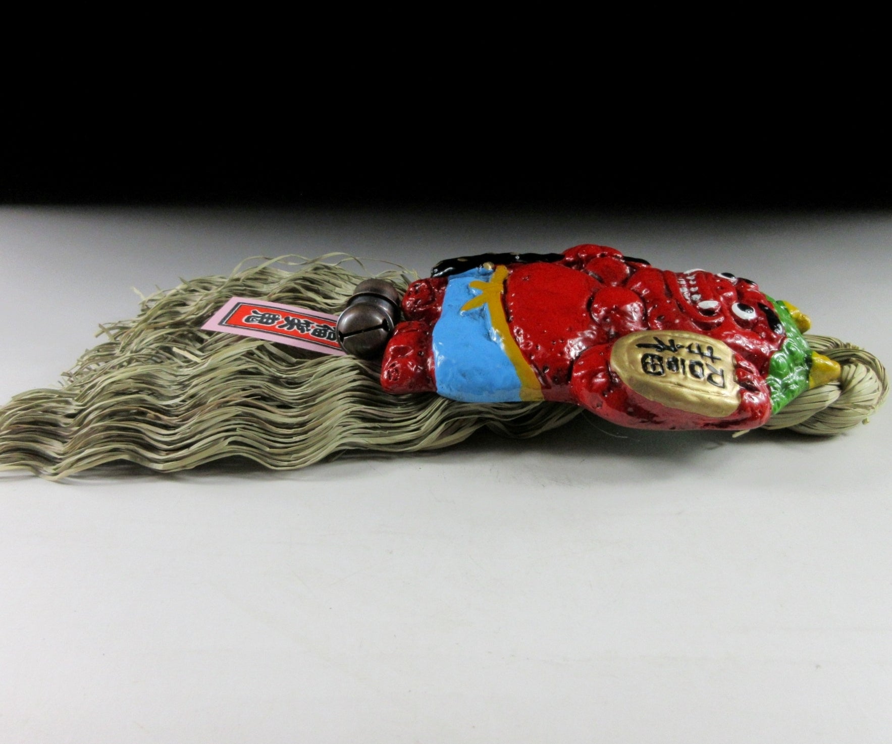 This listing is for a red oni wall hanging made around 5 years ago. It is made of plaster and painted bright colours like folk crafts from the 1950s and 60s. The loop at the top and the bottom part is made out of rice straw, and it is designed to sit nice and flat on the wall. This item is an amulet for bringing luck, the kanji reads as ‘mayoke’ which means to drive bad luck out. It would make a great gift for oni fans or for those with an interest in curious beasts.