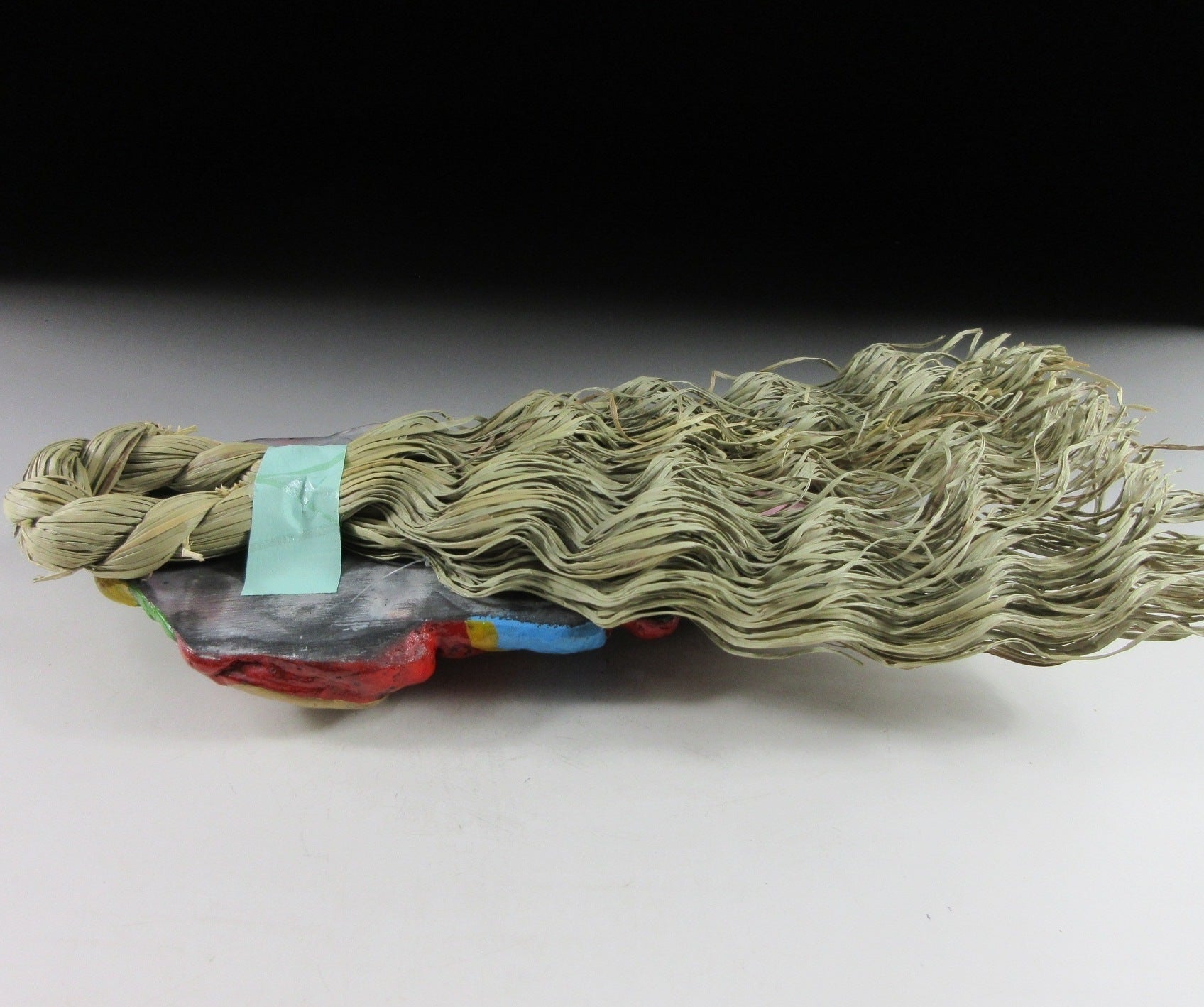 It’s in very good condition aside from the curl in the rice straw on the bottom part. Place something heavy on it for a few days (or more) to flatten it.