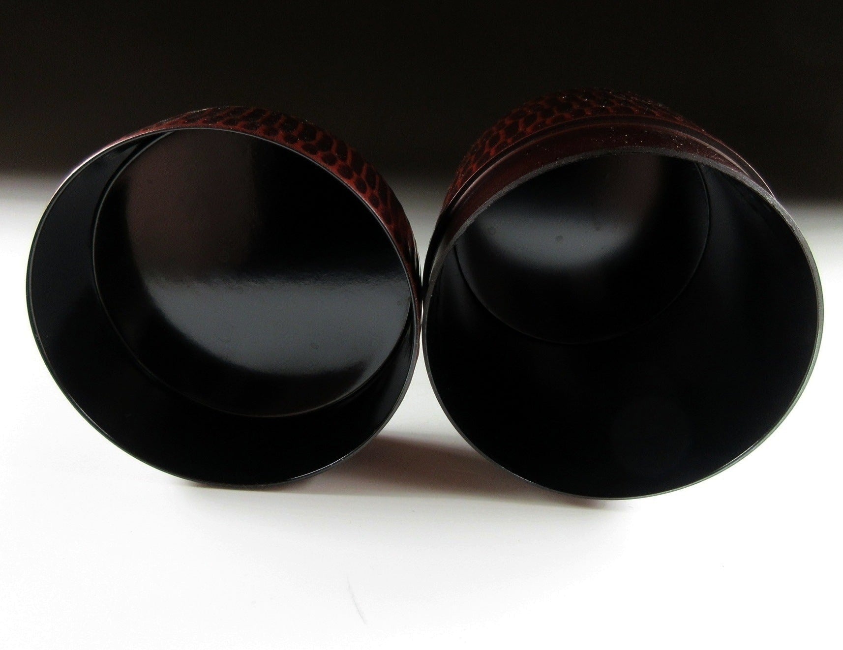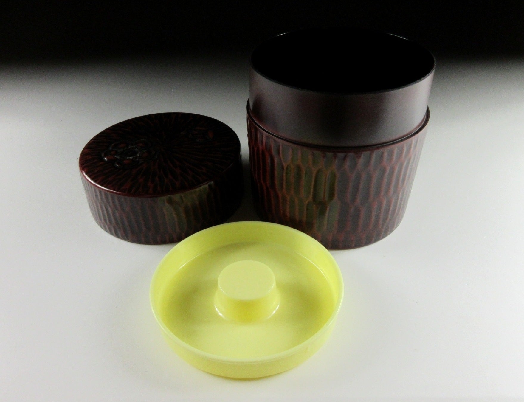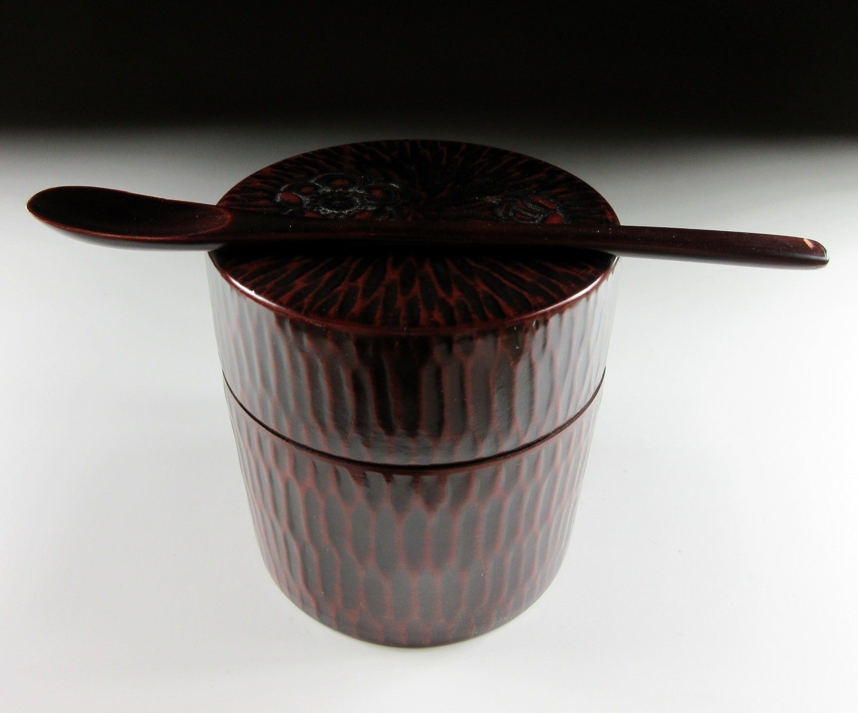 This listing is for a synthetic resin Kamakura-bori tea caddy and lacquered spoon. The small spoon is made of wood and is lacquered the same colour as the caddy. The caddy is plastic and has a plastic lid on the interior to keep the contents fresh and dry. This piece is perfect for outdoor use like picnics as you won’t have to worry about scratches or scrapes.