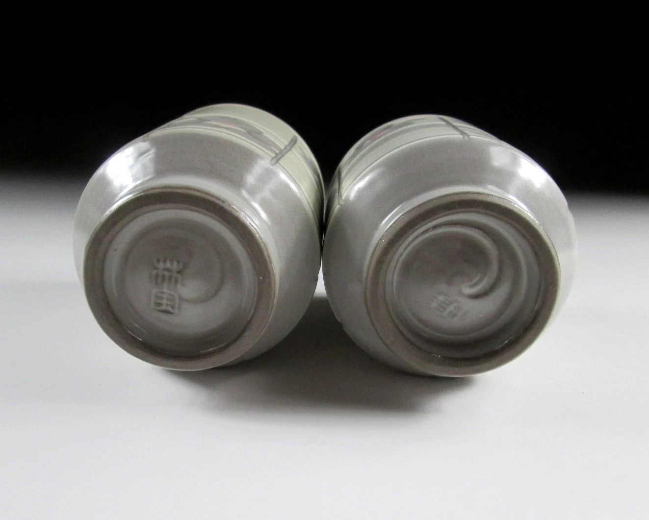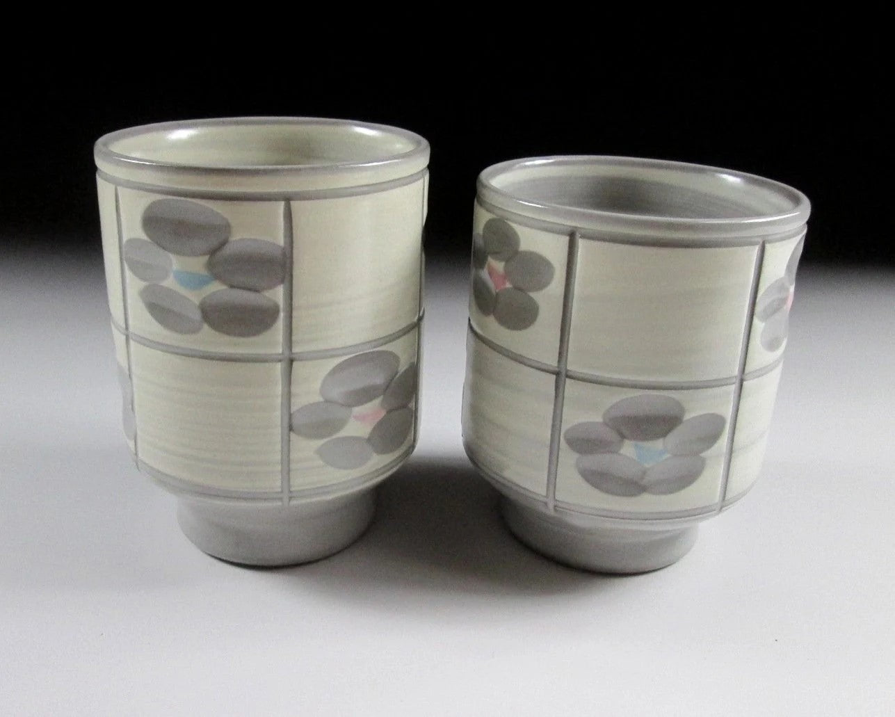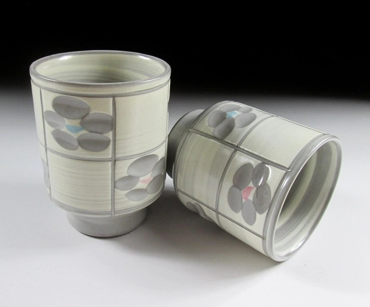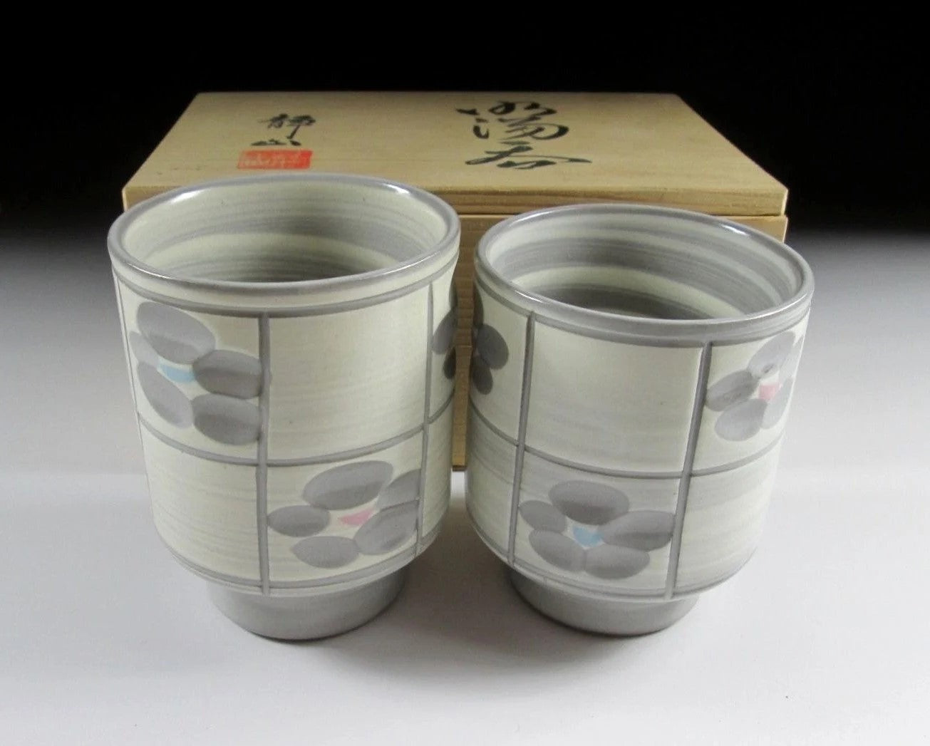 This listing is for a pair of Arita-ware yunomi made around 20 years ago by Rinpo Gama. They are wheel-thrown and decorated with white slip and ume blossoms that have been carved into the surface below. The centre of the blossoms is trimmed with pink and blue glaze, and the cups have a smooth matte finish. Also these cups are what we call meoto style, meaning they are two different sizes and often referred to as a husband and wife pair. The stamp of the potter can be found on the bottom of each cup, and they come with their original signed wooden storage box.
