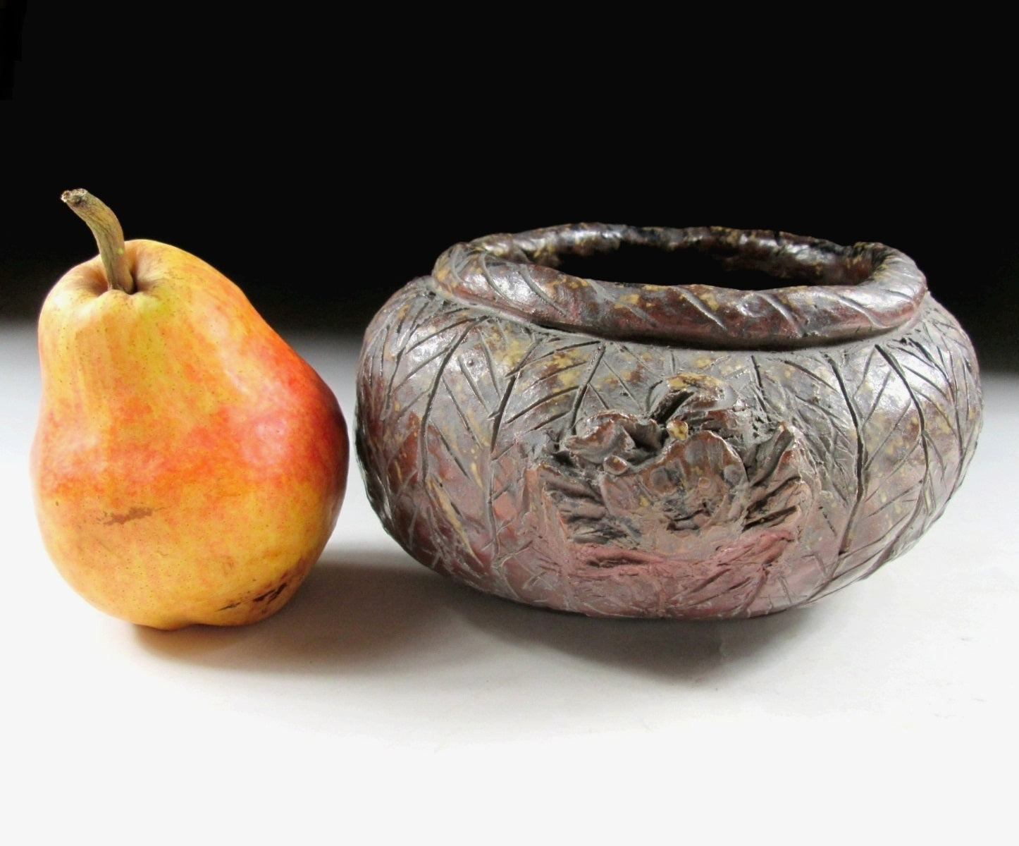 This listing is for an old and robust Bizen-ware kensui made around 70-80 years ago. Kensui are intended for use during the tea ceremony. Essentially the job of a kensui is to hold used water after tea utensils have been rinsed off. The kensui in this listing is hand-shaped and moulded to resemble a basket. It features a hand-shaped crab on the front, and is decorated with incised lines resembling the woven strips you would see on a basket. This is a very solid and primitive looking piece, ideal for wabi sabi enthusiasts.