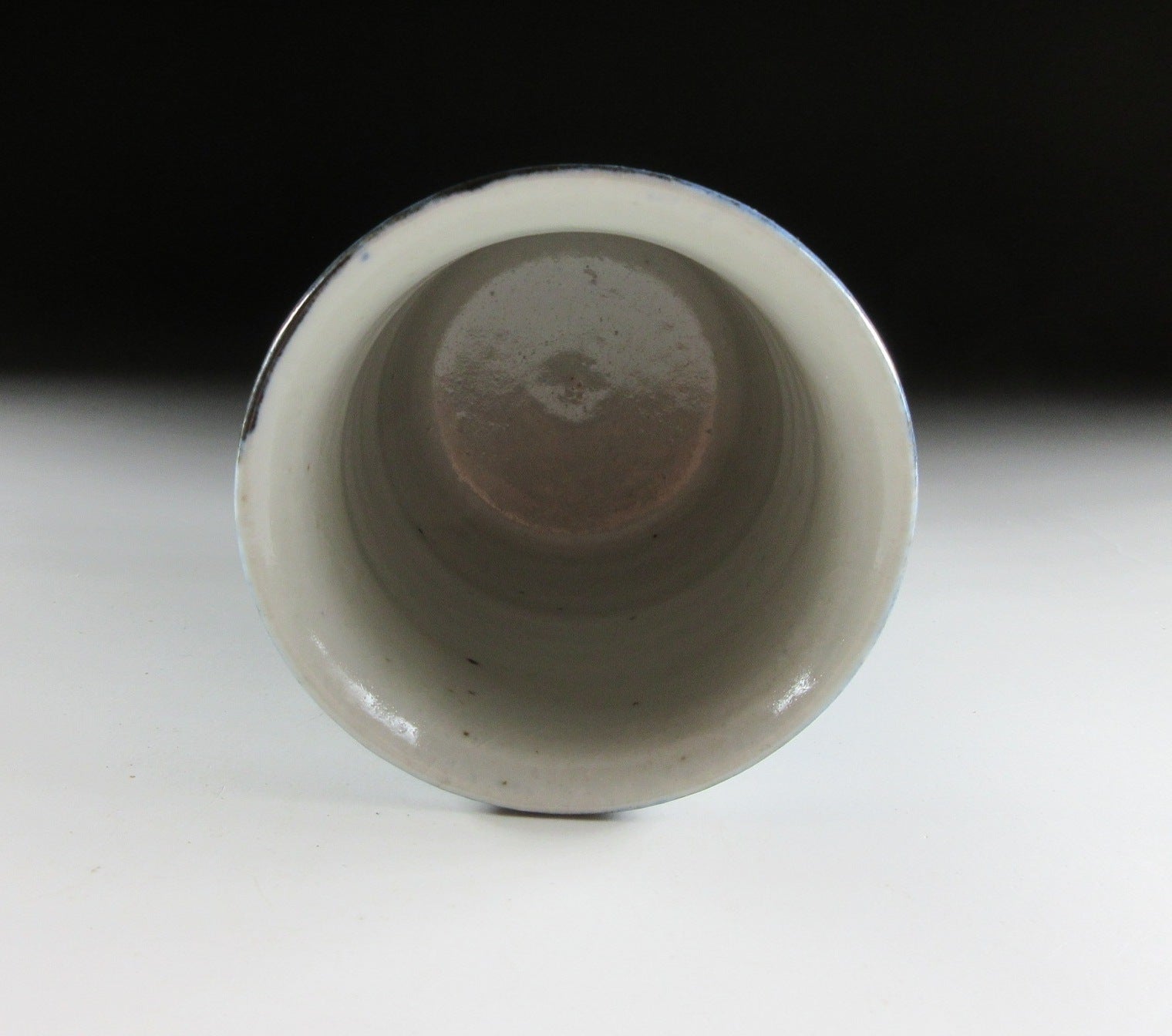 This listing is for a Kasama-ware yunomi tea cup made around 20 years ago by noted potter, Sakai Hoju. It is wheel-thrown and features transparent white glaze over a matte glazed base, thus creating a wintery blue appearance. The interior is coated in white glaze, and the rim of the cup is slightly flared. The stamp of the potter can be found on the bottom, and it comes with its original signed wooden storage box.