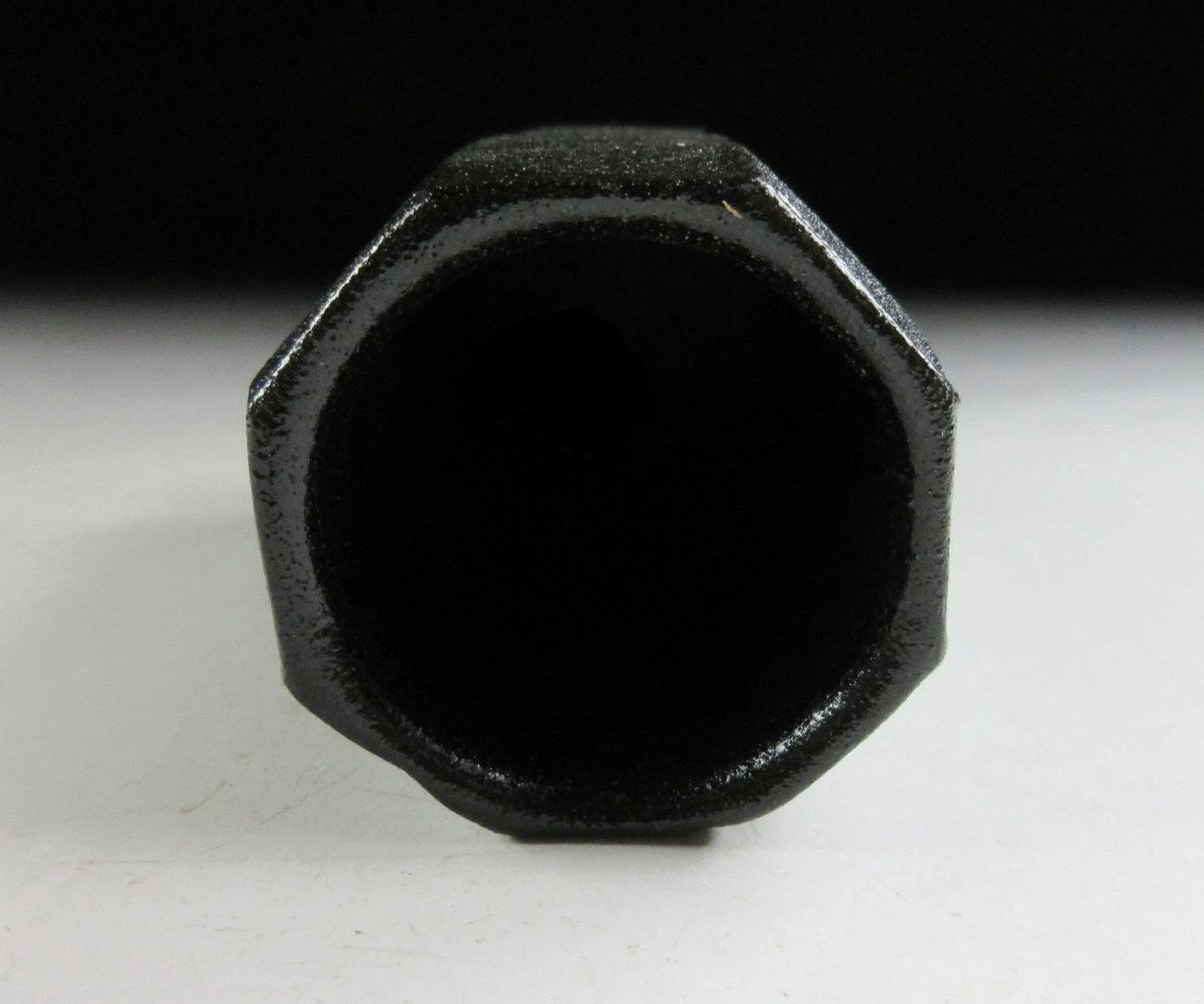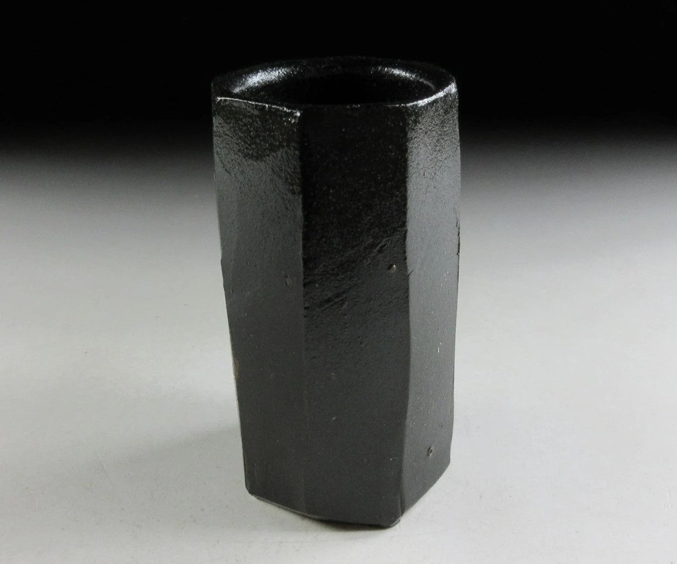 This listing is for Bizen-ware sake cup made by noted potter, Sakakibara Keishi. It is wheel-thrown and the exterior is faceted with a potter’s knife. The cup is tall and thin, and it’s coated in black satin matte glaze. This piece has a powerful form and a contemporary feel about it. The signature of the potter can be found on the bottom, and it comes with its original signed wooden storage box. It also comes with a stamped yellow wrapping cloth for when the item is not in use, as well as a Japanese language profile paper about the potter.