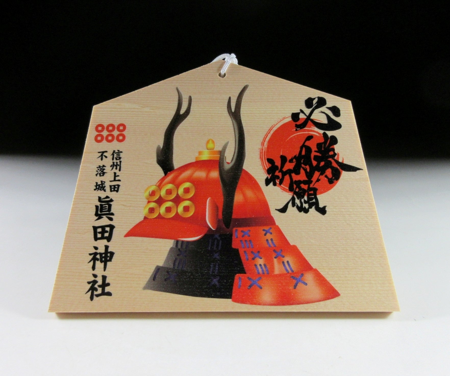 This listing is for a wooden ema from Sanada Shrine in Nagano Prefecture. Sanada Jingu was built in 1879 among the ruins of Ueda Castle. It is primarily used to honour successive lords of Ueda Castle, such as the Sanada clan, Sengoku clan and the Matsudaira clan. The front of the ema is decorated with the helmet of the warlord Sanada Nobushige. Sanada Nobushige (1516-1615) was a samurai warrior often referred to as the ‘Last Sengoku Hero’, or the ‘Crimson Demon of War’. It also features the six coin ‘rokumonsen’ emblem of the Sanada clan. These coins are to be given to the boatman who grants passage across the River of Three Hells, and is in reference to the passage to the afterlife.