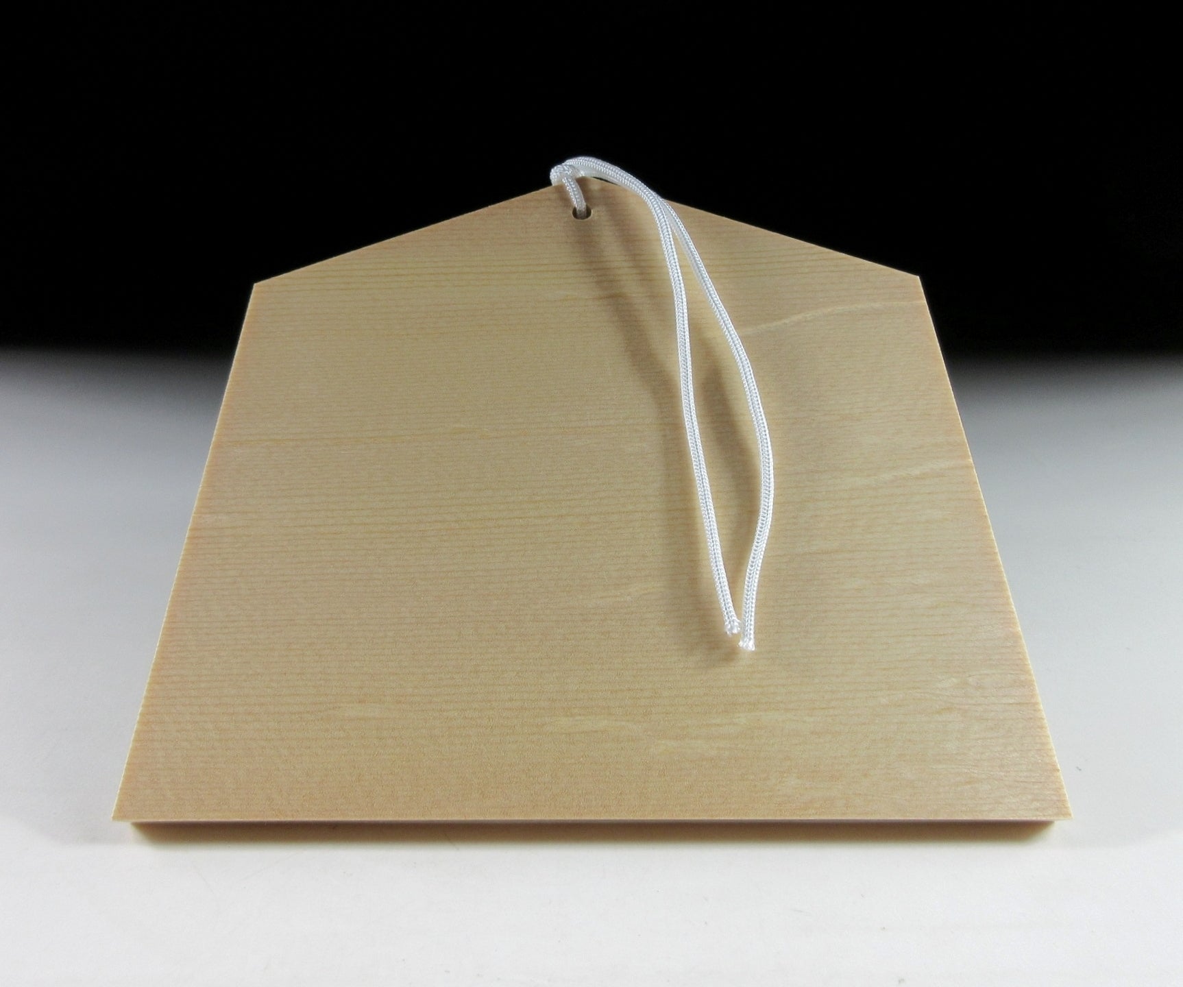 An ema is a traditional wooden votive prayer on which Shinto and Buddhist worshippers inscribe their wishes or prayers. Ema typically depict figures and zodiac animals, and they are hung at shrines and temples in the hope that the gods receive them and answer their prayers. The very first ema were said to be painted pictures of horses which were offered to shrines in place of real horses. The tradition of donating horses goes back to one of the first emperors of Japan, down in Kyoto. This was done to appease the gods when the weather wasn’t cooperating – a white horse was given to ease unseasonably heavy rainfall, and a black horse was offered to curb a drought. Traditionally ema were very large in size and often painted by well-known artists and craftsmen. During the Edo period they began to change in size due to the number of ordinary people travelling around the country visiting shrines and temples. These everyday folks were not so wealthy so shrines began to offer small wood framed ema as an alternative. This particular type were either hand painted by artists, or by those commissioned by the shrine. Sadly not many remain as most of them were burned in ritual fires at the end of each year.