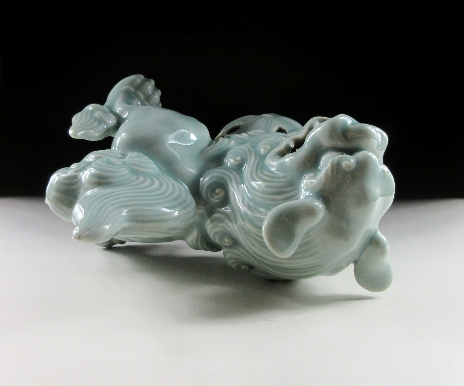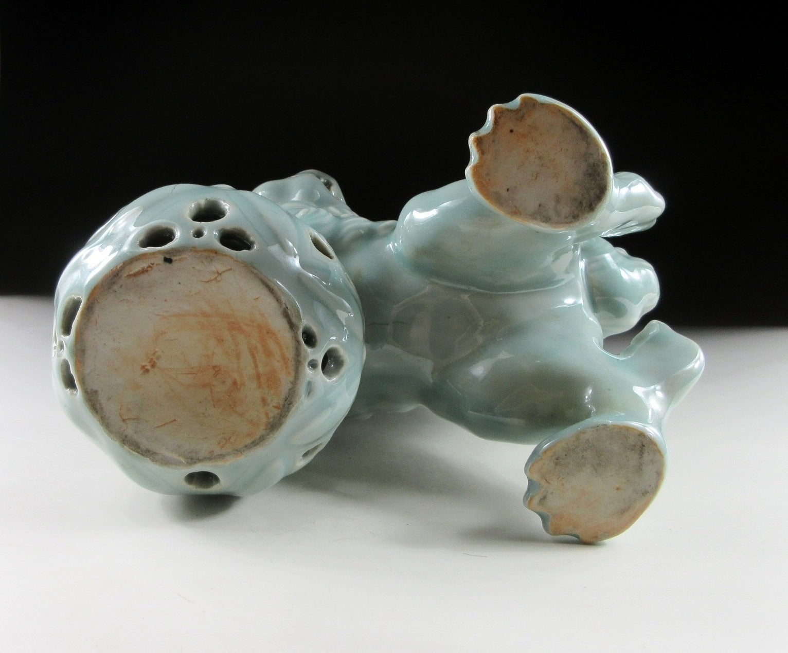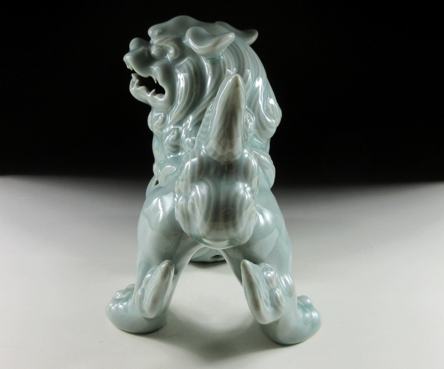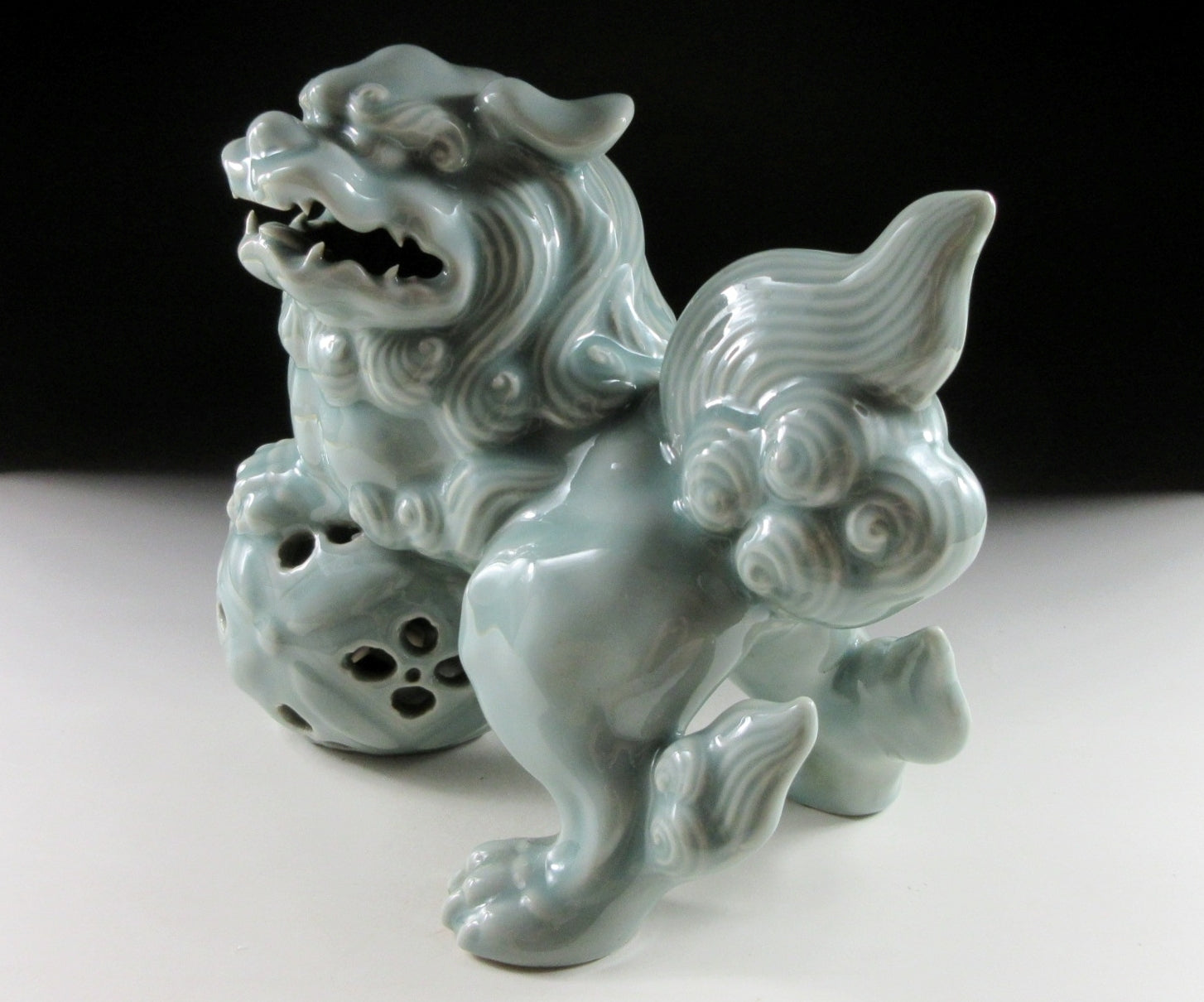 This listing is for a reasonably large Sanda-ware foo lion made around 30-40 years ago. It is made of porcelain and is coated in transparent green celadon glaze. This particular foo lion is male because it has an open mouth, and it’s perched upon a carved ball. The beautiful pattern symbolises the Flower of Life, and is thought to chase away ill omens and bring good fortune. **Please note that the colour is actually more green than pictured.