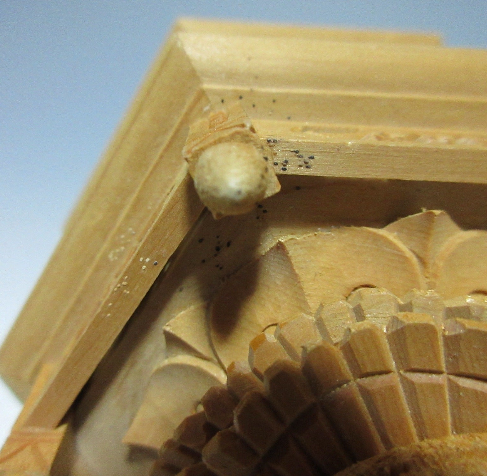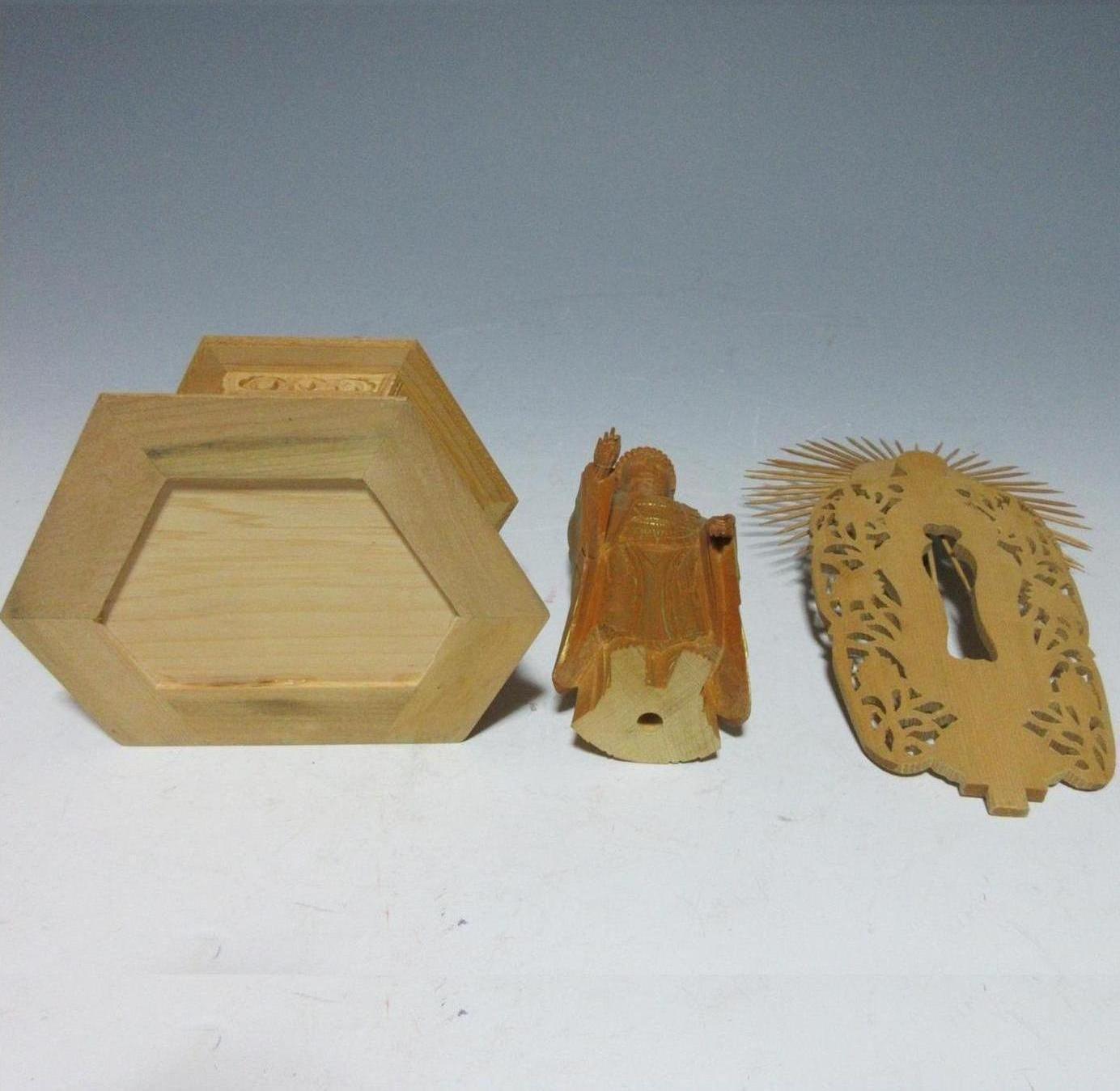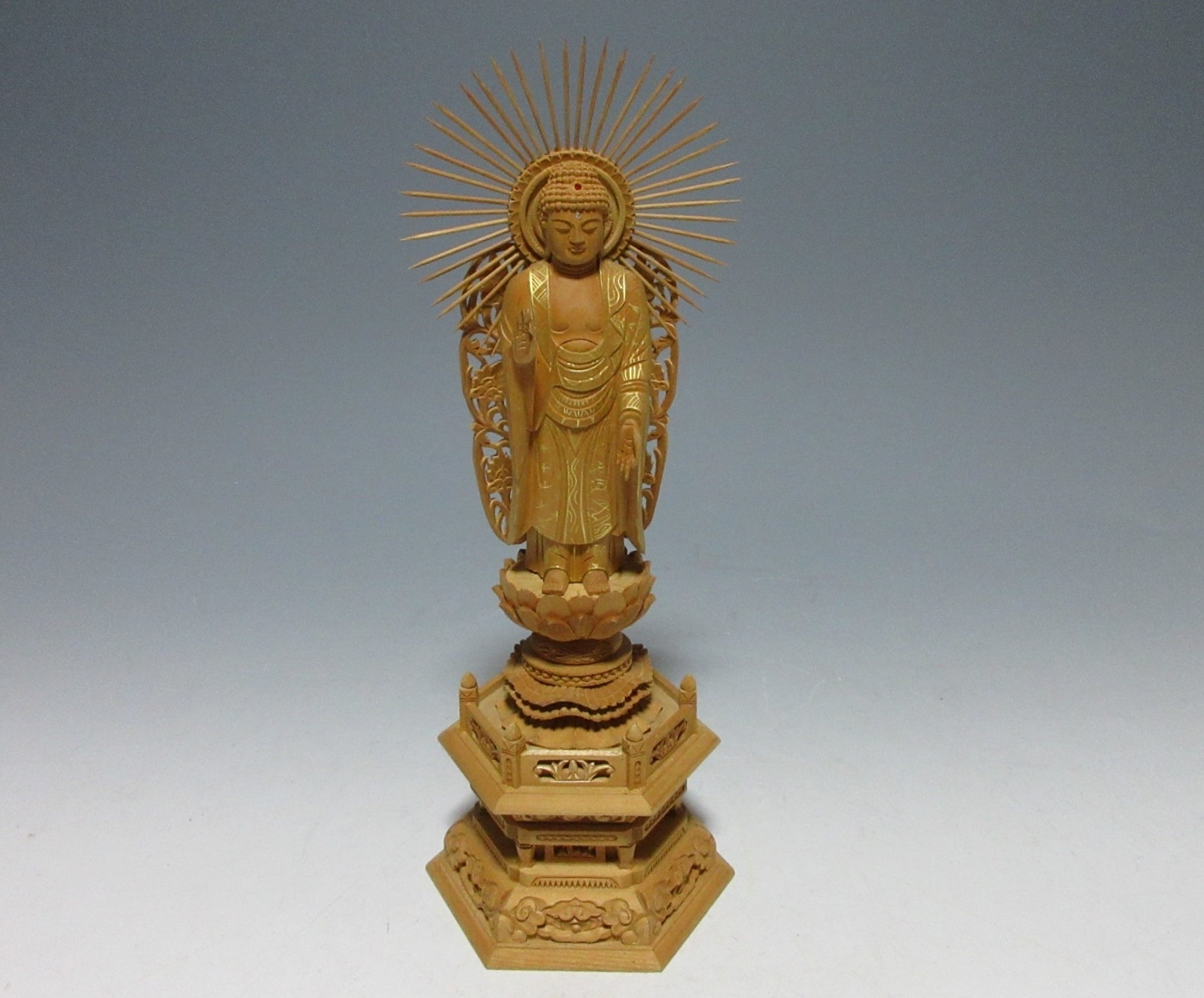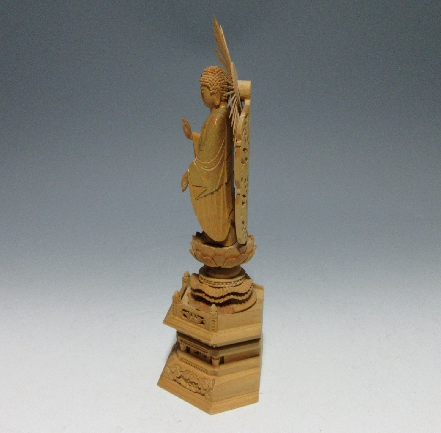 This listing is for a Jodo Shinshu standing Amida Nyorai Buddha made around 30-40 years ago. It is carved from boxwood and features beautiful gold gilt trim. The right hand of the statue is held in the vitarka mudra, which is a circle formed by the thumb and the index finger. The left hand is held in the gyan mudra, it is formed by joining together the tip of the index finger with the tip of the thumb. The Vitarka mudra is the mudra of discussion and argumentation, and the Gyan Mudra is the mudra of knowledge. He is standing on a lotus pedestal and behind him is a sukashibori openwork mandorla with carved flowers. Just behind his head sits aureole rays of light. This piece was carved for a Buddhist altar.