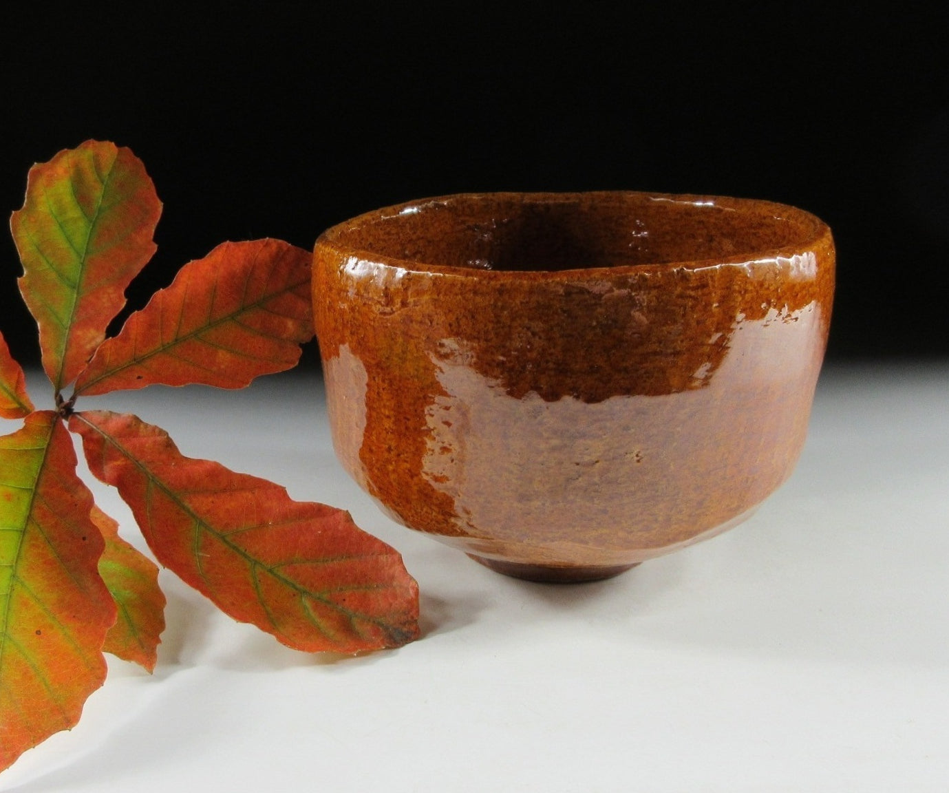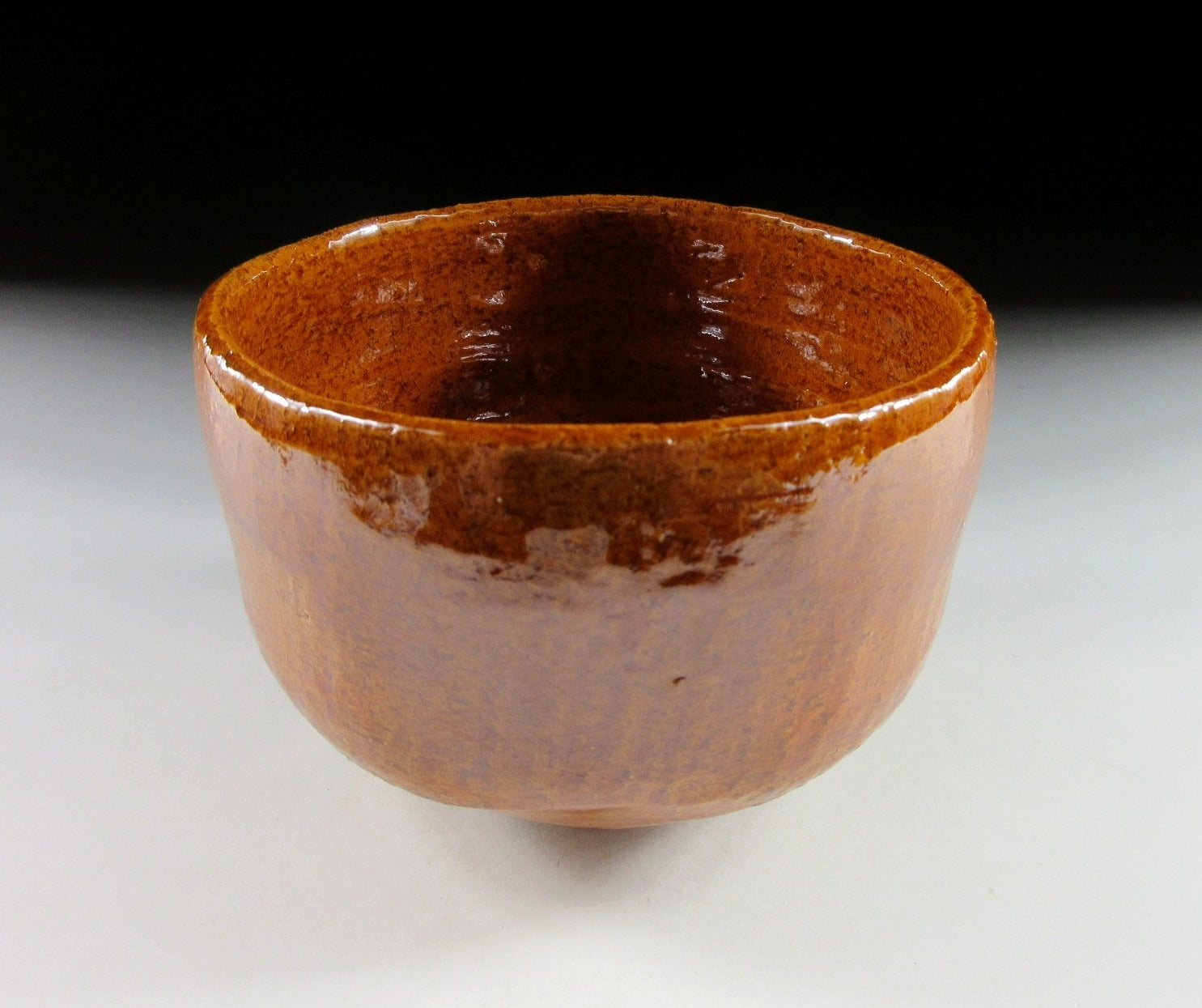 This listing is for a raku-ware chawan made around 10 years ago by Sasaki Shoraku III. It is hand-turned and coated in glossy caramel coloured ame-yu glaze. The exterior features a pattern of diagonal grooves and a gently undulating rim consisting of five peaks. These peaks represent the five main Zen temples in Kyoto, historically Zen Buddhism contributed to the creation of the Japanese tea ceremony. The stamp of the potter can be found on the bottom, and it comes with a paper storage box.
