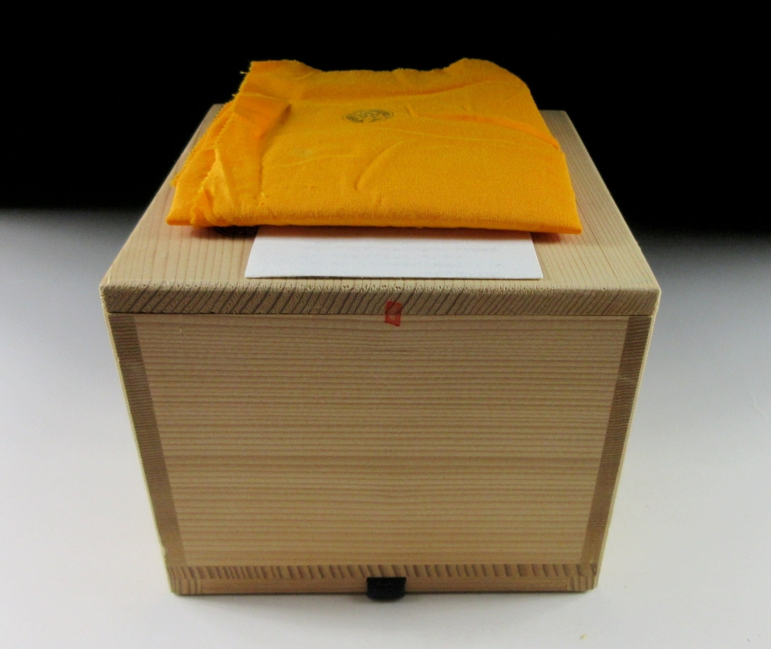 This listing is for a splendid aka-raku chawan made around 20 years ago by distinguished potter, Sasaki Shoraku III. It is hand-turned and the exterior of the bowl features small grooves from where the potter has worked the surface of the clay, making this a very organic and tactile piece. The bowl is coated in transparent white glaze, which also emphasizes the beautiful grooves on the exterior. The stamp of the potter can be found on the bottom, and it comes with its original signed wooden storage box. It also comes with a stamped turmeric coloured wrapping cloth for when the item is not in use, as well as a Japanese language profile paper about the potter.