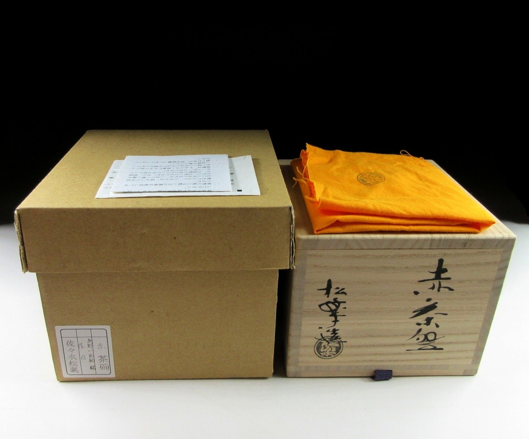 This listing is for a splendid aka-raku chawan made around 10 years ago by distinguished potter, Sasaki Shoraku III. It is hand-turned and the exterior of the bowl features grooves from where the potter has worked the surface of the clay, making this a very tactile piece. Moreover the front of the bowl has patches of black, and this is due to the sudden drop in temperature when the bowl was removed from the kiln. The stamp of the potter can be found on the bottom, and it comes with its original signed wooden storage box. It also comes with a stamped turmeric coloured wrapping cloth for when the item is not in use, as well as a Japanese language profile paper about the potter. There’s an outer paper storage box to protect the wooden tomobako.
