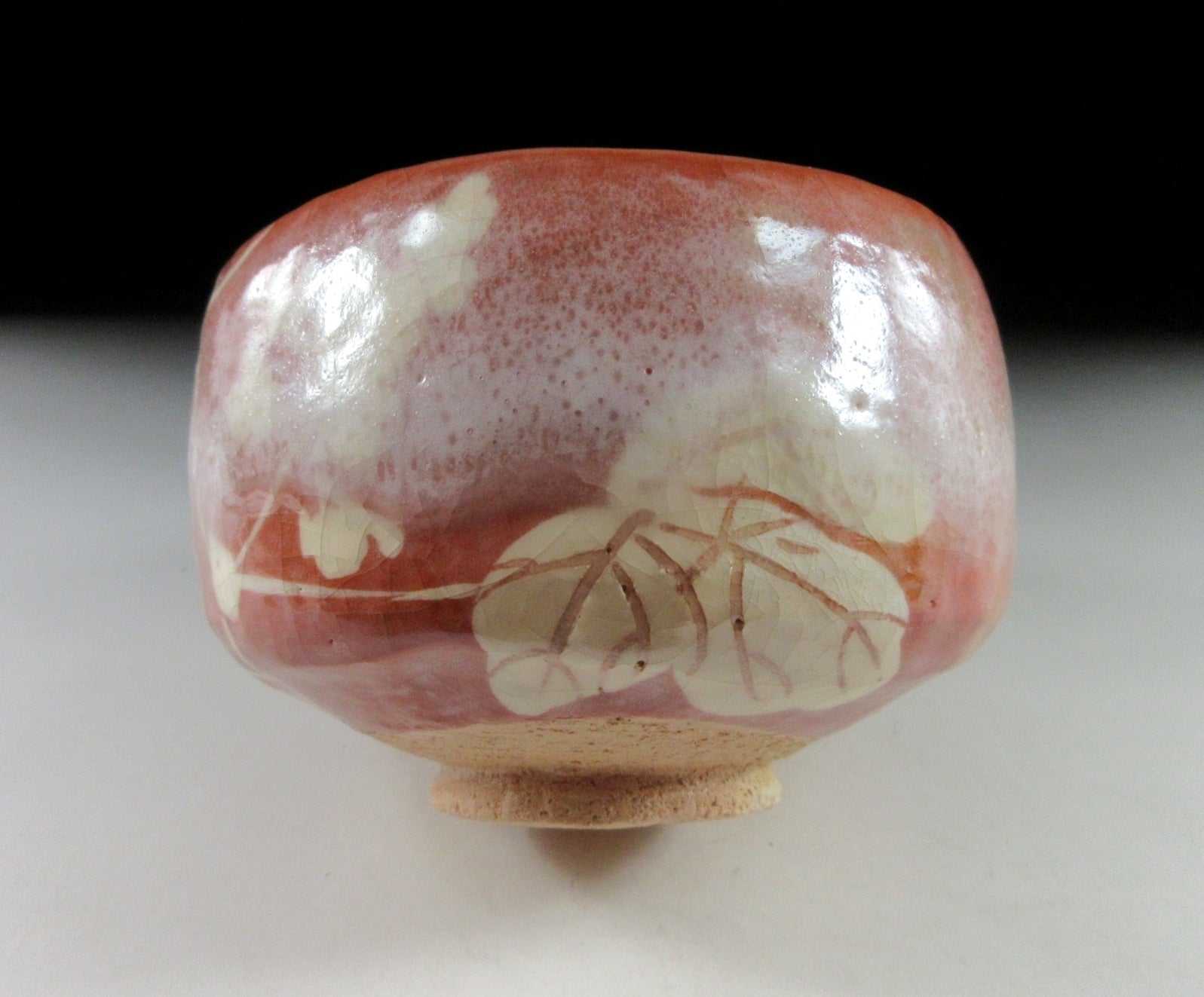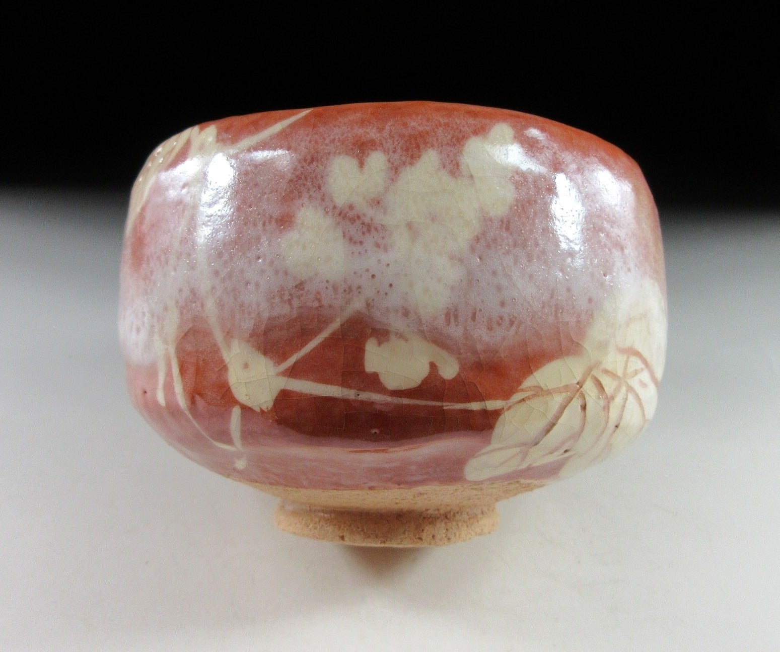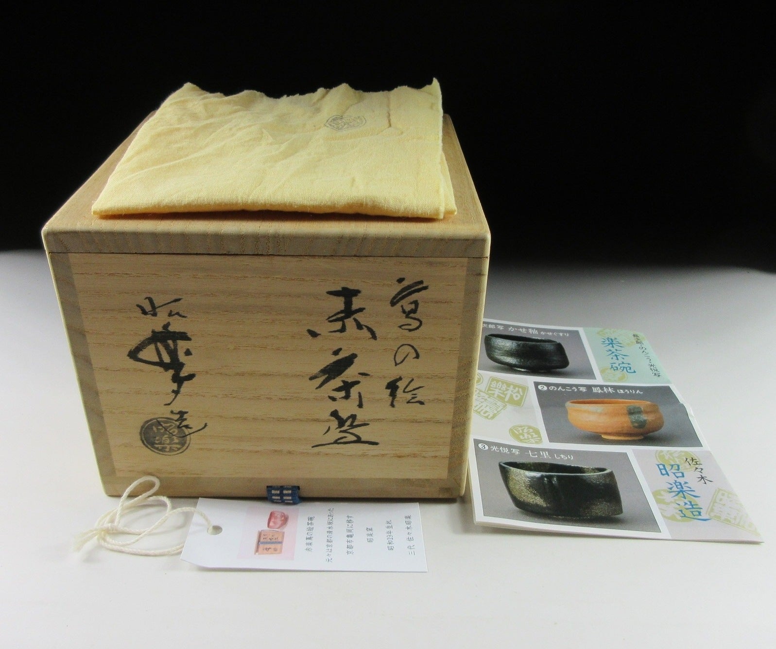 This listing is for a splendid aka-raku chawan made around 20 years ago by distinguished potter, Sasaki Shoraku III. It is hand-turned and the front of the bowl is decorated with depictions of ivy. The accompanying profile paper says ‘tsuta no e chawan’ which translates as ‘ivy picture tea bowl’. The bowl is also coated in transparent white glaze, this adds strength to the walls and has the bowl brimming with the freshness of spring. The stamp of the potter can be found on the bottom, and it comes with its original signed wooden storage box. It also comes with a stamped yellow coloured wrapping cloth for when the item is not in use, a Japanese language profile paper about the Sasaki lineage, and a Shoraku pamphlet that includes this particular chawan.