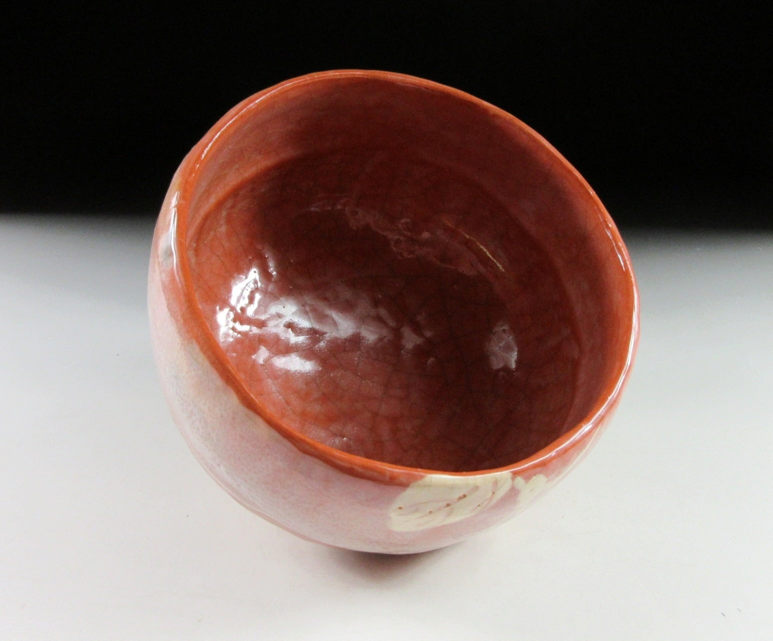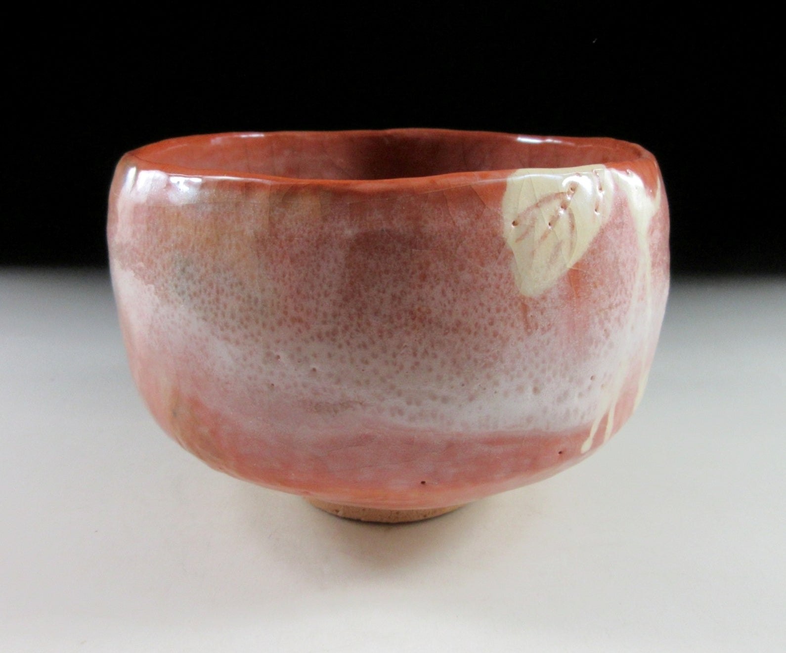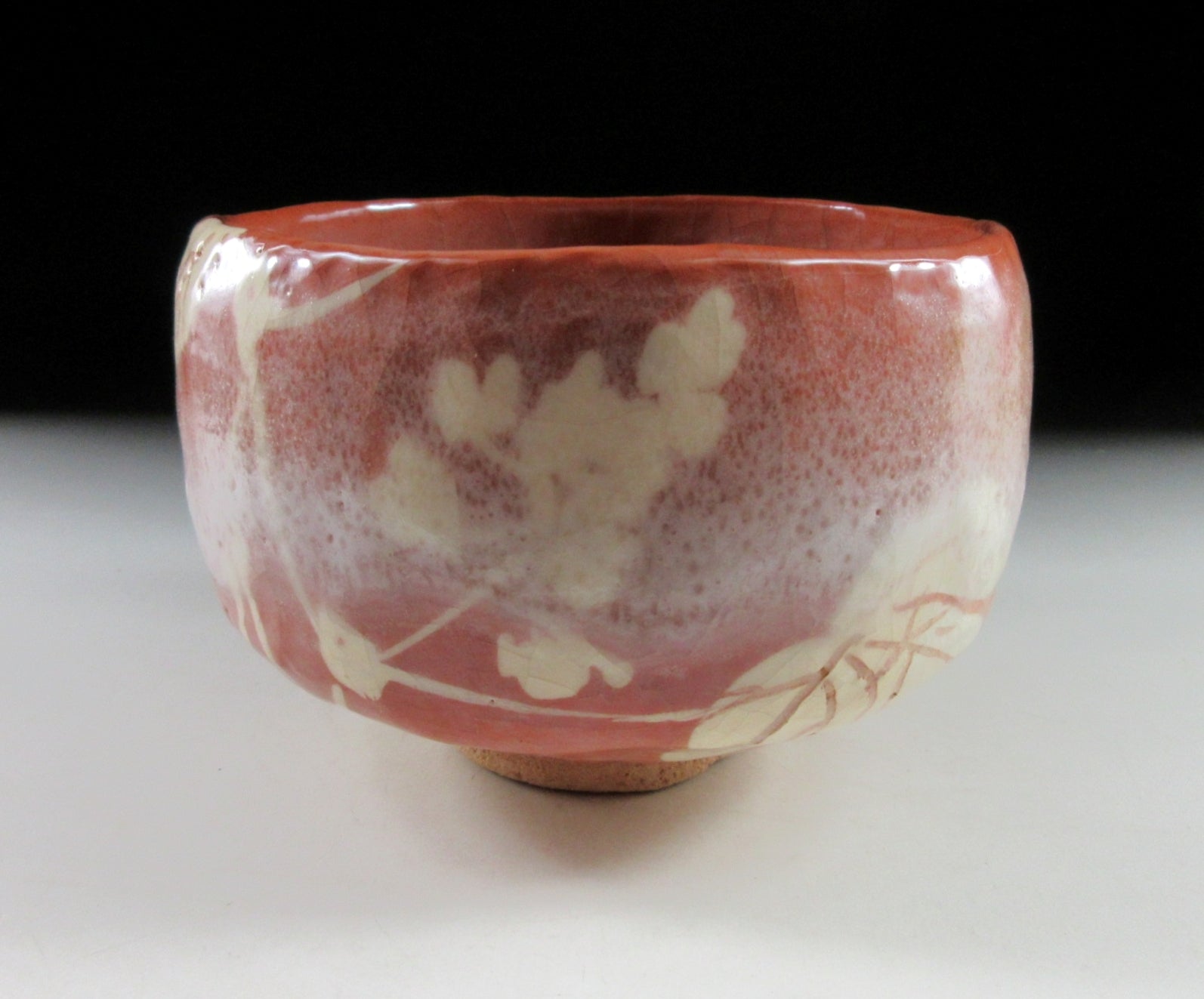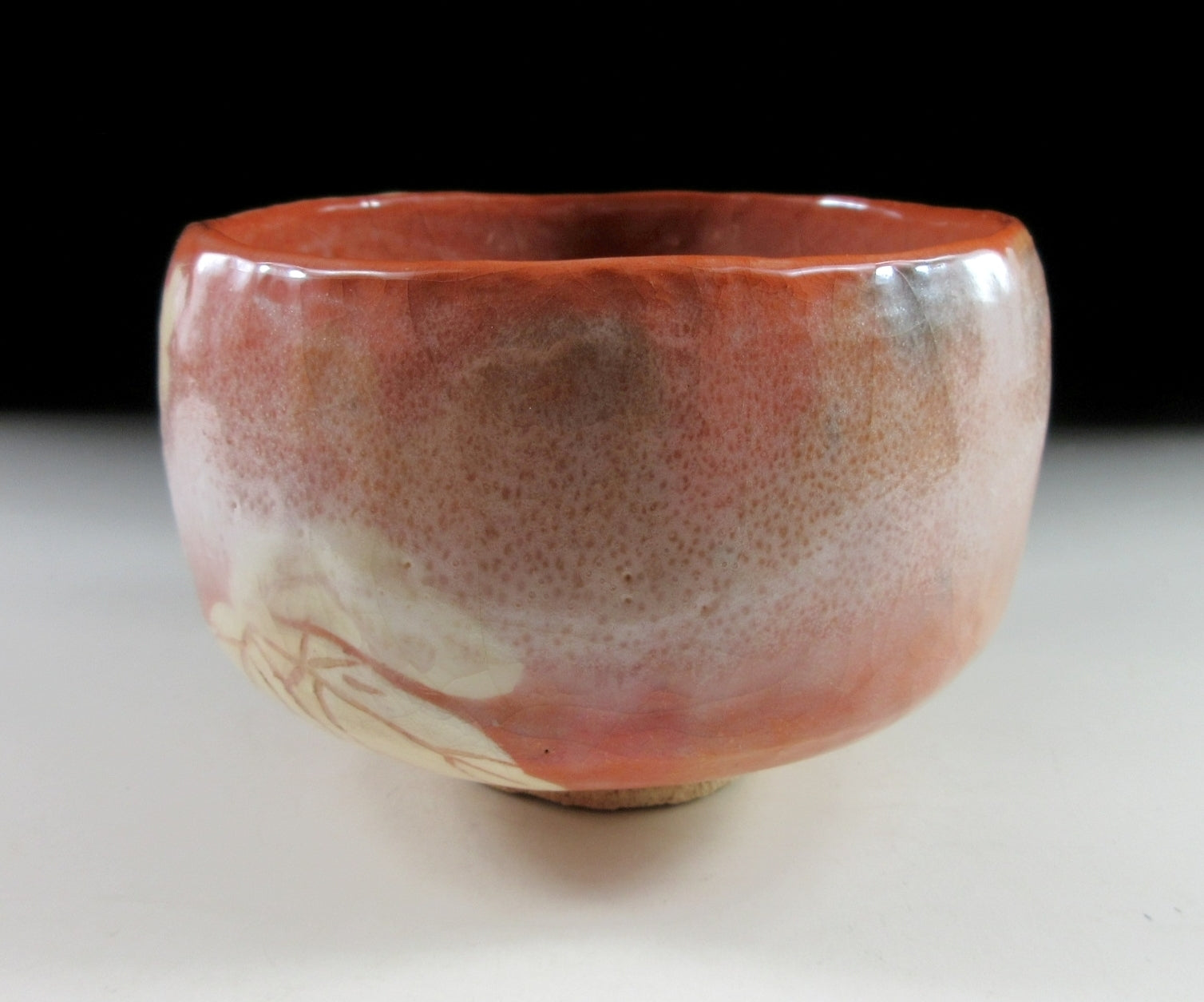This listing is for a splendid aka-raku chawan made around 20 years ago by distinguished potter, Sasaki Shoraku III. It is hand-turned and the front of the bowl is decorated with depictions of ivy. The accompanying profile paper says ‘tsuta no e chawan’ which translates as ‘ivy picture tea bowl’. The bowl is also coated in transparent white glaze, this adds strength to the walls and has the bowl brimming with the freshness of spring. The stamp of the potter can be found on the bottom, and it comes with its original signed wooden storage box. It also comes with a stamped yellow coloured wrapping cloth for when the item is not in use, a Japanese language profile paper about the Sasaki lineage, and a Shoraku pamphlet that includes this particular chawan.