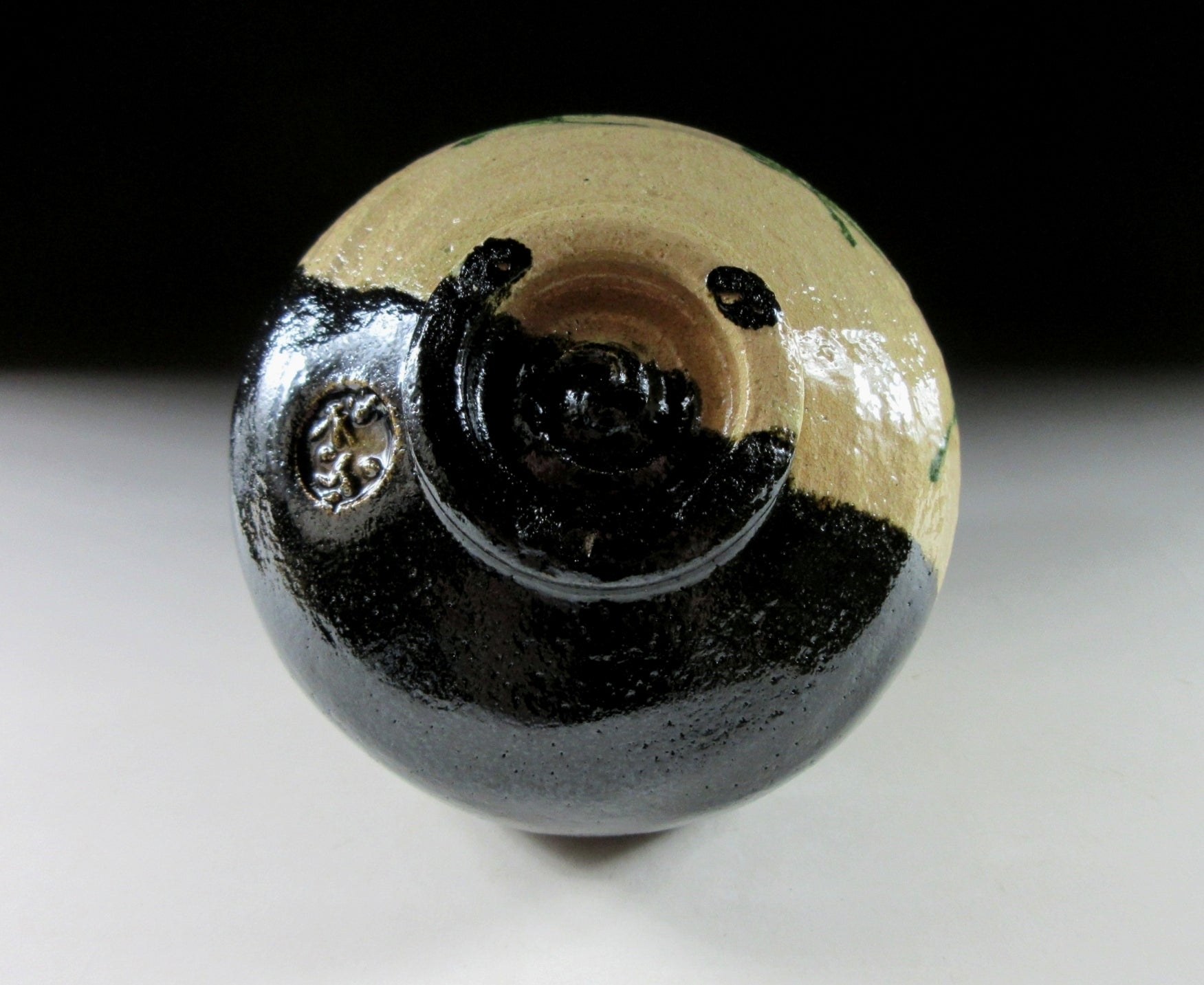 This listing is for a ‘kakewake’ split-toned raku chawan made around 10 years ago by distinguished potter, Sasaki Shoraku III. It is hand-turned and the front is decorated with hand-painted depictions of matsu pine. Pine is a popular motif because it is one of the three friends of winter. Matsu pine, ume and bamboo are admired in both Japan and China as they do not wither against the cold of winter. All three plants are regarded as auspicious and are believed to symbolise endurance and strength. The stamp of the potter can be found on the bottom, and it comes with its original paper storage box.