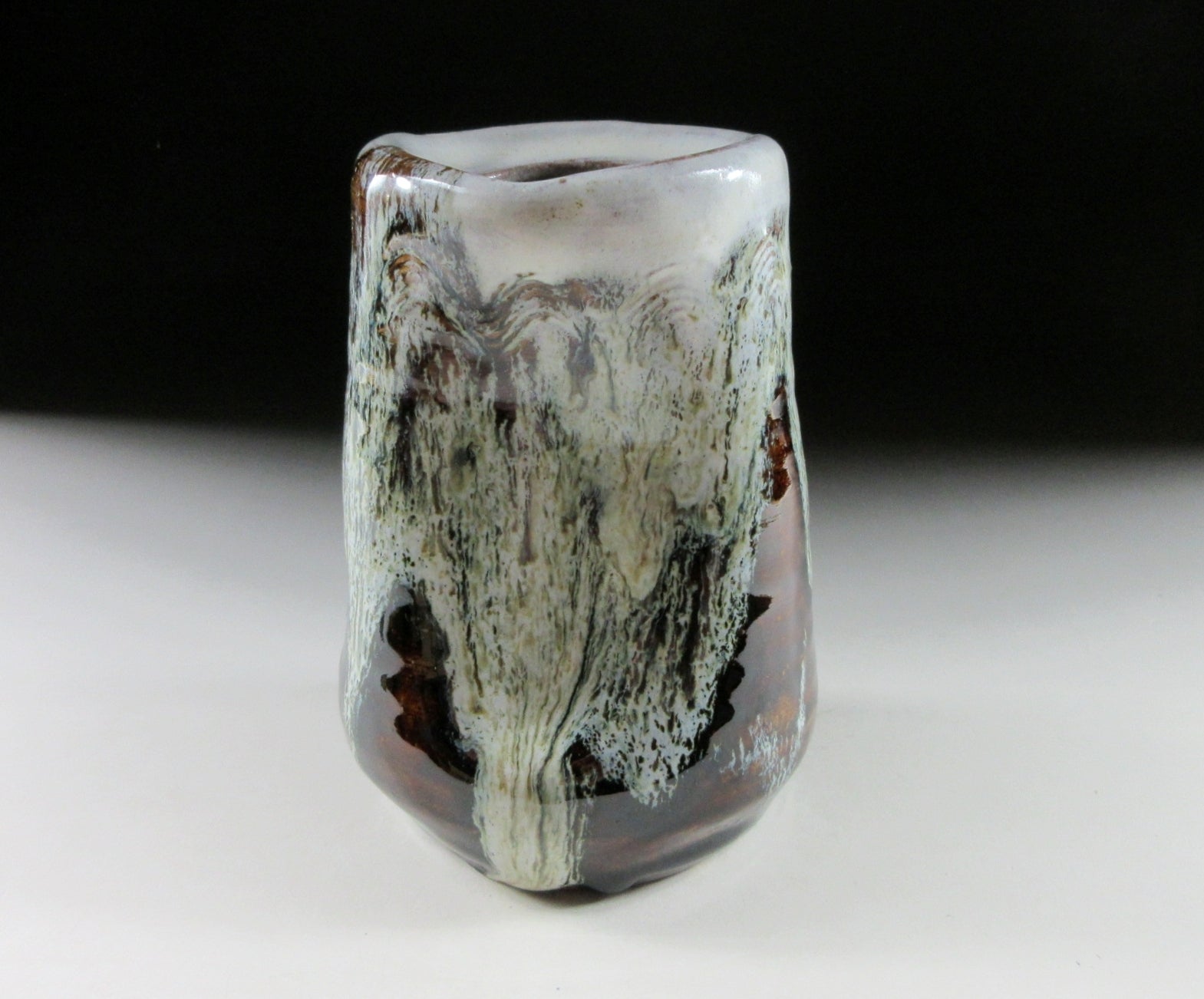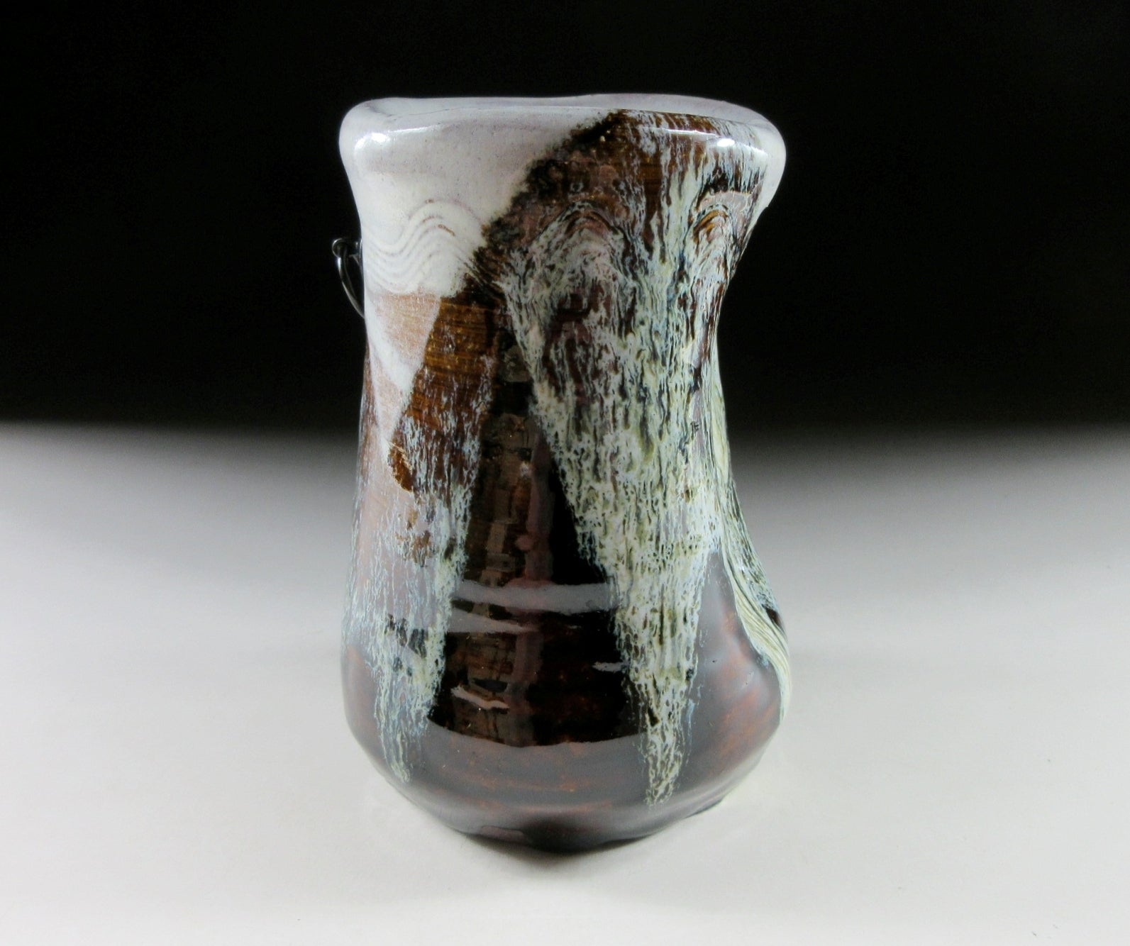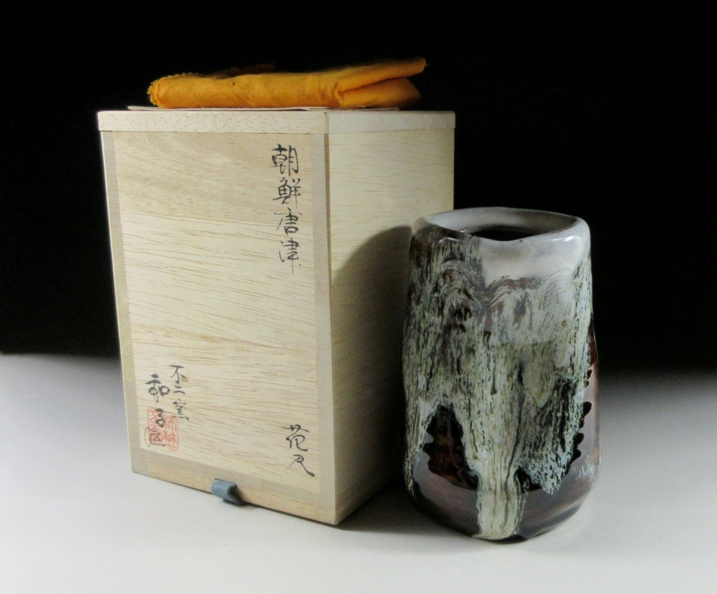 This listing is for a small Mino-ware hanging vase made around 10 years ago by female potter, Sato Kazuko. It is wheel-thrown and then moulded by hand to create a wonderfully organic landscape of form and colour. It has a hook on the back allowing it to be hung on the wall, and it also features a kushigaki comb pattern. The kushigaki pattern consists of multiple parallel lines engraved into the surface using a comb-like tool. Moreover this little gem has what is known as an uzukumaru shape, which means dented or hunched over. The opening is wide enough to accommodate a few short stemmed flowers, and the stamp of the potter can be found on the bottom. It comes with its original signed wooden storage box, a turmeric coloured wrapping cloth for when the item is not in use, as well as a Japanese language profile paper about the potter.