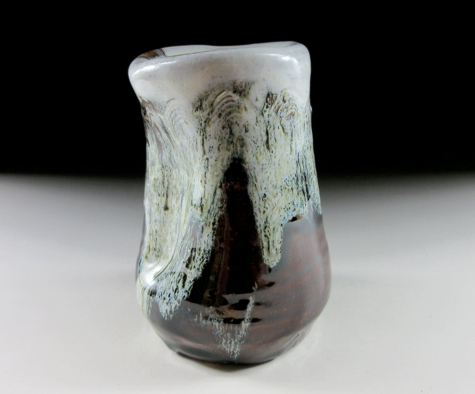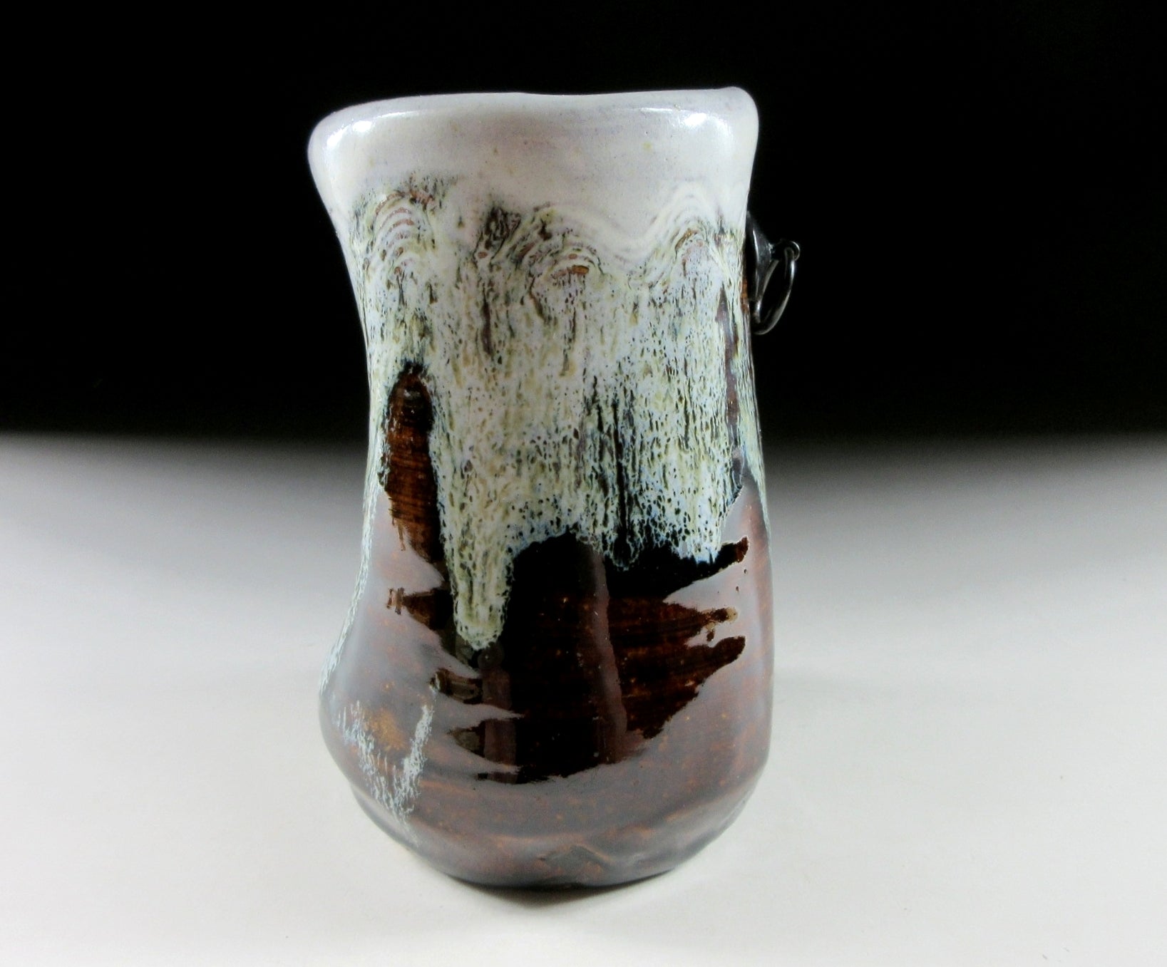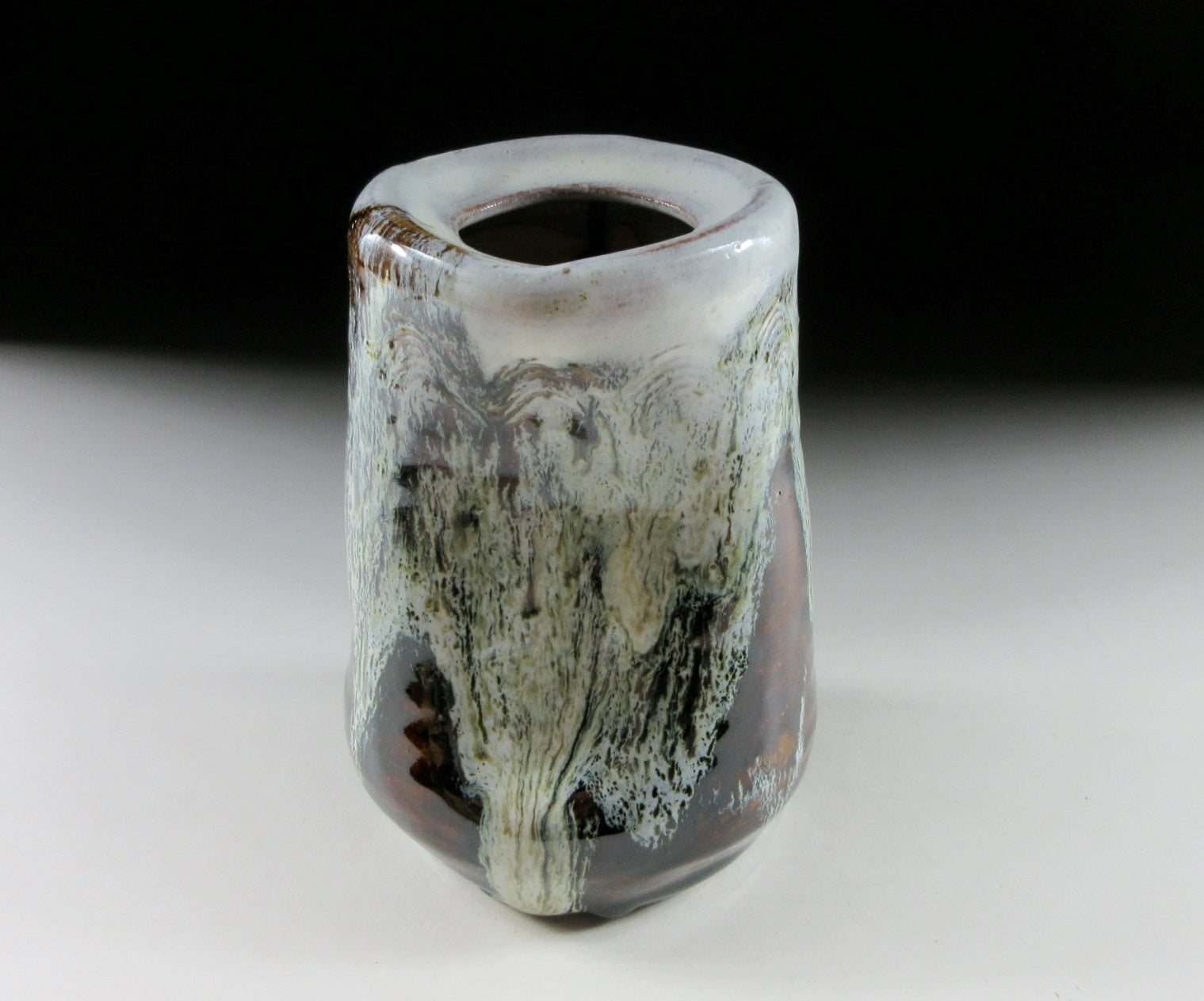 This listing is for a small Mino-ware hanging vase made around 10 years ago by female potter, Sato Kazuko. It is wheel-thrown and then moulded by hand to create a wonderfully organic landscape of form and colour. It has a hook on the back allowing it to be hung on the wall, and it also features a kushigaki comb pattern. The kushigaki pattern consists of multiple parallel lines engraved into the surface using a comb-like tool. Moreover this little gem has what is known as an uzukumaru shape, which means dented or hunched over. The opening is wide enough to accommodate a few short stemmed flowers, and the stamp of the potter can be found on the bottom. It comes with its original signed wooden storage box, a turmeric coloured wrapping cloth for when the item is not in use, as well as a Japanese language profile paper about the potter.