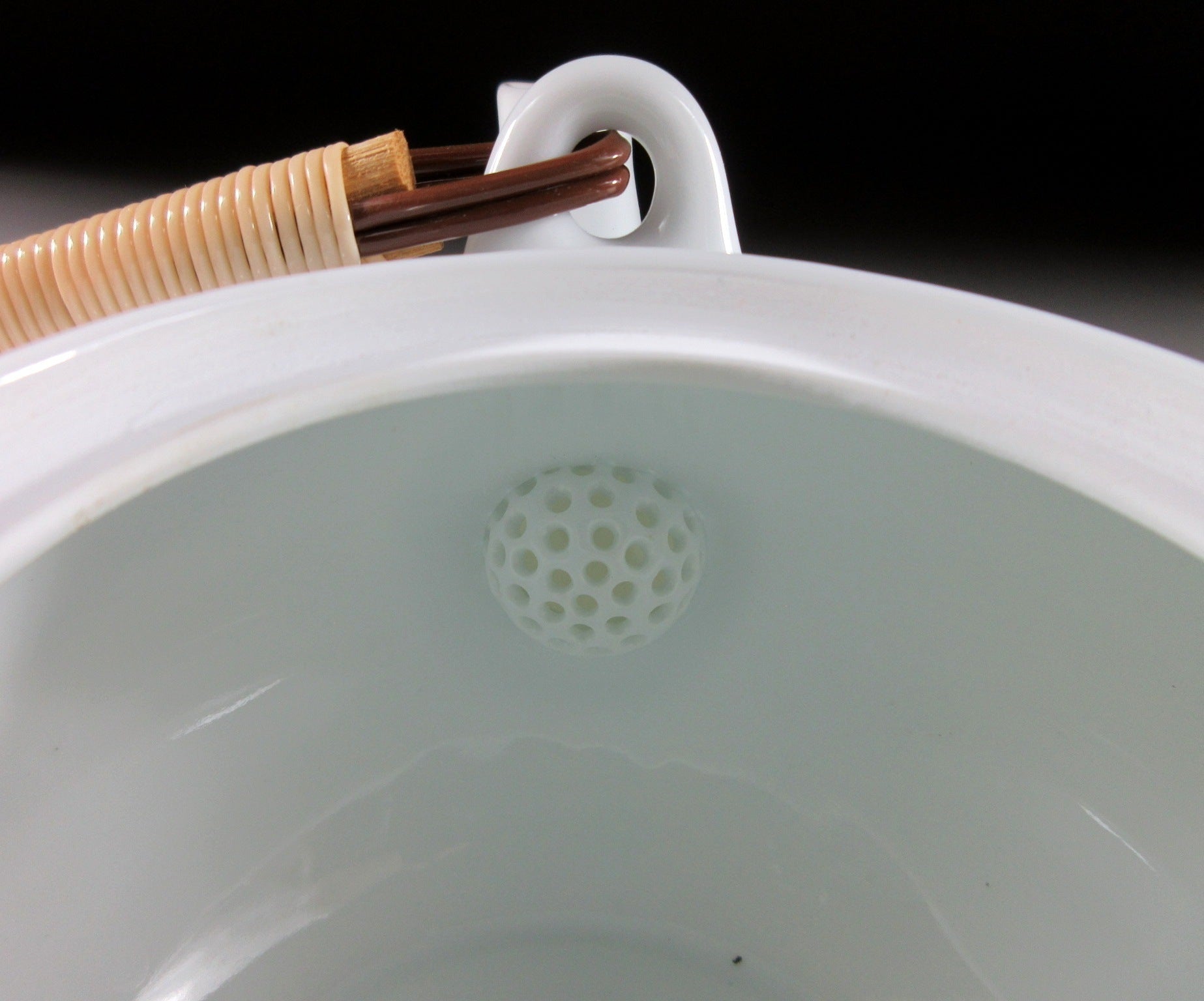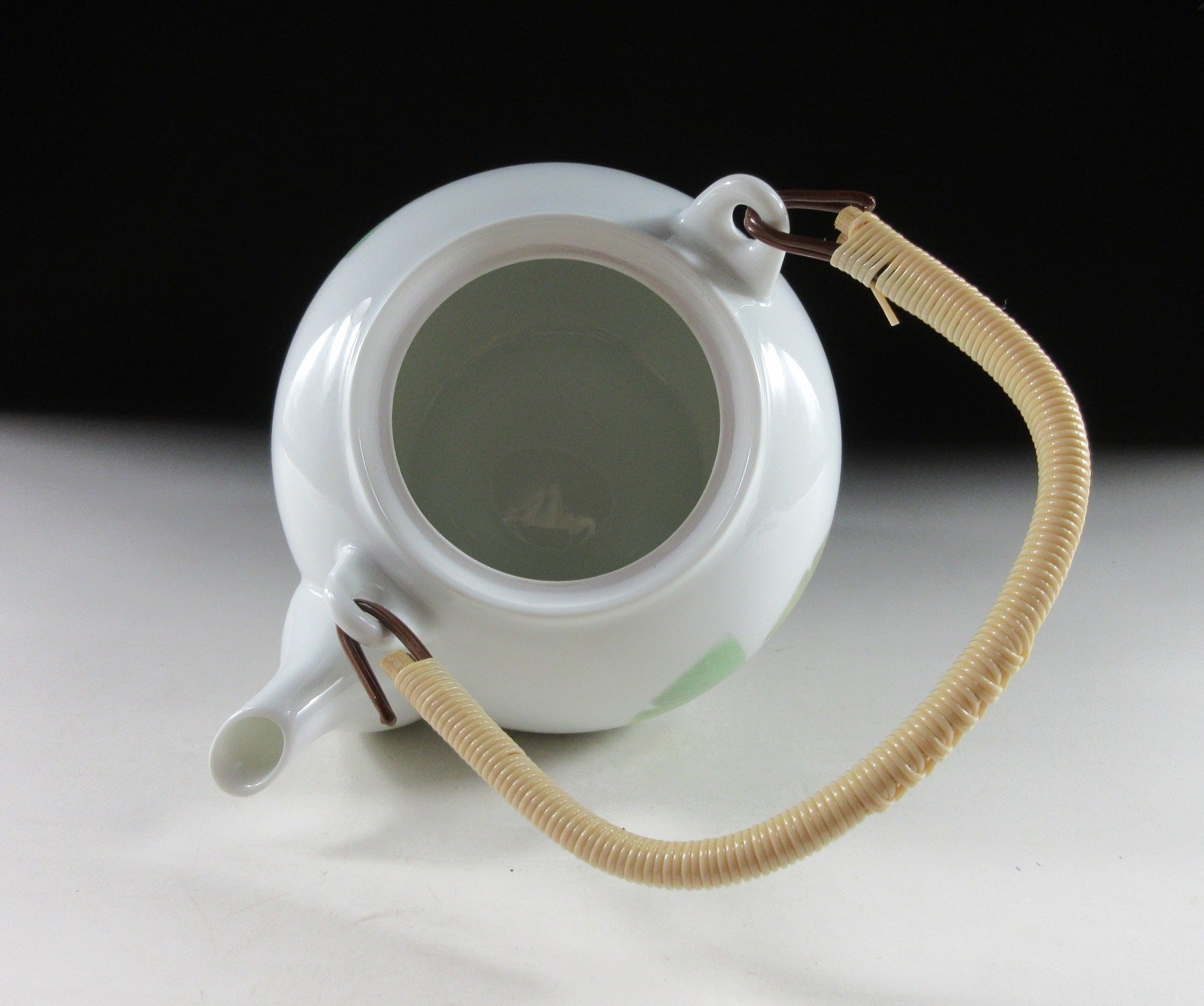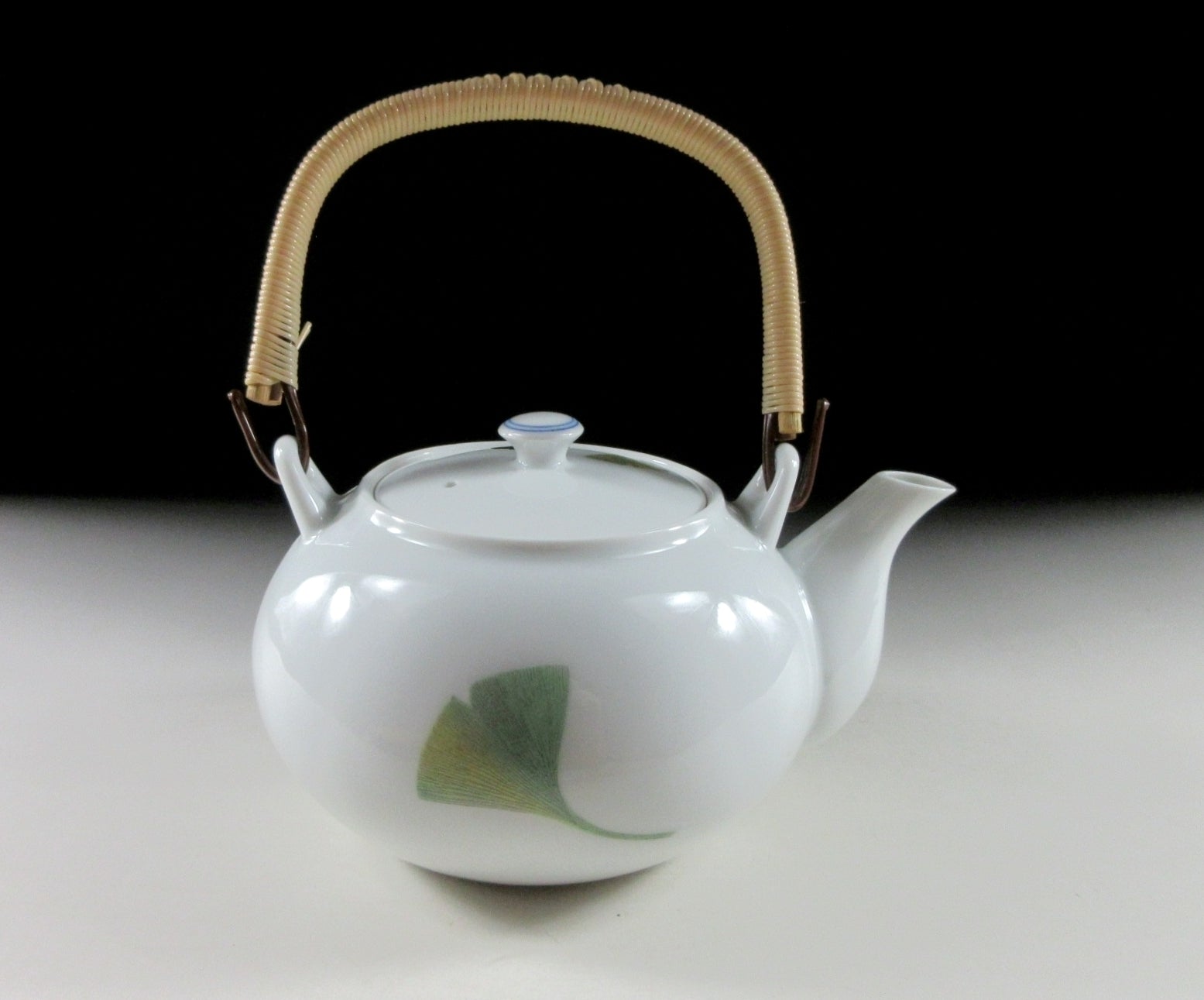 This listing is for an Arita-ware ‘ichounoha’ teapot made around 5-10 years ago by Seibei Gama. It is made of porcelain and features soft green ginkgo leaves against a solid white background. The handle can be easily removed for cleaning purposes, and it has a nice clean interior. It has a capacity of 500ml, plus a built-in strainer to prevent tea leaves from pouring with the tea. It’s a very pleasant design for year round use, particularly during summer and early autumn. The signature of the kiln can be found under the lid.