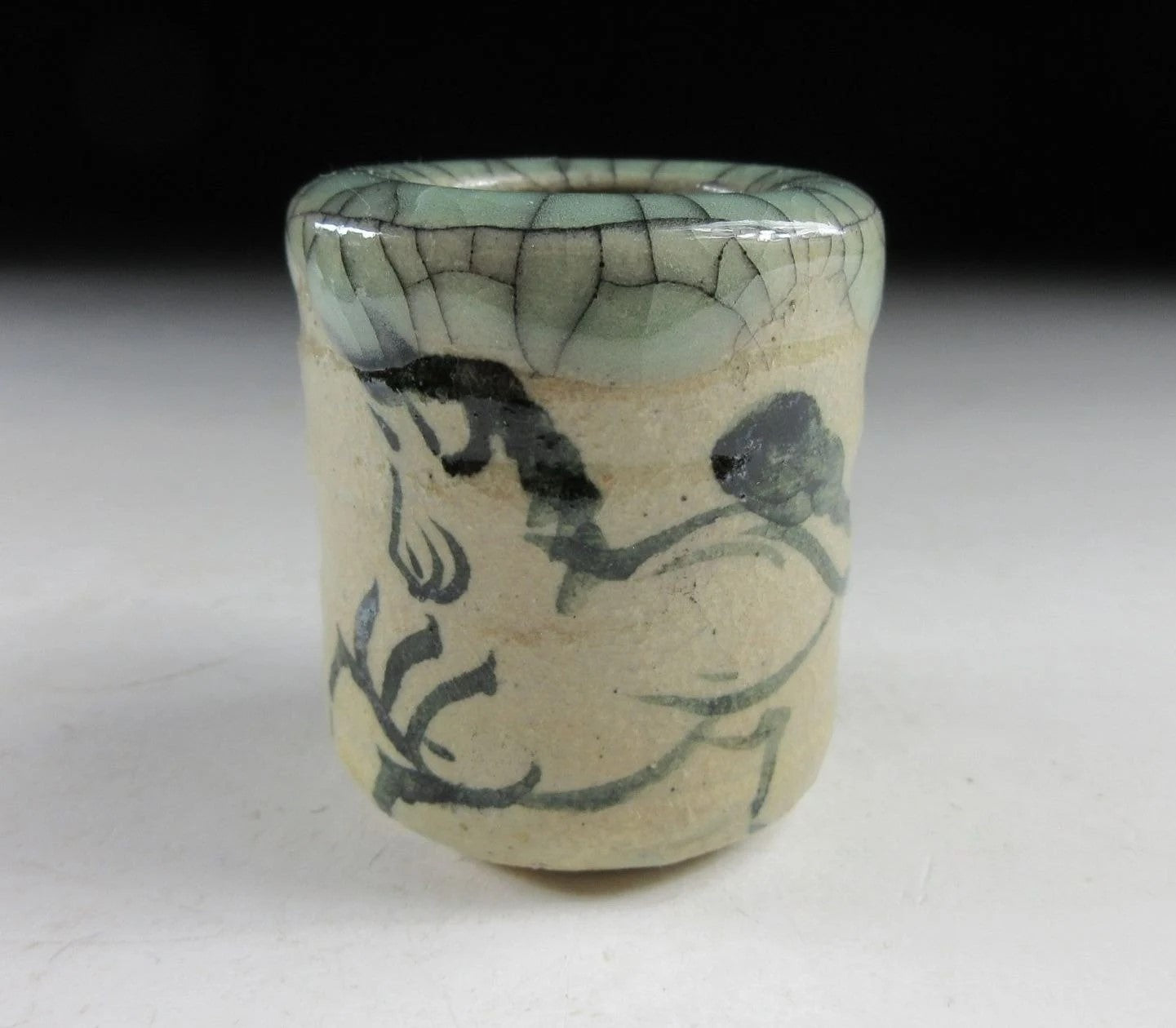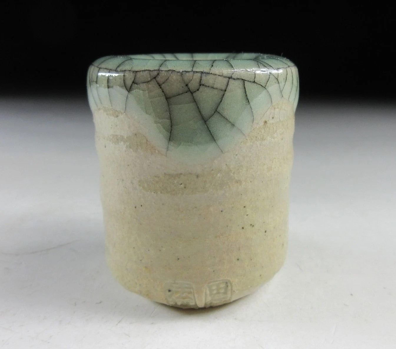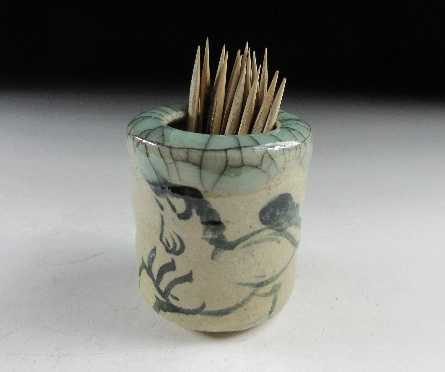 This listing is for a Soma-ware toothpick holder made around 20 years ago by Seijiuemon Tashiro XV. The front is decorated with a hashirigoma galloping horse motif, and the rim features Aohibi crackled glaze. The potter stamps on the bottom of the toothpick holder in this listing have been registered as official stamps for the Seijiuemon family of potters since 1907.