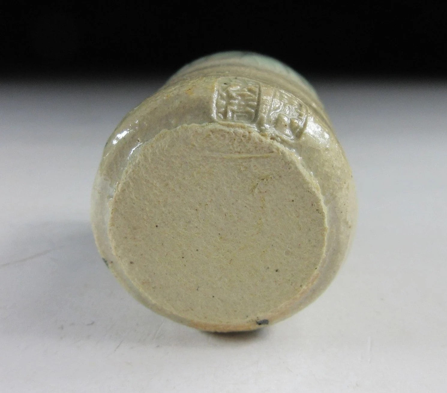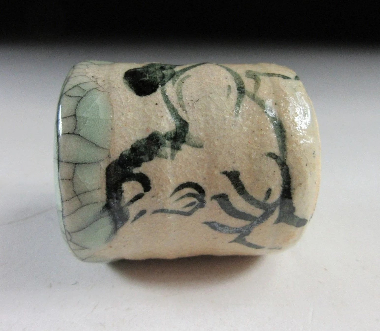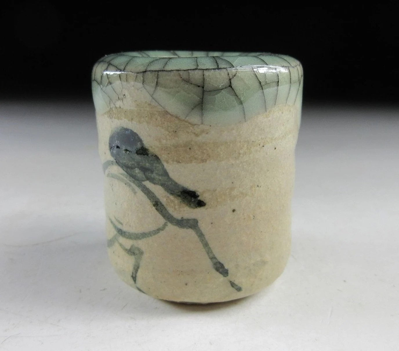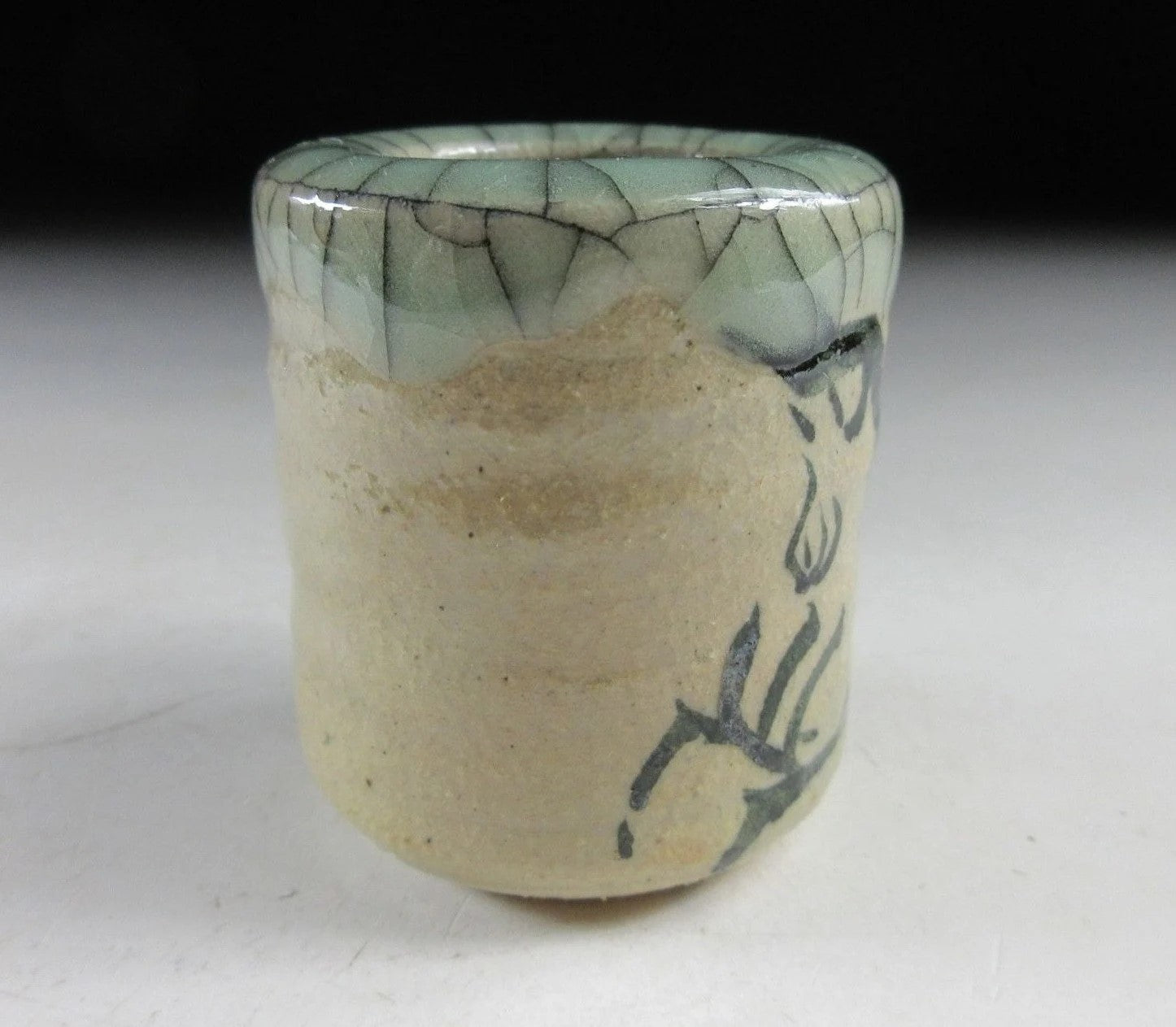 This listing is for a Soma-ware toothpick holder made around 20 years ago by Seijiuemon Tashiro XV. The front is decorated with a hashirigoma galloping horse motif, and the rim features Aohibi crackled glaze. The potter stamps on the bottom of the toothpick holder in this listing have been registered as official stamps for the Seijiuemon family of potters since 1907.