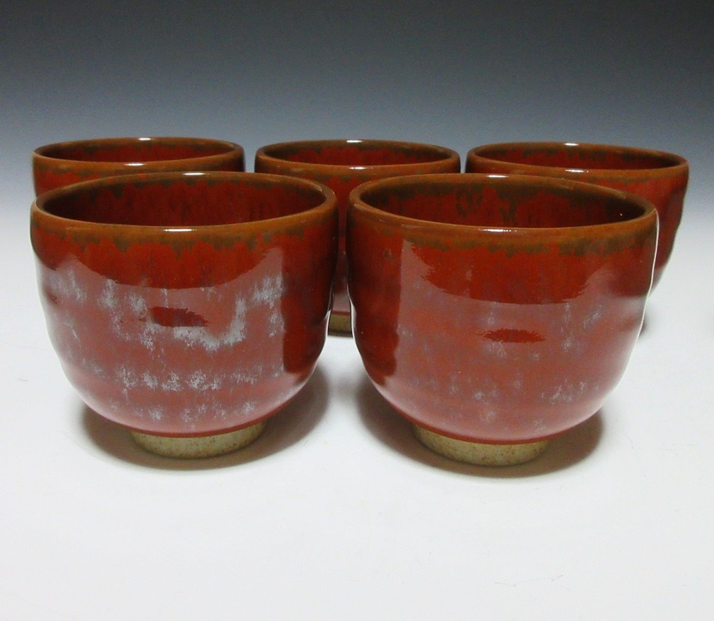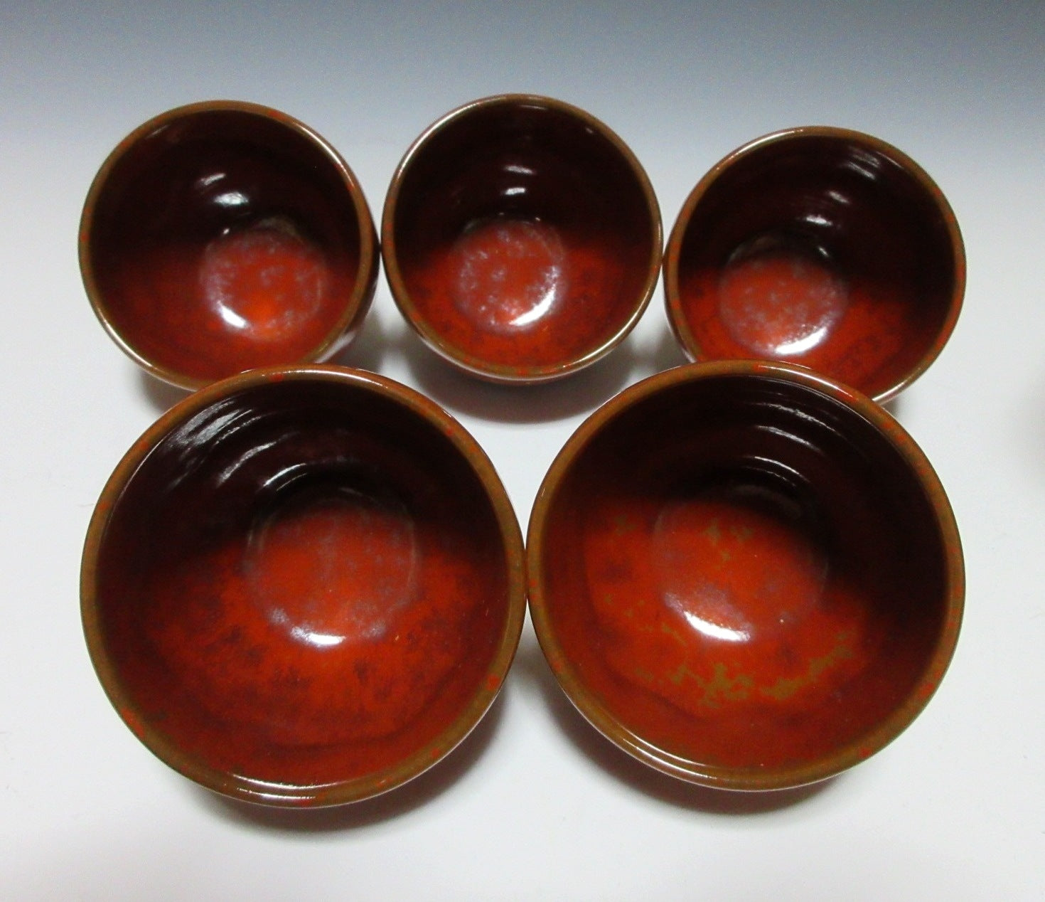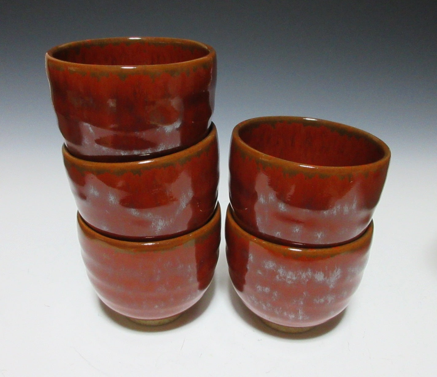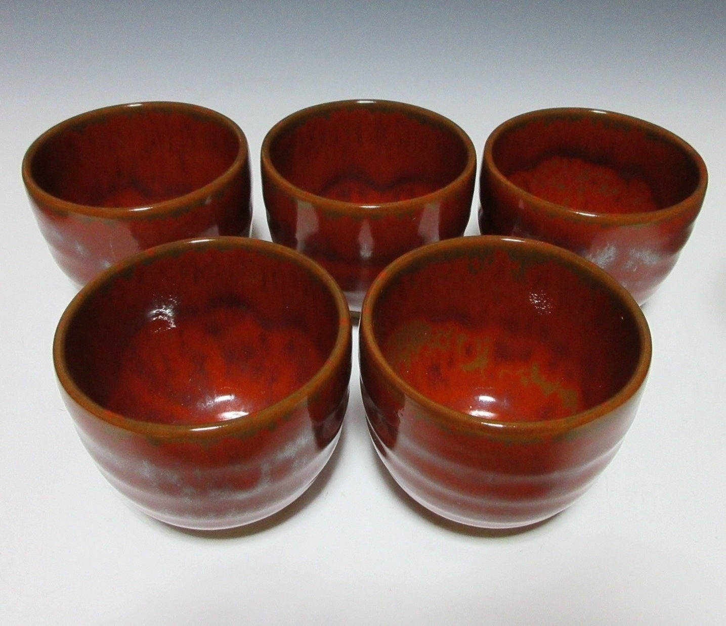 This listing is for a set of five Echizen-ware sencha tea cups made around 20 years ago. They are wheel-thrown and each cup is coated in rust red tenmoku glaze. The speckled appearance of the clay is due to the high iron content in the clay, and these cups are made of high-fired stoneware making them suitable for daily use. The signature of the potter can be found on the bottom, sorry no box for these.