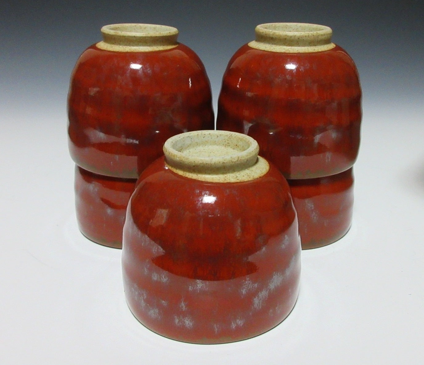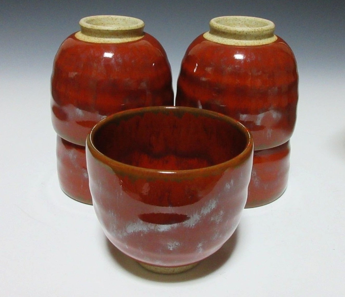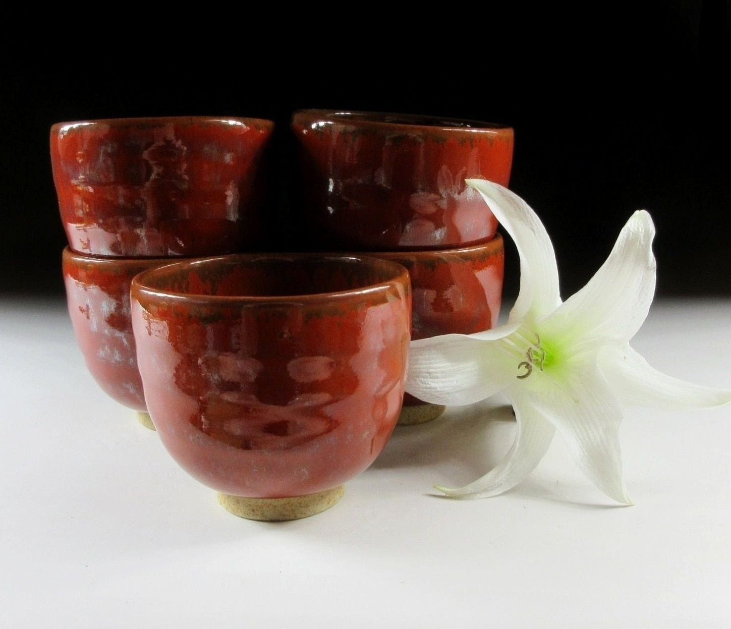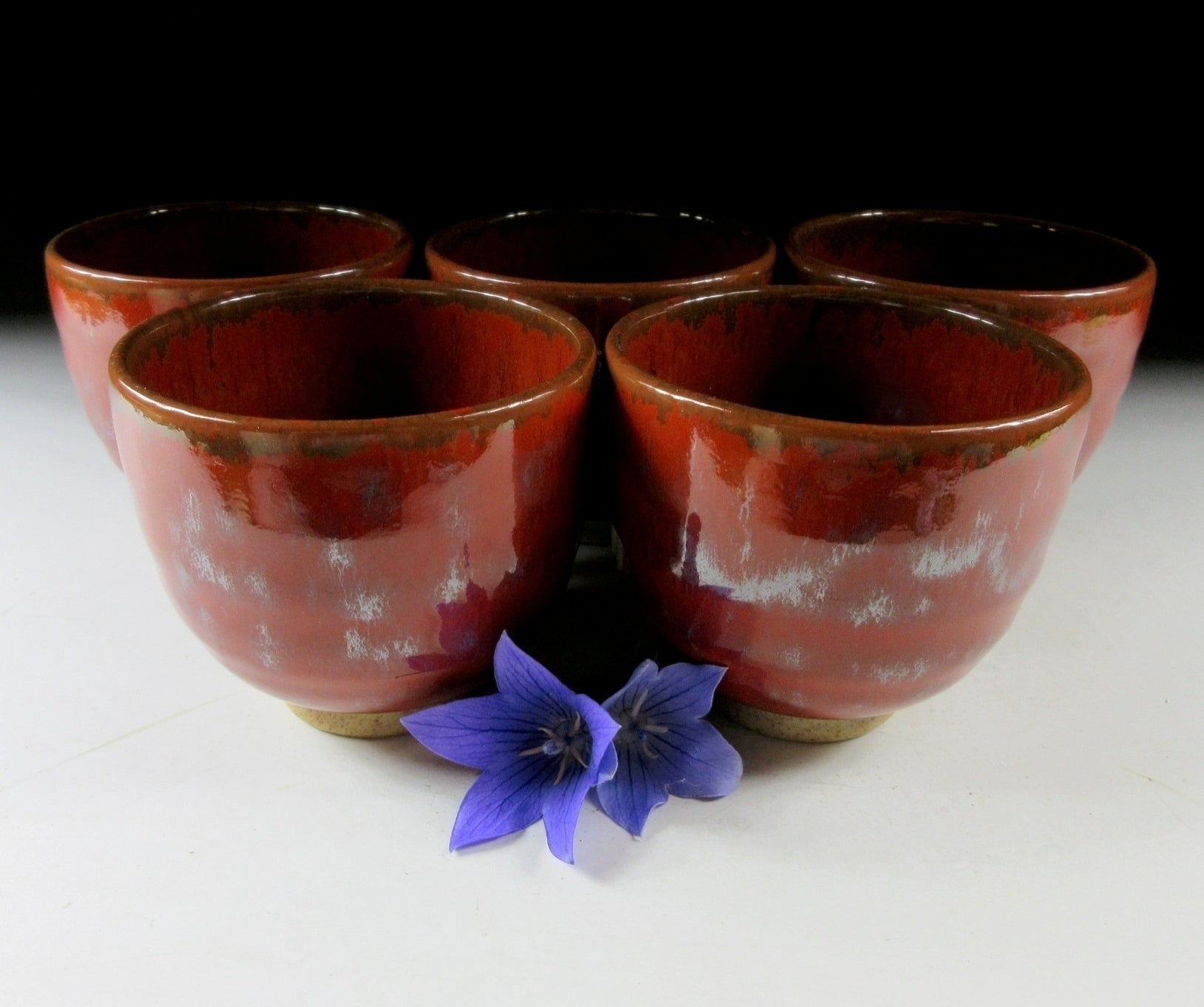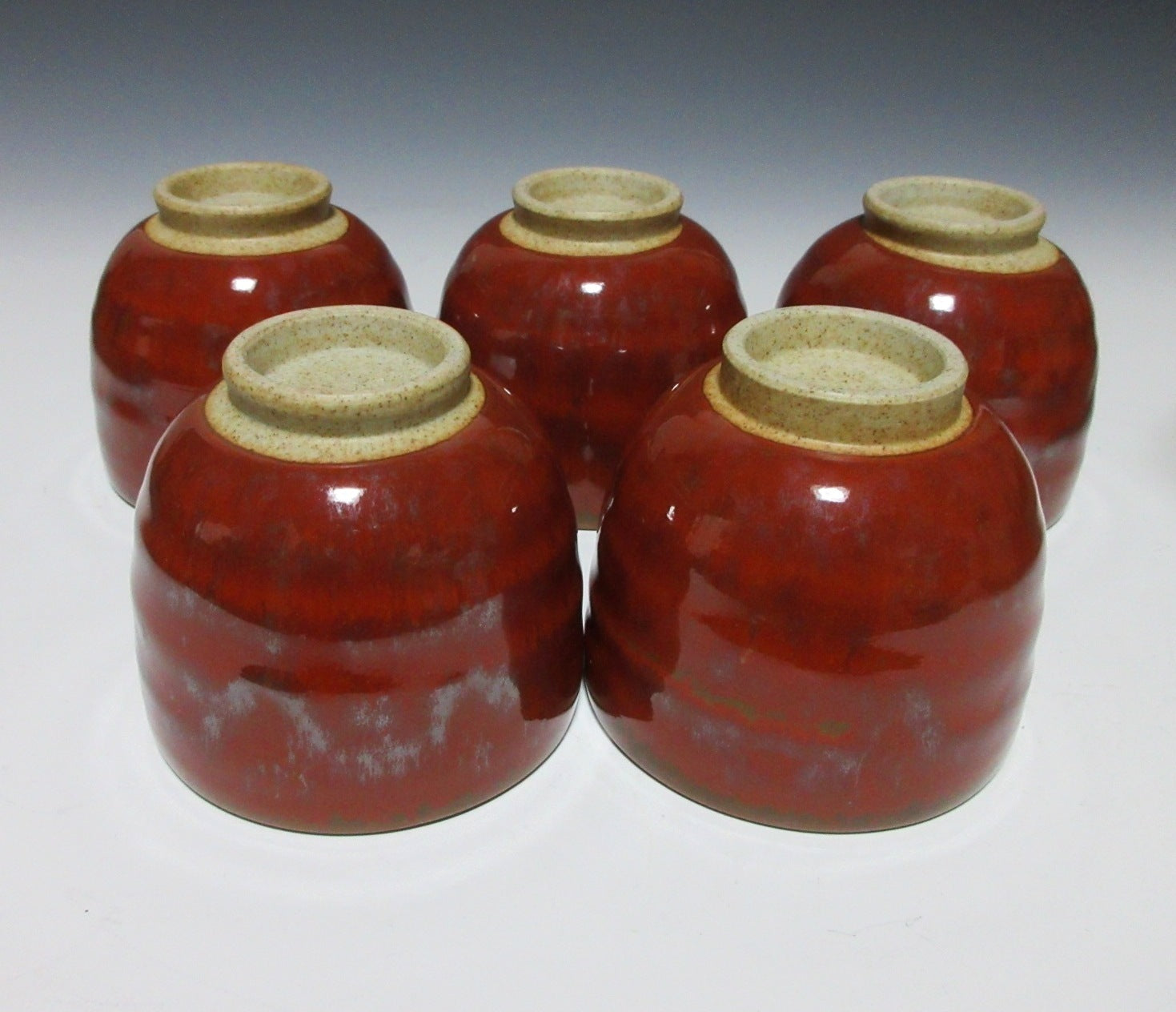 This listing is for a set of five Echizen-ware sencha tea cups made around 20 years ago. They are wheel-thrown and each cup is coated in rust red tenmoku glaze. The speckled appearance of the clay is due to the high iron content in the clay, and these cups are made of high-fired stoneware making them suitable for daily use. The signature of the potter can be found on the bottom, sorry no box for these.