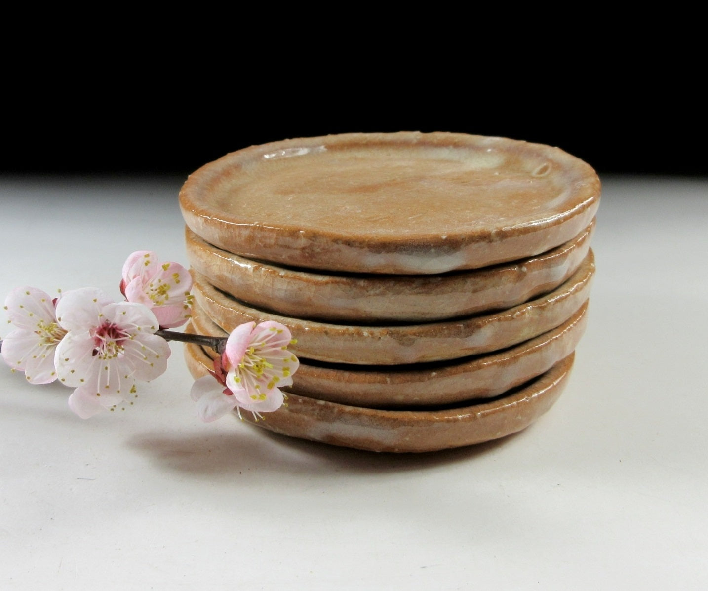 This listing is for a set of five Hagi-ware chataku made around 20 years ago. They are made of gritty stoneware clay and coated in semi-transparent white glaze. The low ‘walls’ around the edge prevent spills, and their glazed top makes them less likely to absorb moisture. The stamp of the kiln can be found on the bottom of each piece.