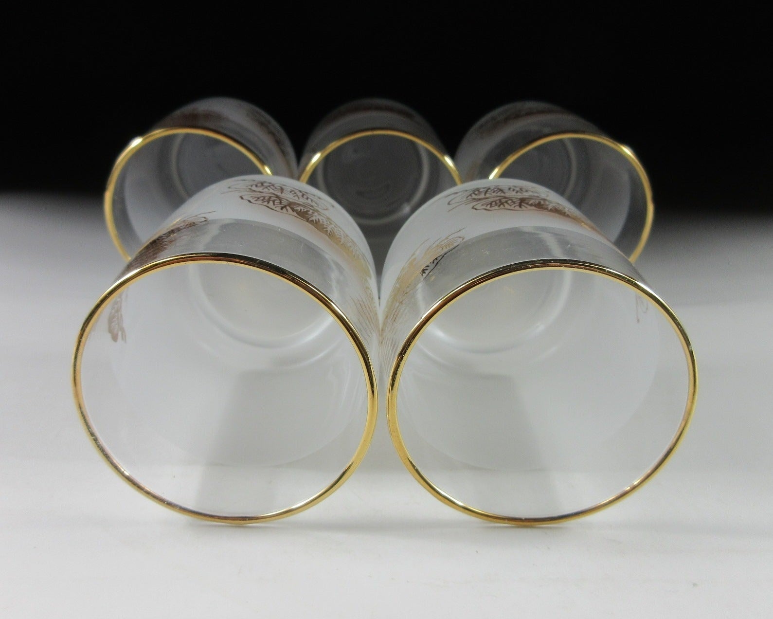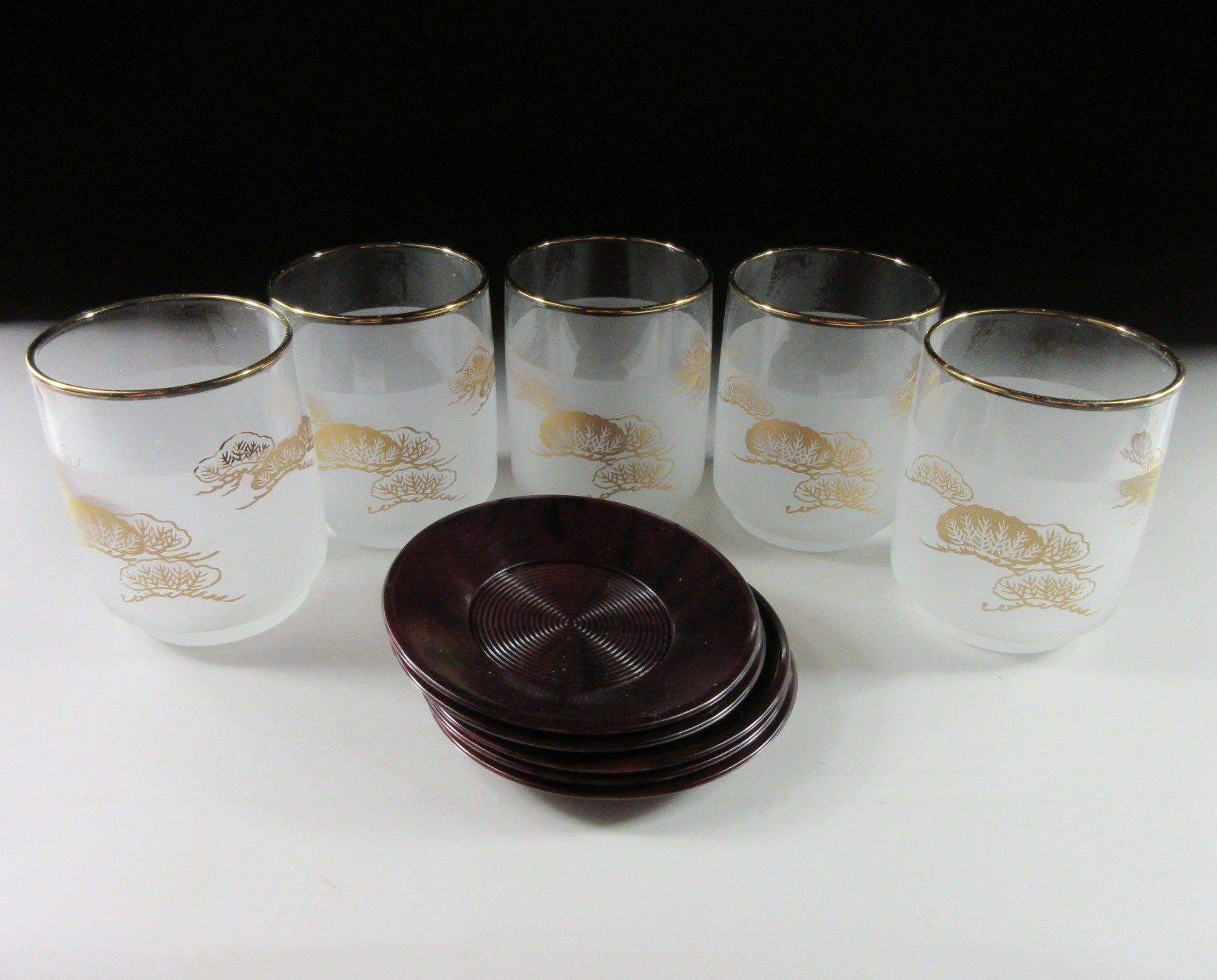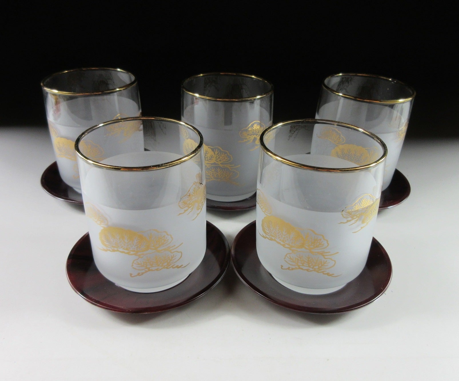 This listing is for a set of five iced tea glasses made around 40 years ago by Sasaki Glass. The set includes five retro style glasses and five chataku drink coasters. The chataku are made of plastic, and each glass is decorated gold enamel depictions of matsu pine over frosted glass. The rims are trimmed with gold enamel and each glass holds 150ml. The set comes with its original paper storage box.