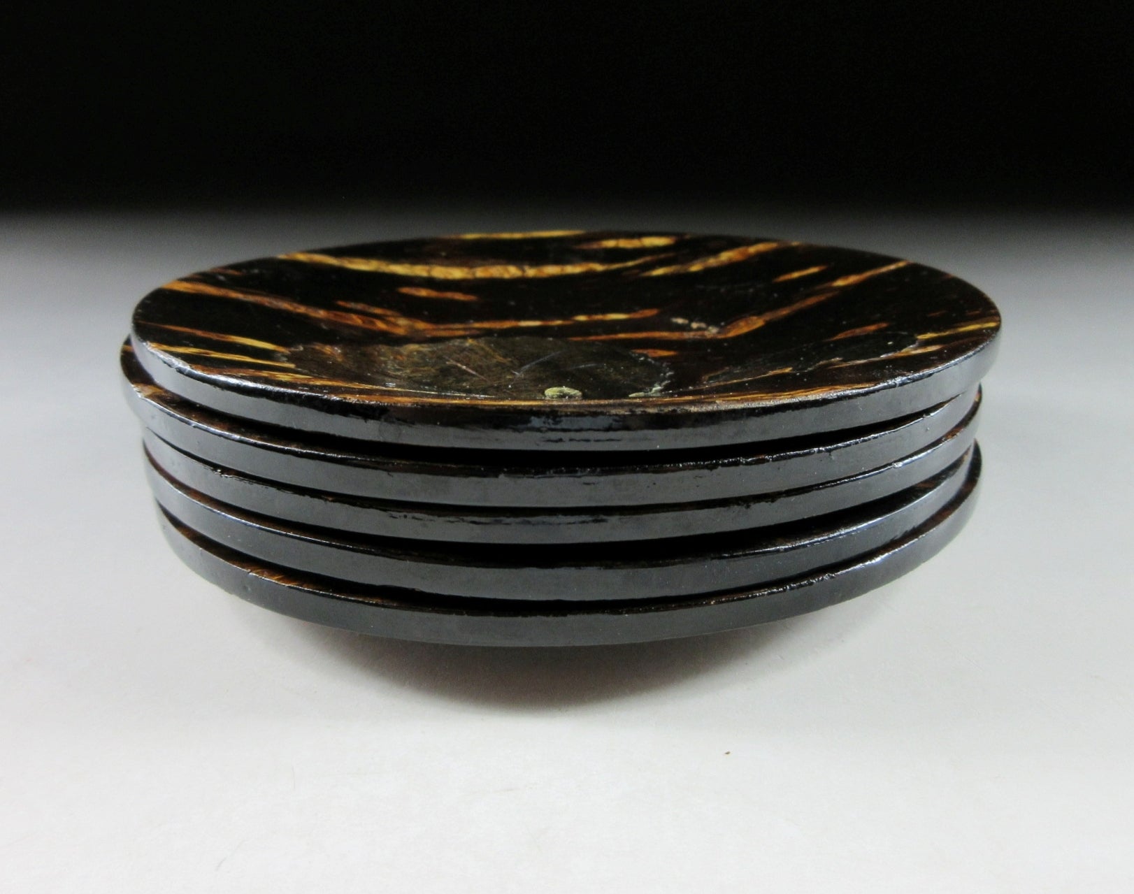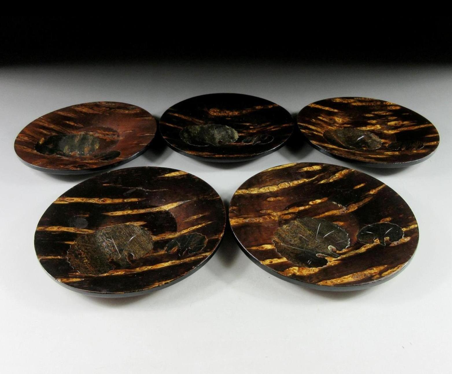 This listing is for a set of five Kaba-zaiku cherry bark chataku. Each piece is decorated with butterbur leaves that have been carved from cherry bark. Butterbur leaves are a very popular form of decoration for kaba-zaiku products, and in some cases real butterbur leaves are used. Each piece has a beautiful smooth finish and their rich dark colour makes them suitable for any of the four seasons. *PLEASE NOTE THAT THE TEA CUP IS NOT INCLUDED IN THIS LISTING.