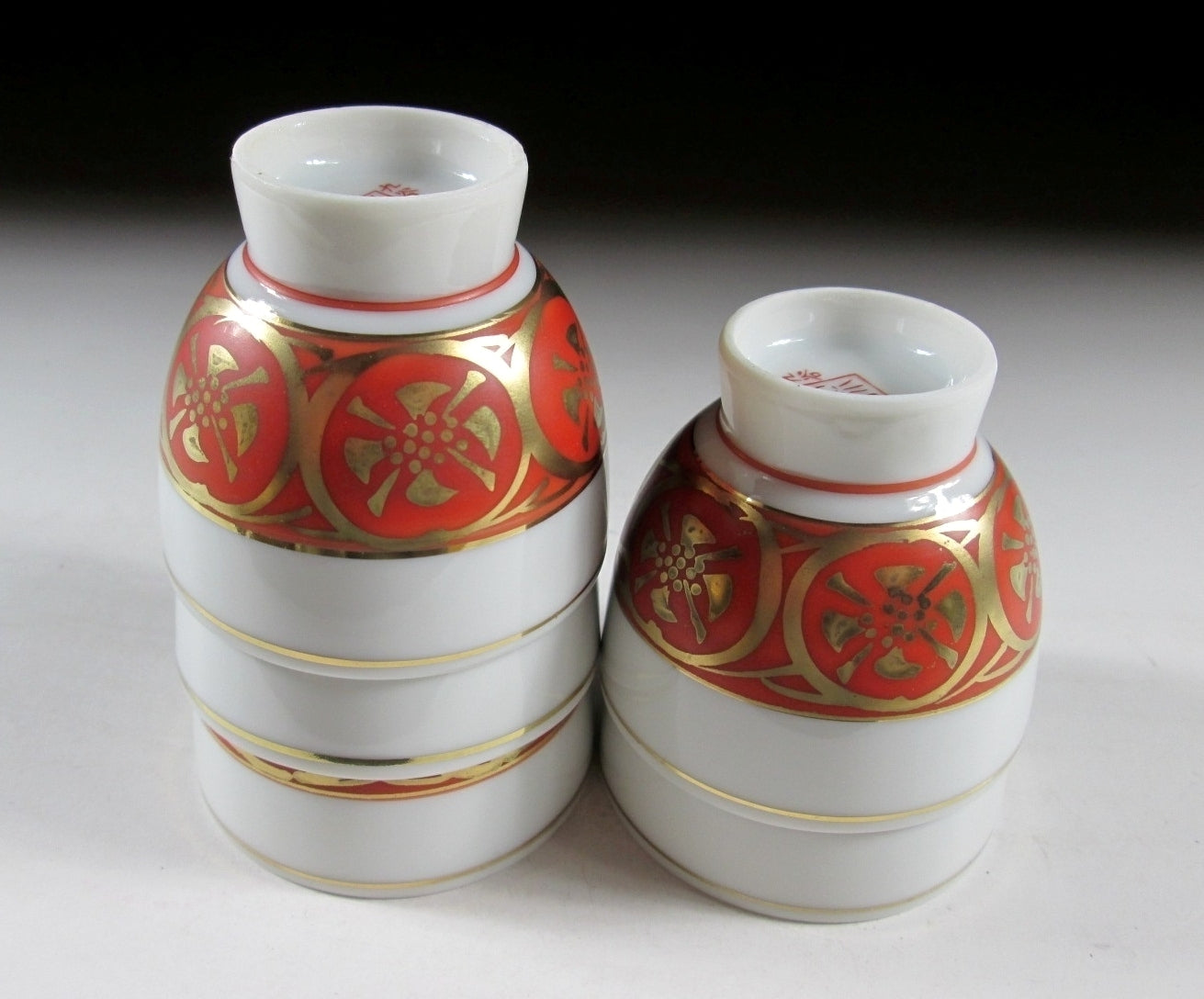 This listing is for a set of five Kutani-ware ochoko sake cups made around 30 years ago by Kutani Sanei kiln. They are made of porcelain and each piece is decorated with a pattern of red and gold overglaze. Ochoko are ‘one gulp cups’ that are typically very small in size, please check the measurements carefully before ordering. The signature of the kiln can be found on the bottom.