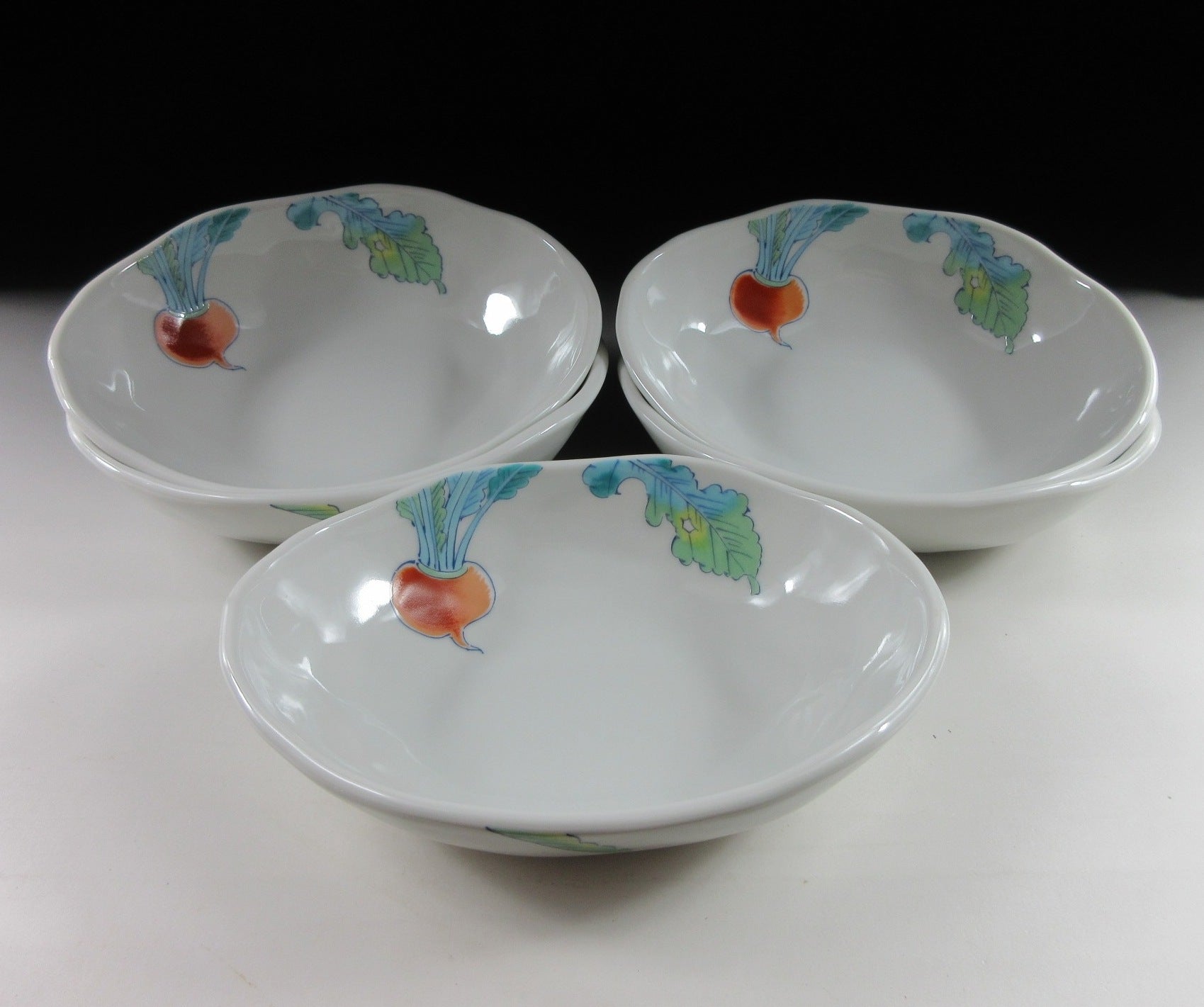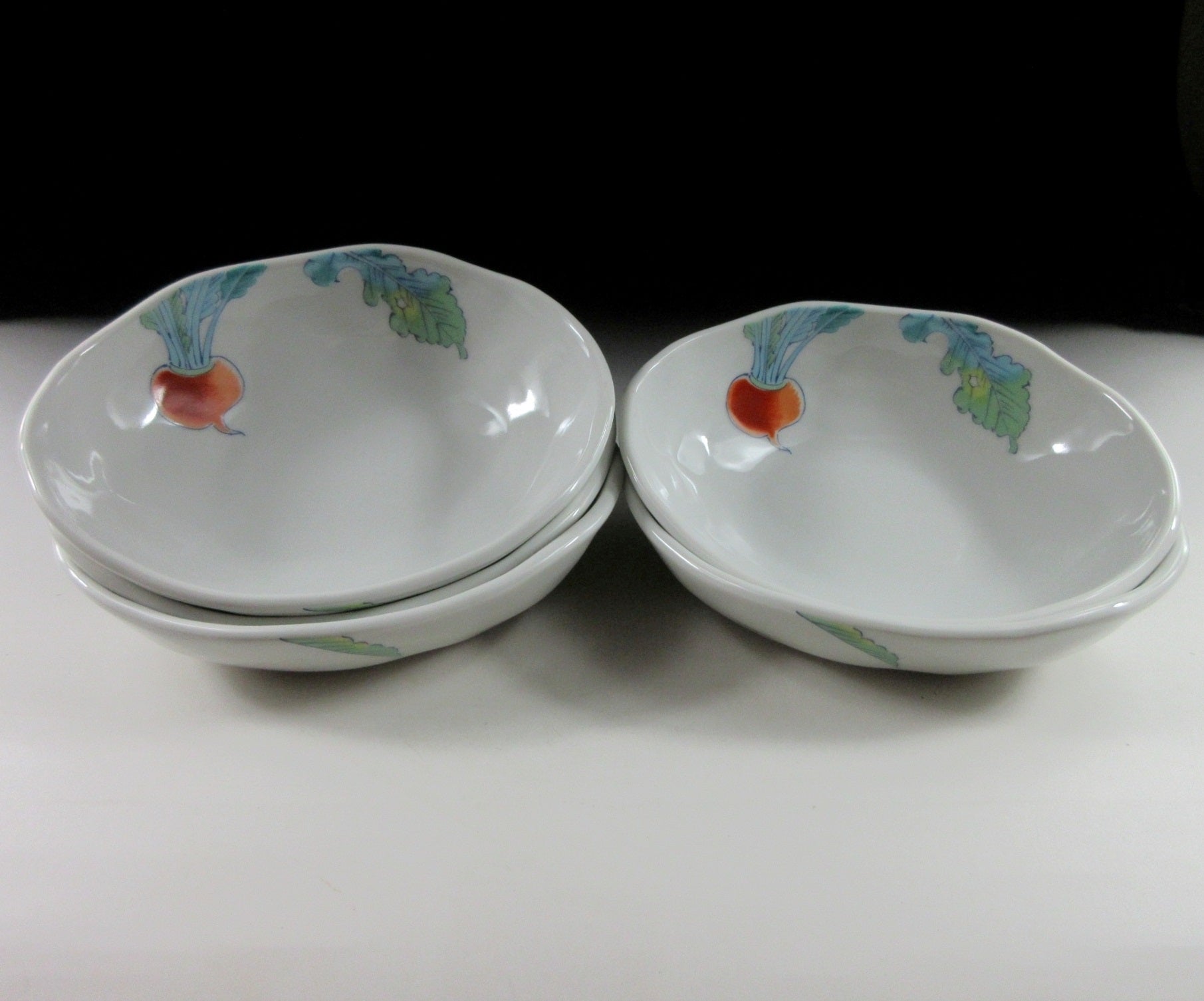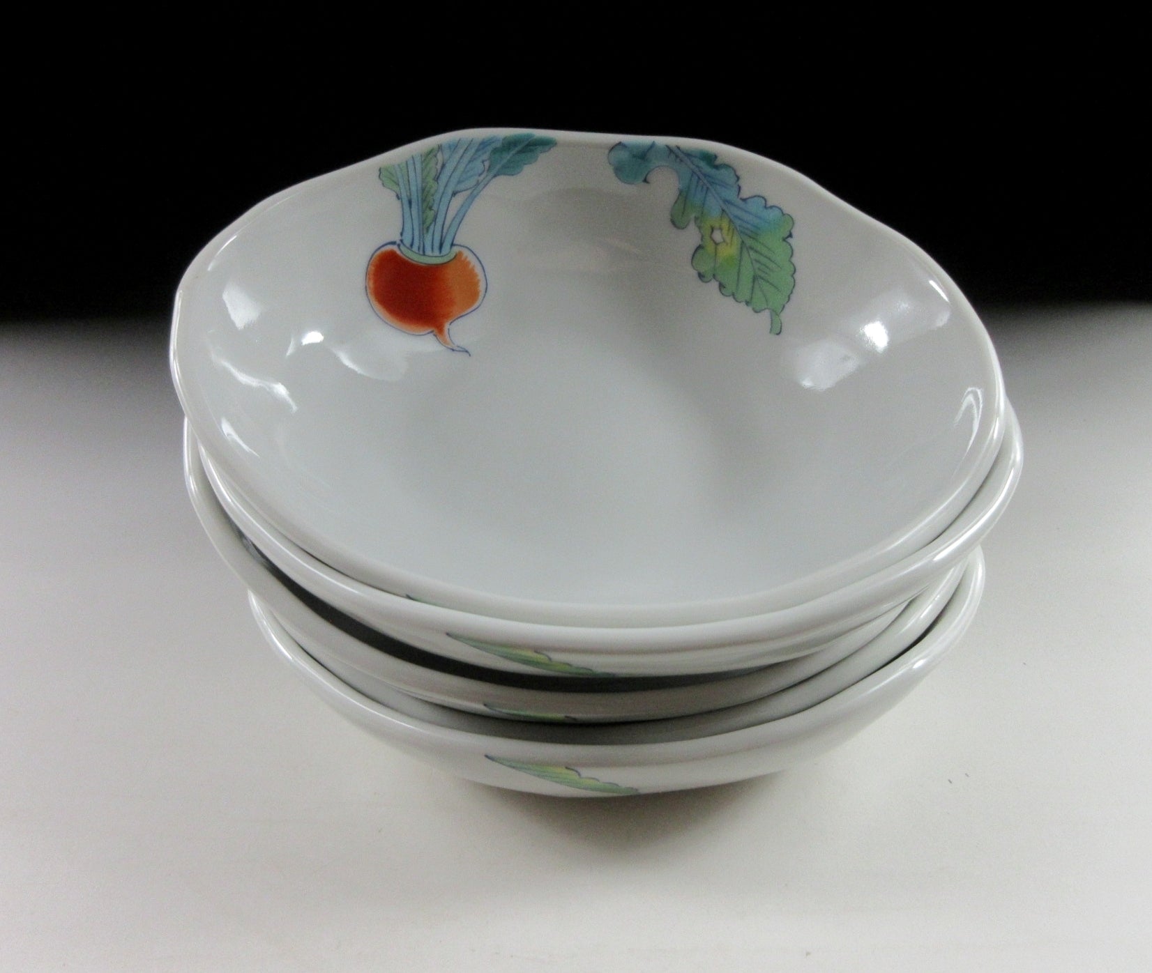 This listing is for a set of five Kutani-ware bowls. They are made of porcelain and each piece is decorated with a small red turnip over a milky white glazed base. Turnips are a popular pickling vegetable in Japan, and they’re also a common motif for tableware. This set is ideal for intended for serving tsukemono pickled vegetables, or small servings of sashimi. They would also be perfect for salad or fruit. The mark of the kiln can be found on the bottom, and they come with their original paper storage box.