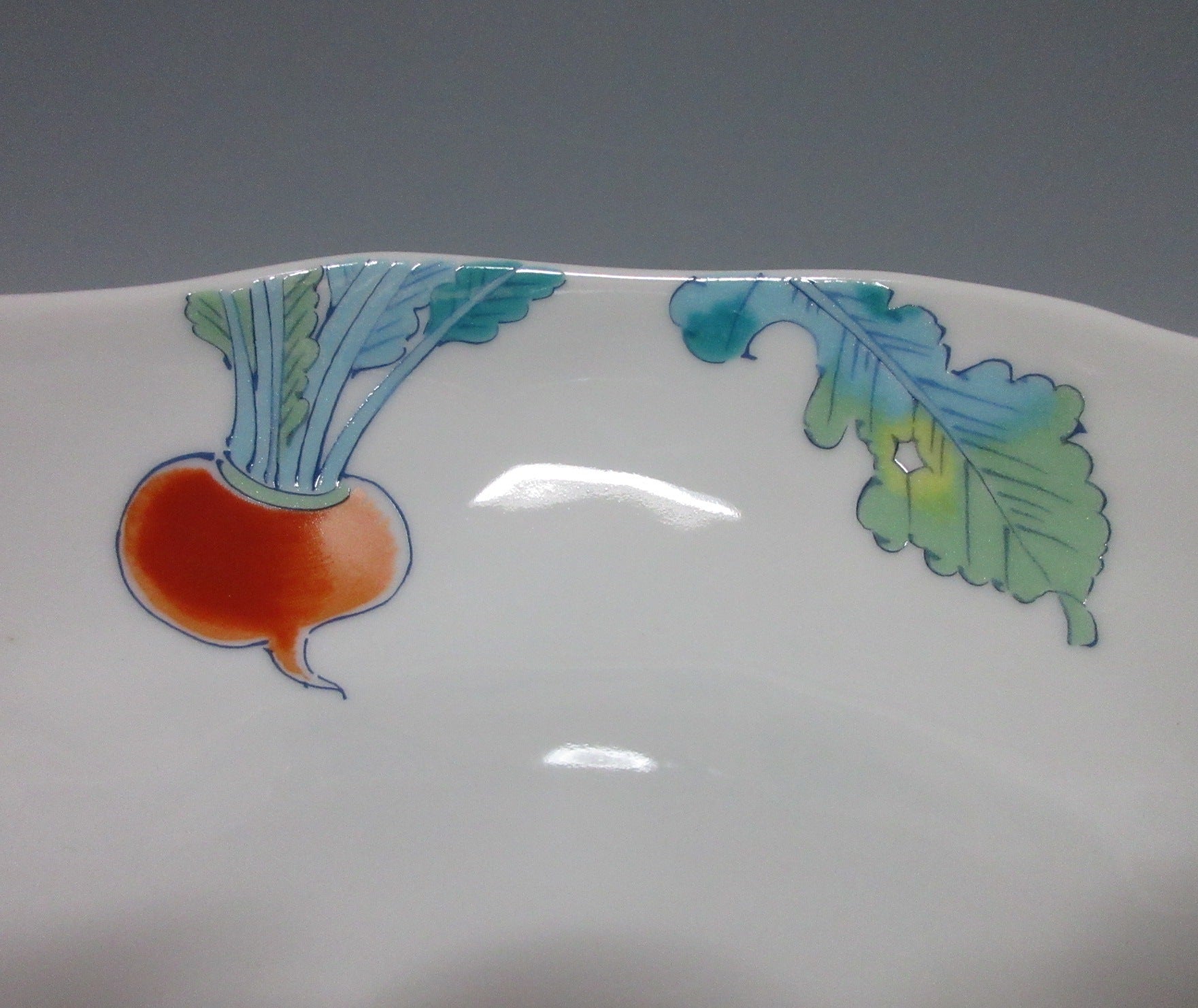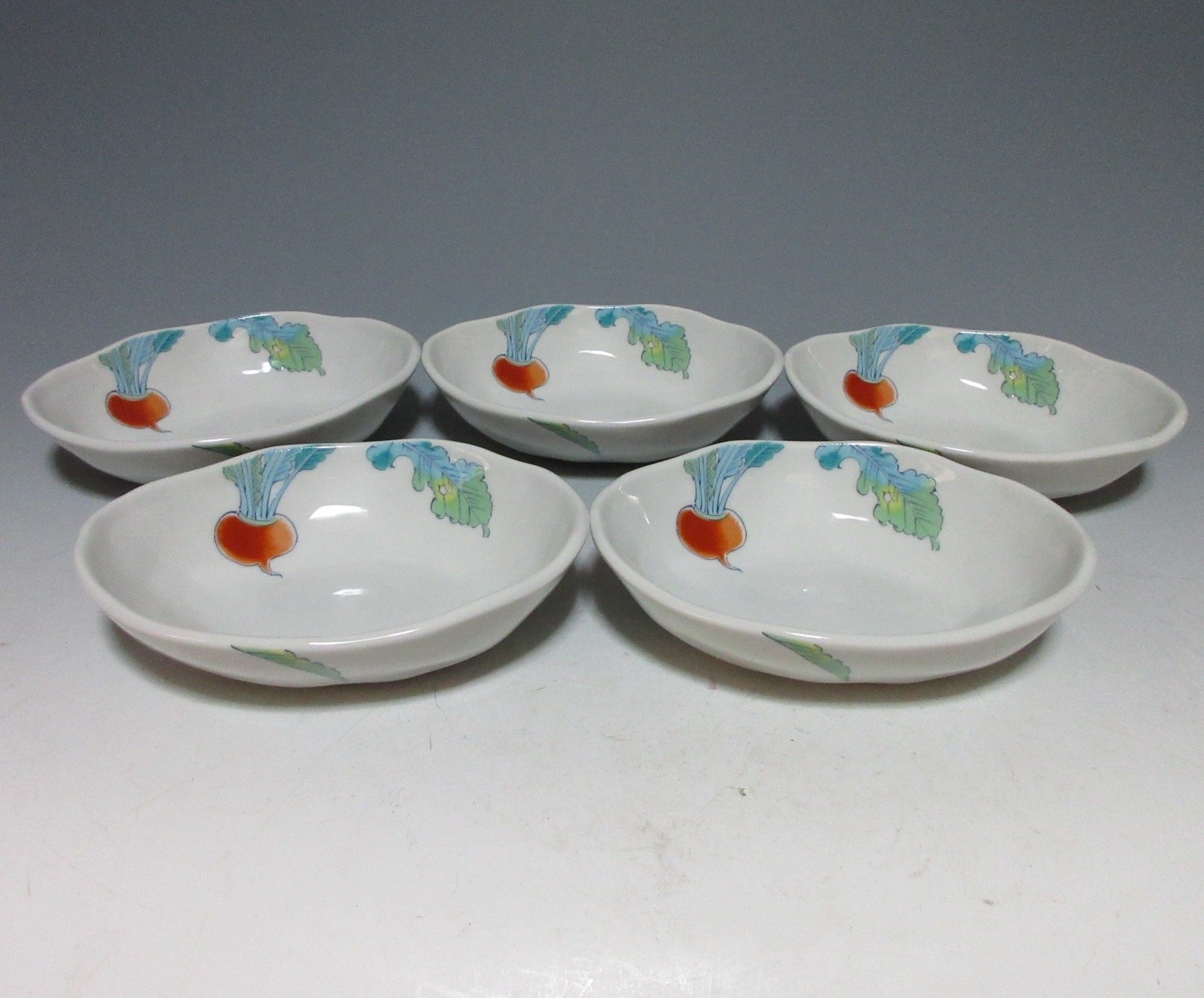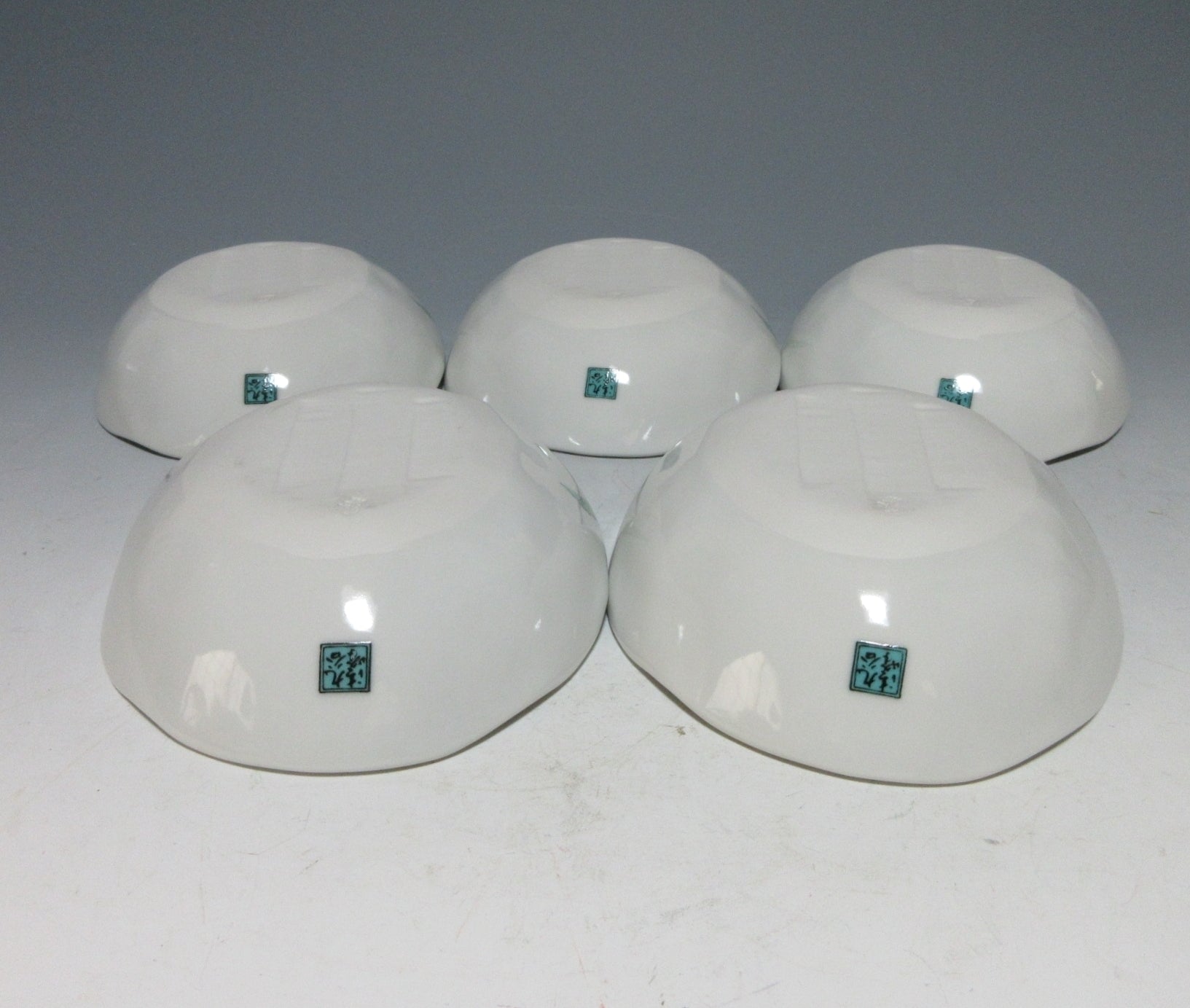 This listing is for a set of five Kutani-ware bowls. They are made of porcelain and each piece is decorated with a small red turnip over a milky white glazed base. Turnips are a popular pickling vegetable in Japan, and they’re also a common motif for tableware. This set is ideal for intended for serving tsukemono pickled vegetables, or small servings of sashimi. They would also be perfect for salad or fruit. The mark of the kiln can be found on the bottom, and they come with their original paper storage box.