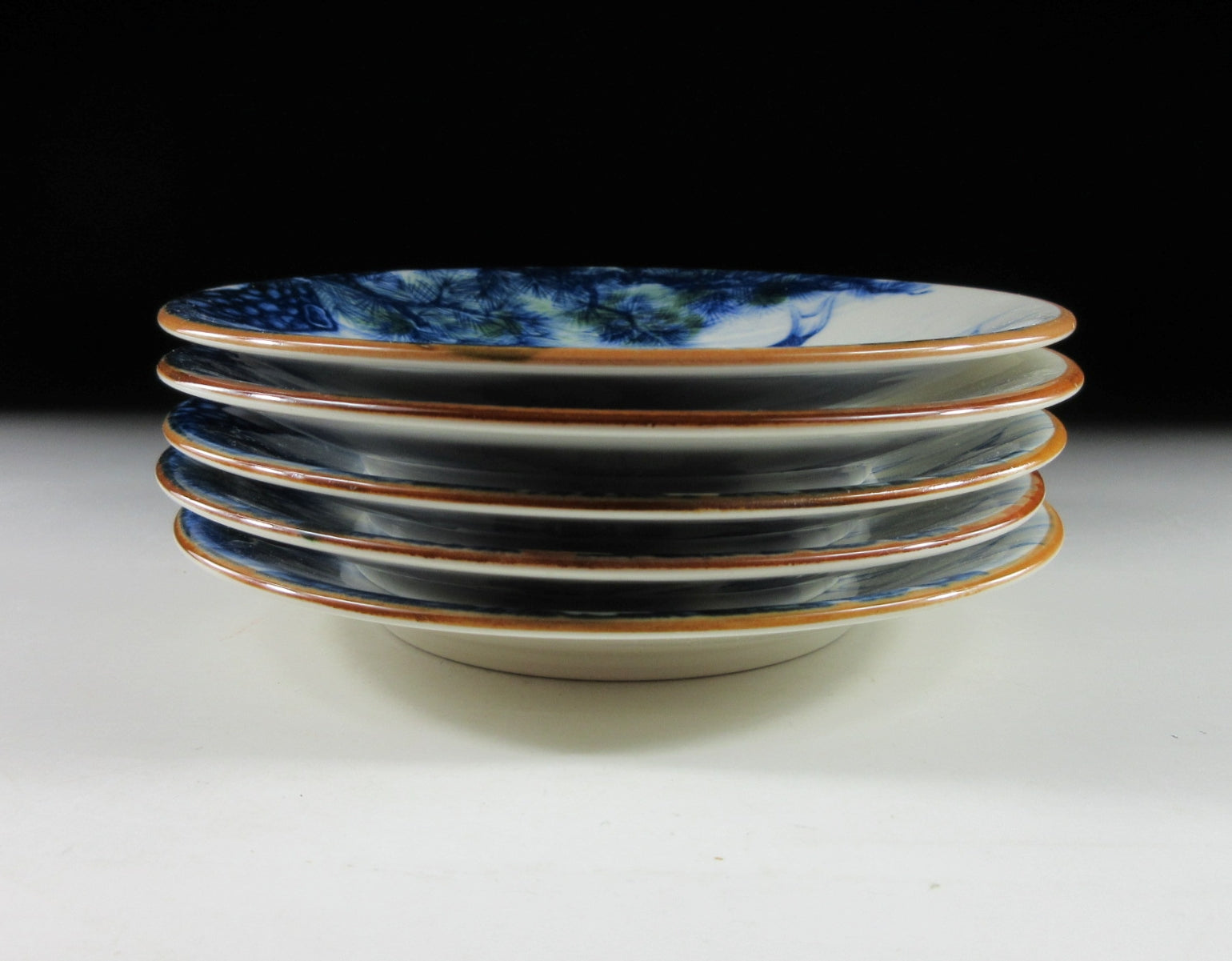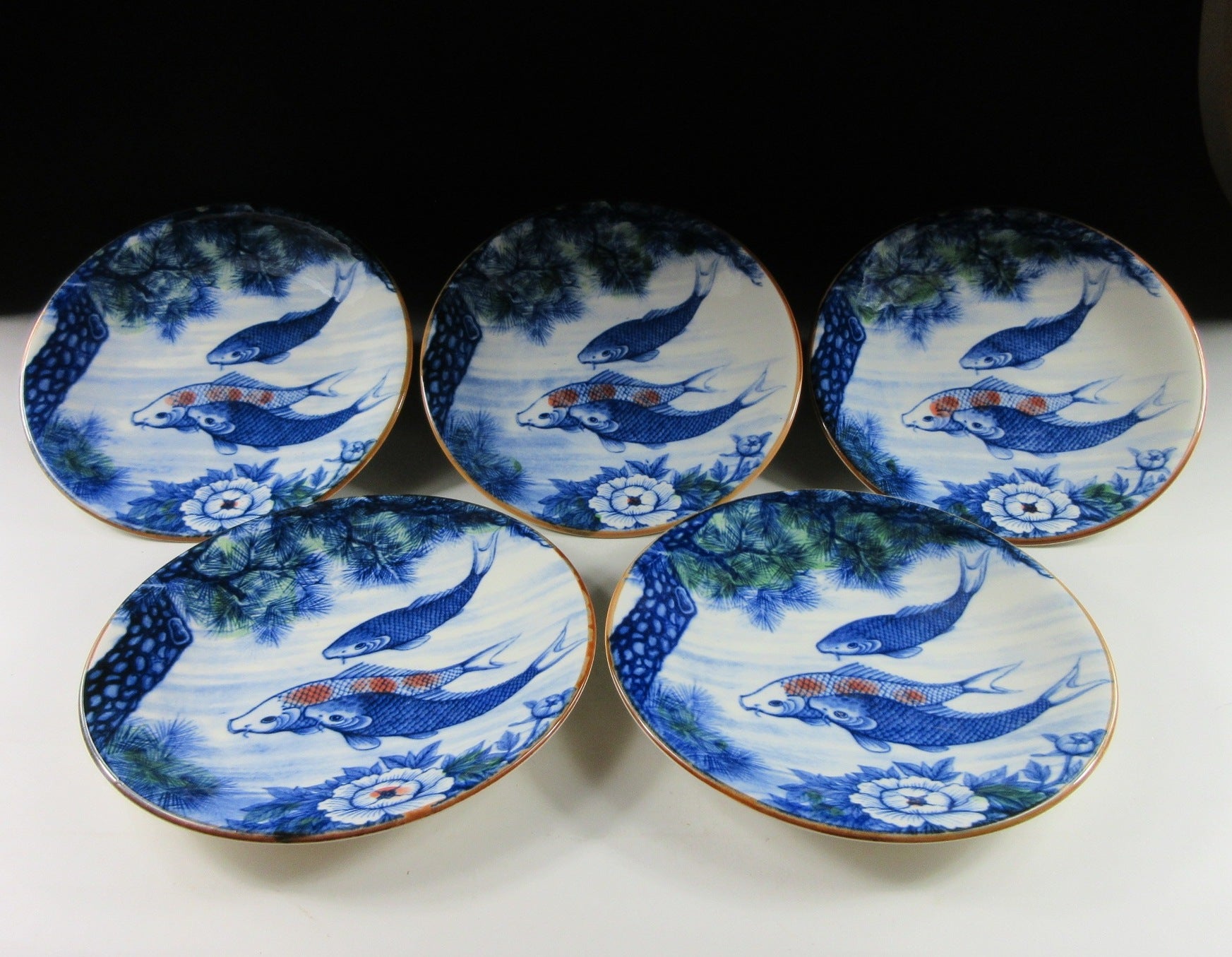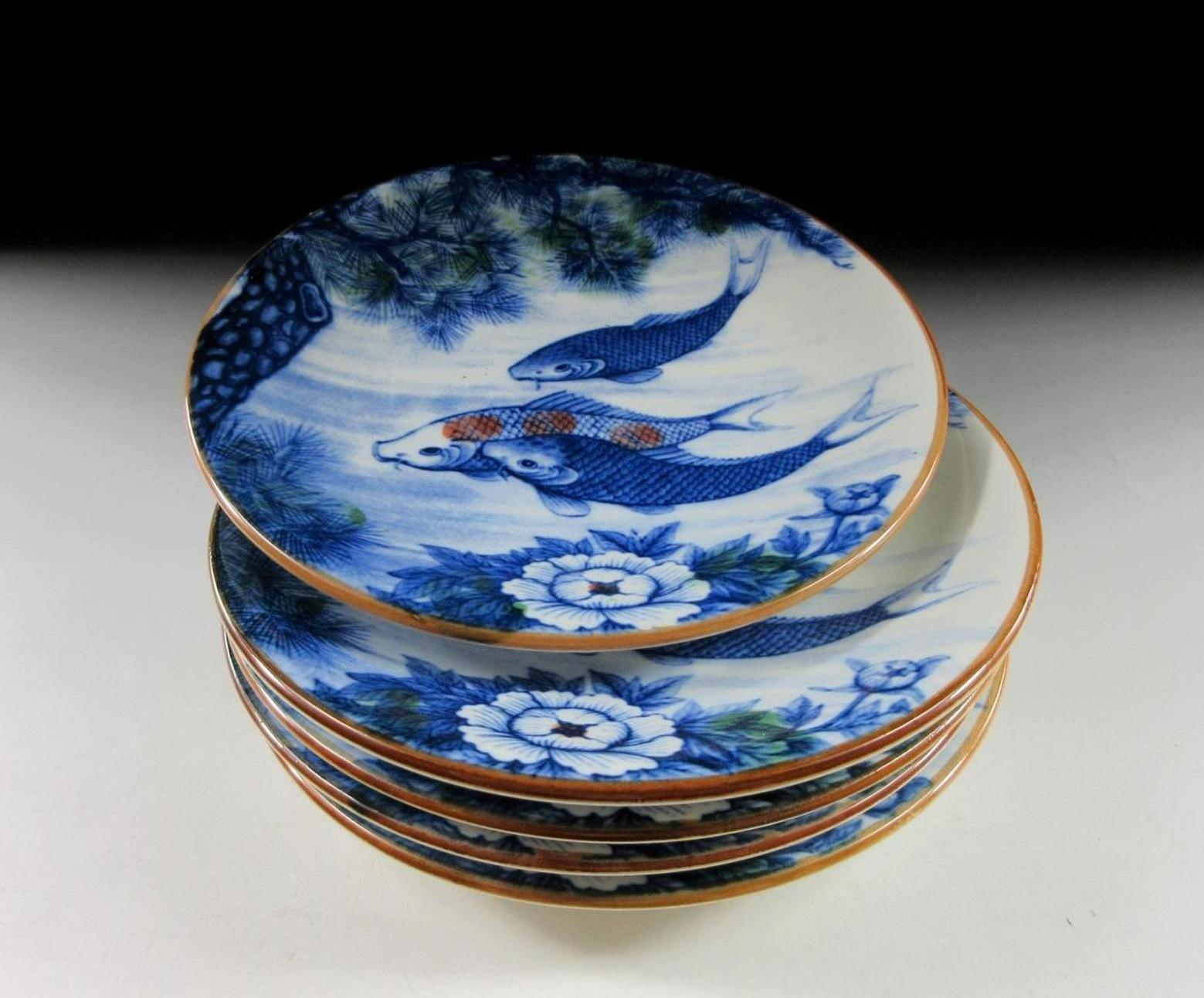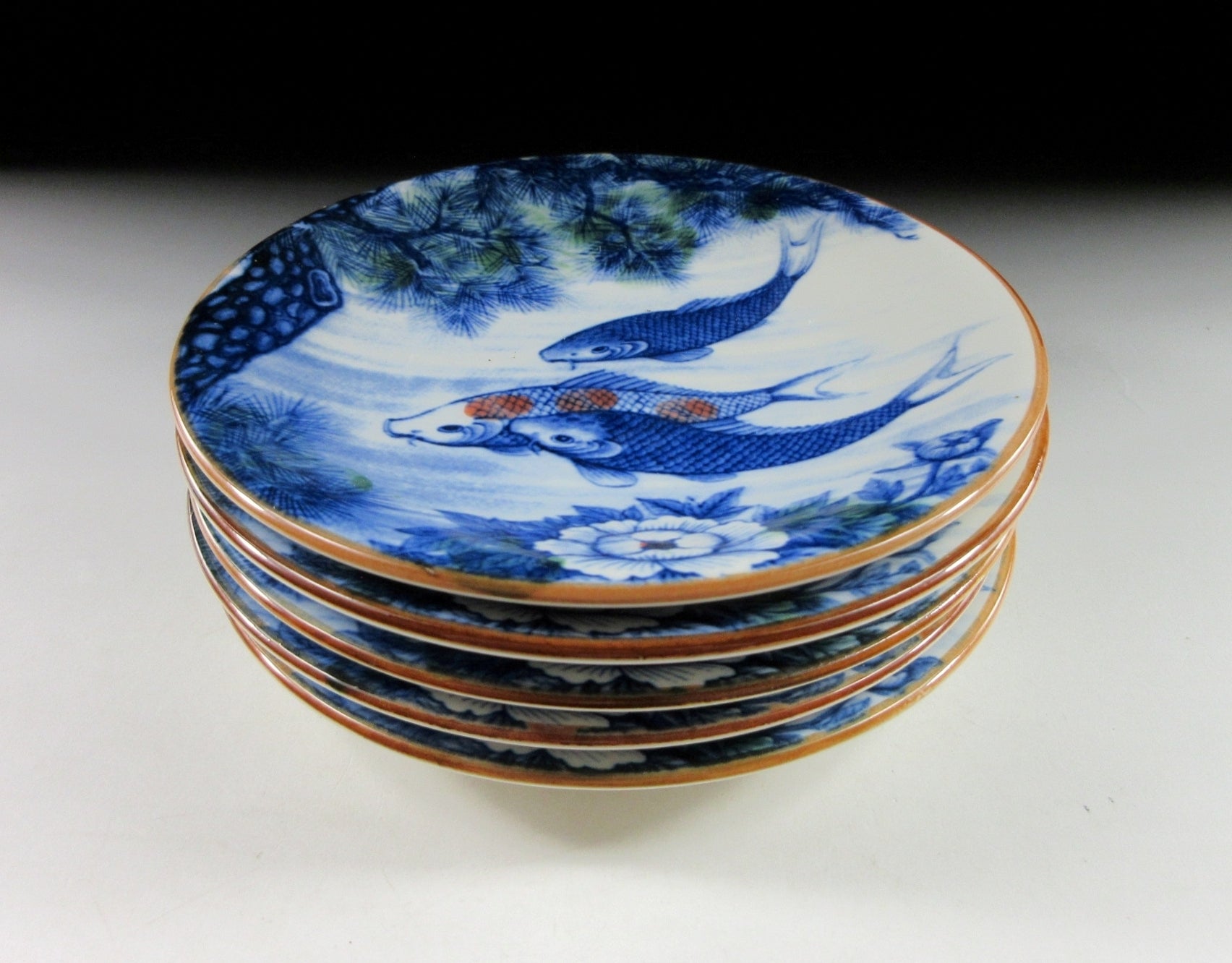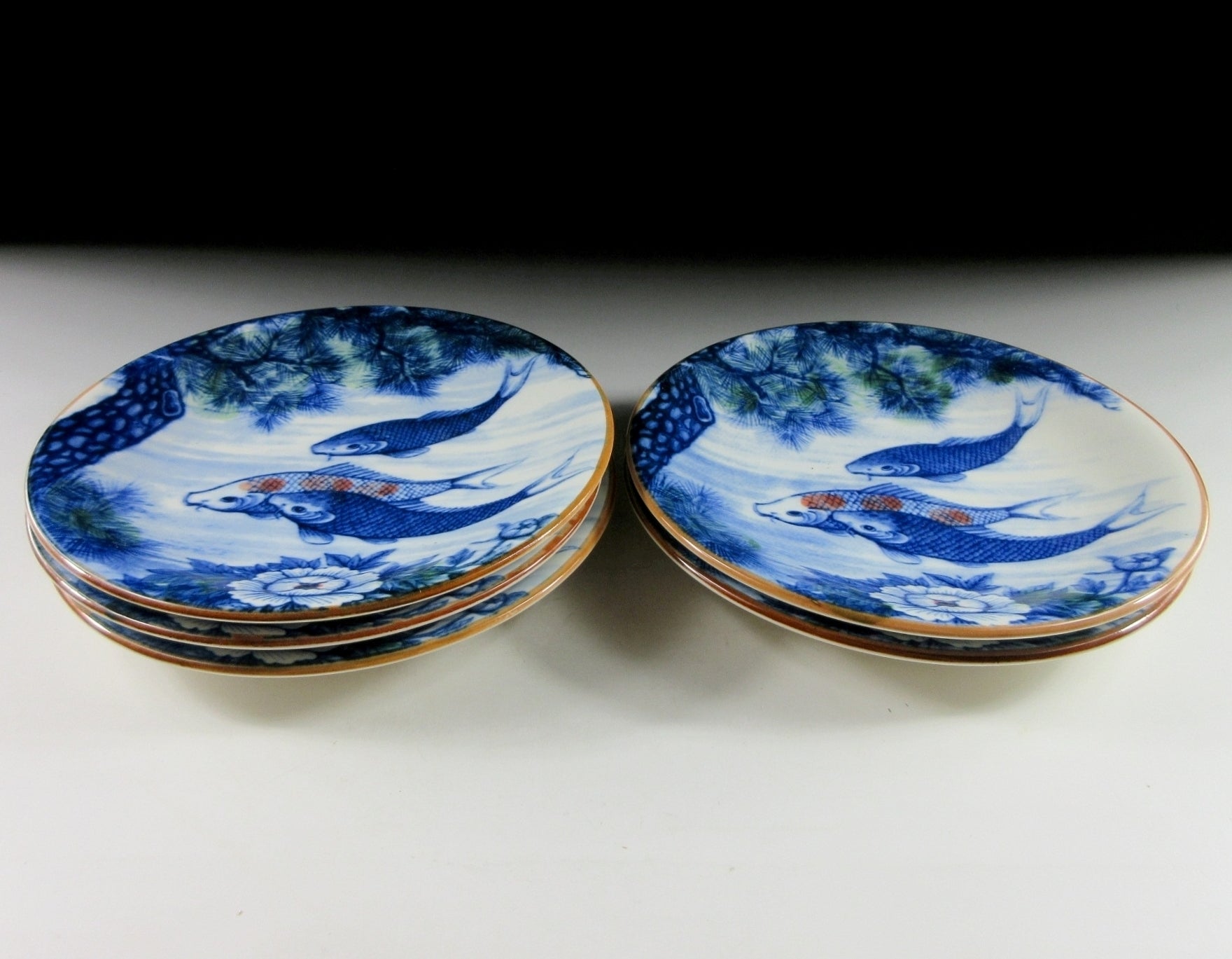 This listing is for a set of five small Mino-ware plates made around 20 years ago. The front is decorated with koi fish and they are white underneath. The koi were most likely created using a stencil or transfer, they are not hand painted. This particular set is suitable for serving sweets or sashimi, they would make lovely tea plates during the summer months.