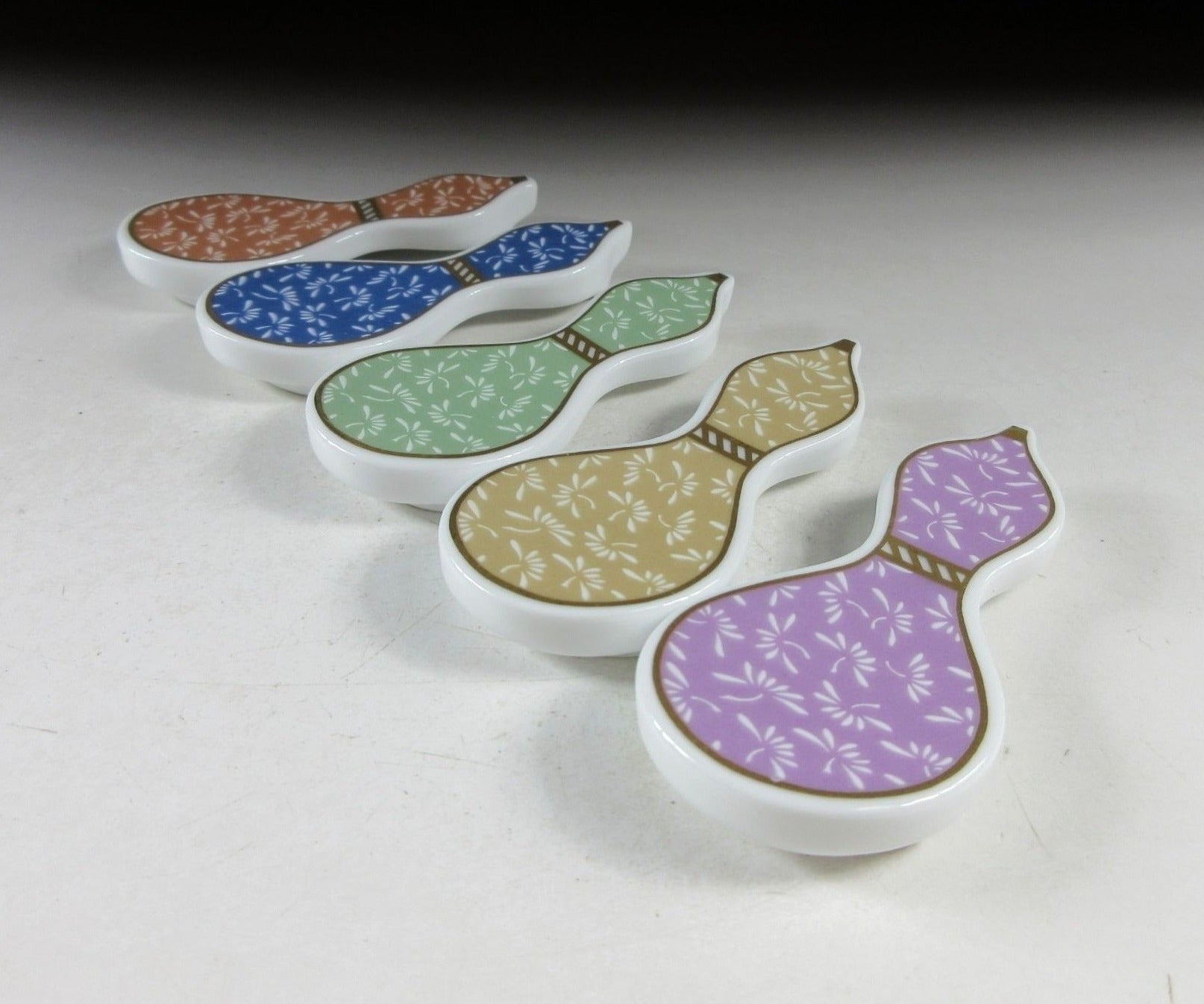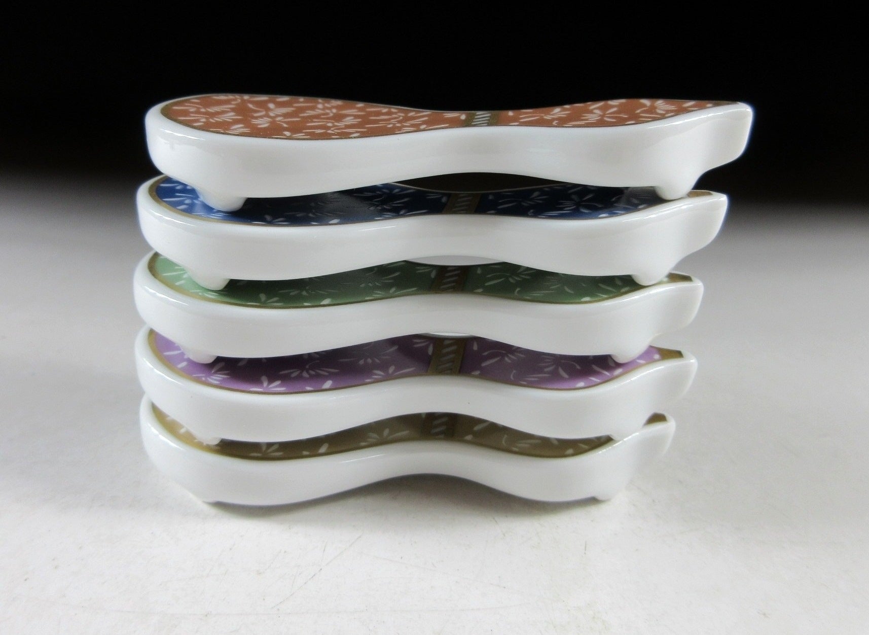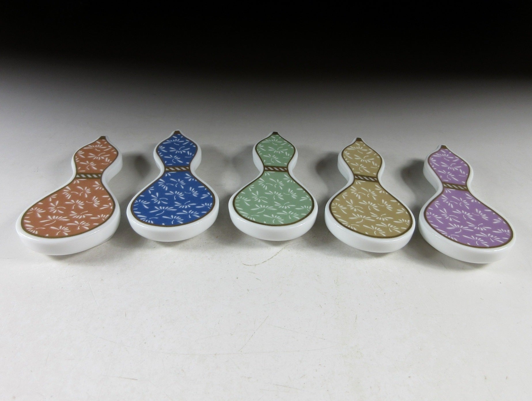 This listing is for a set of five Noritake hashioki chopstick rests made around 20 years ago. Each piece is moulded to resemble a gourd and features a stylised floral pattern. The gourd, or hyotan as it is known in Japanese, is an auspicious symbol linked to longevity and fertility. They are also thought to symbolize happiness and success, thus making them a popular motif during New Year.