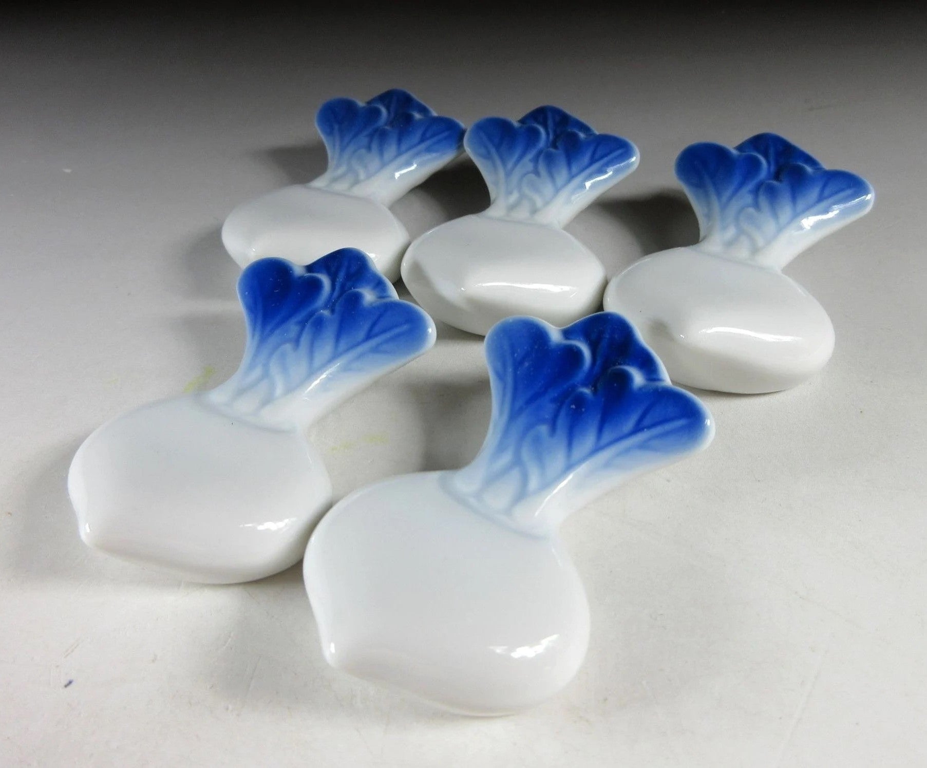 This listing is for a set of five Mino-ware hashioki chopstick rests. Each piece is moulded to resemble a plump radish with cobalt blue leaves on top. Radish is thought to symbolize perseverance and resilience because it is able to withstand the cold of winter, and it is eaten in various forms during New Year to bring health and longevity.